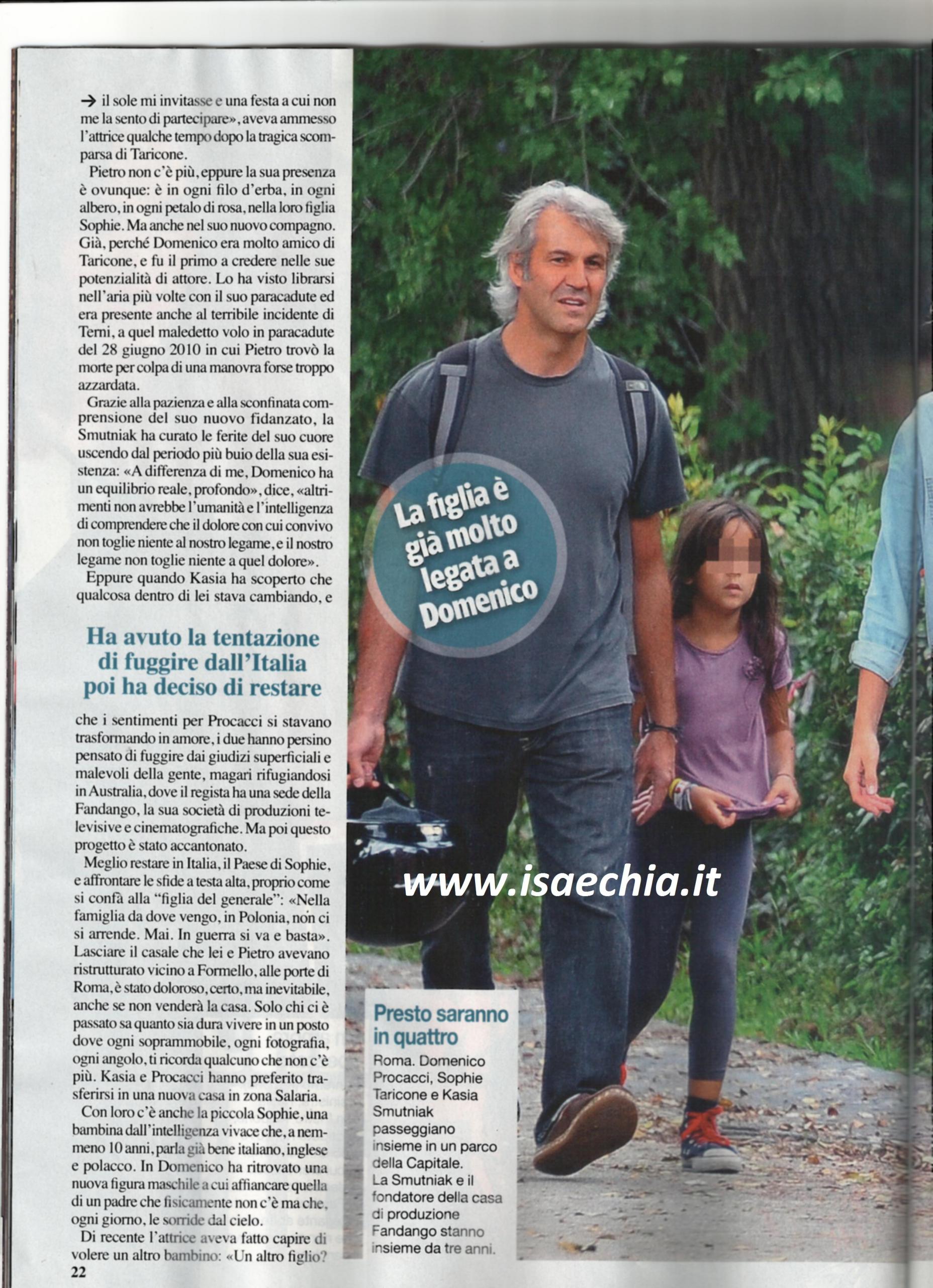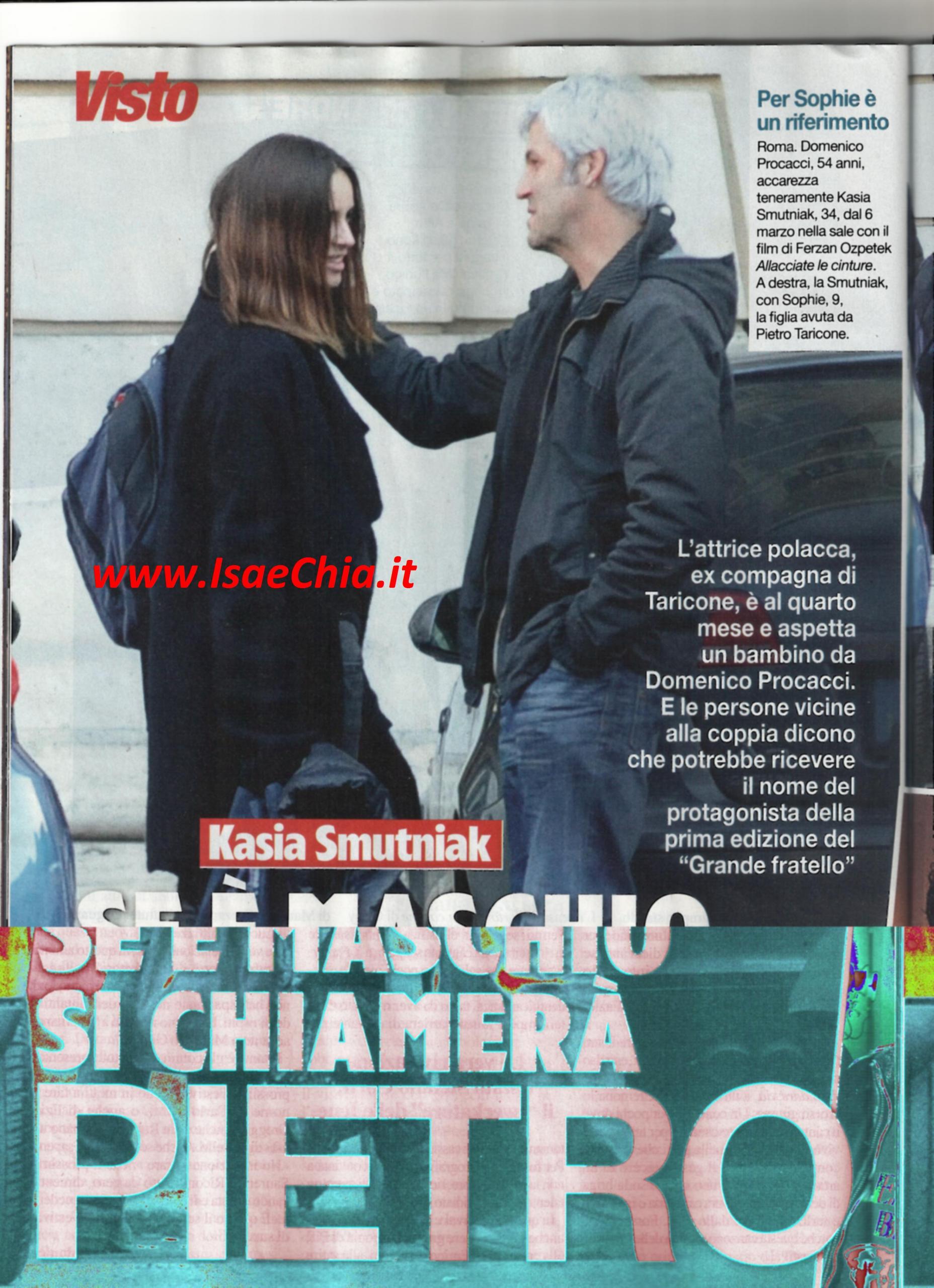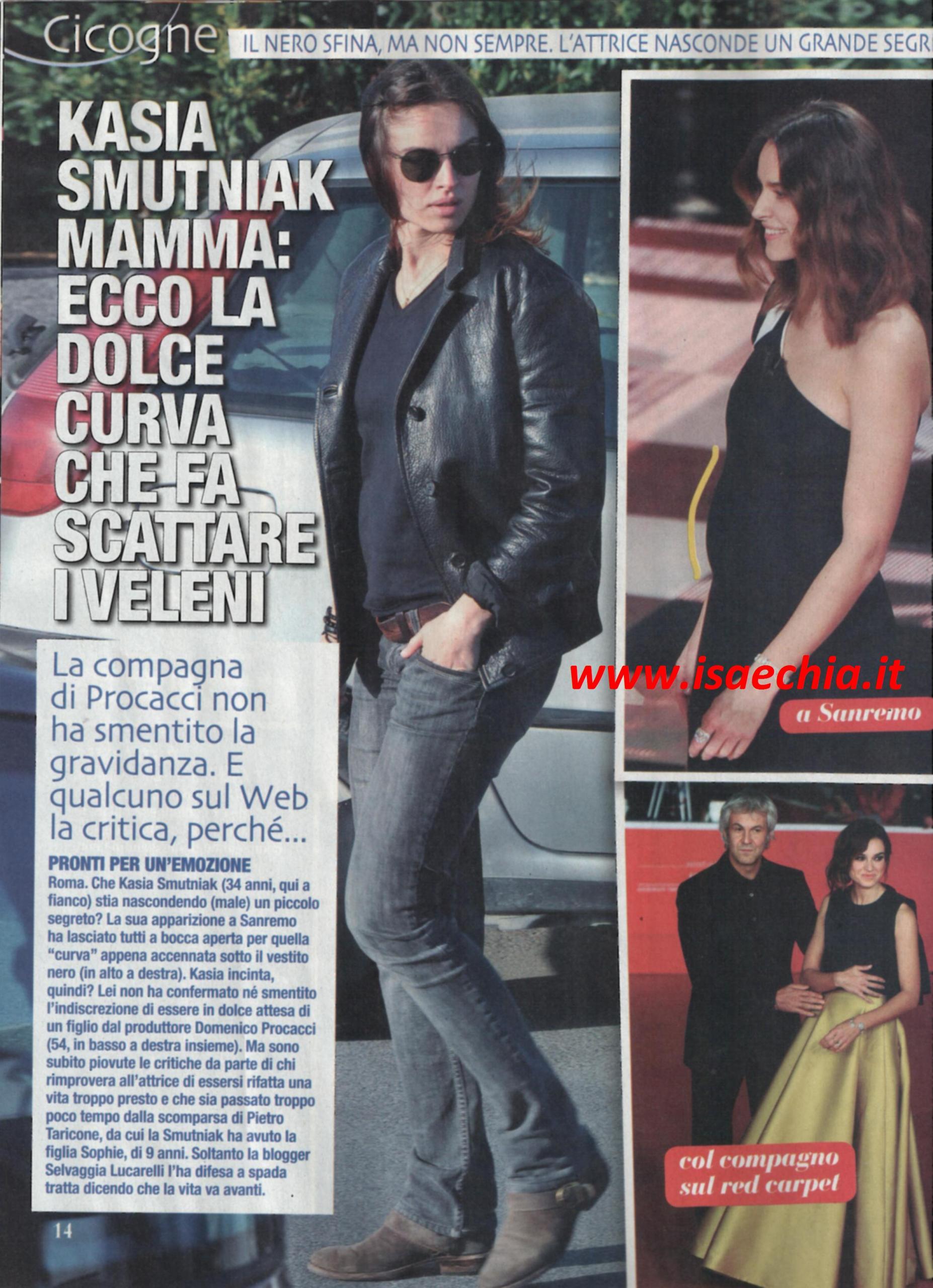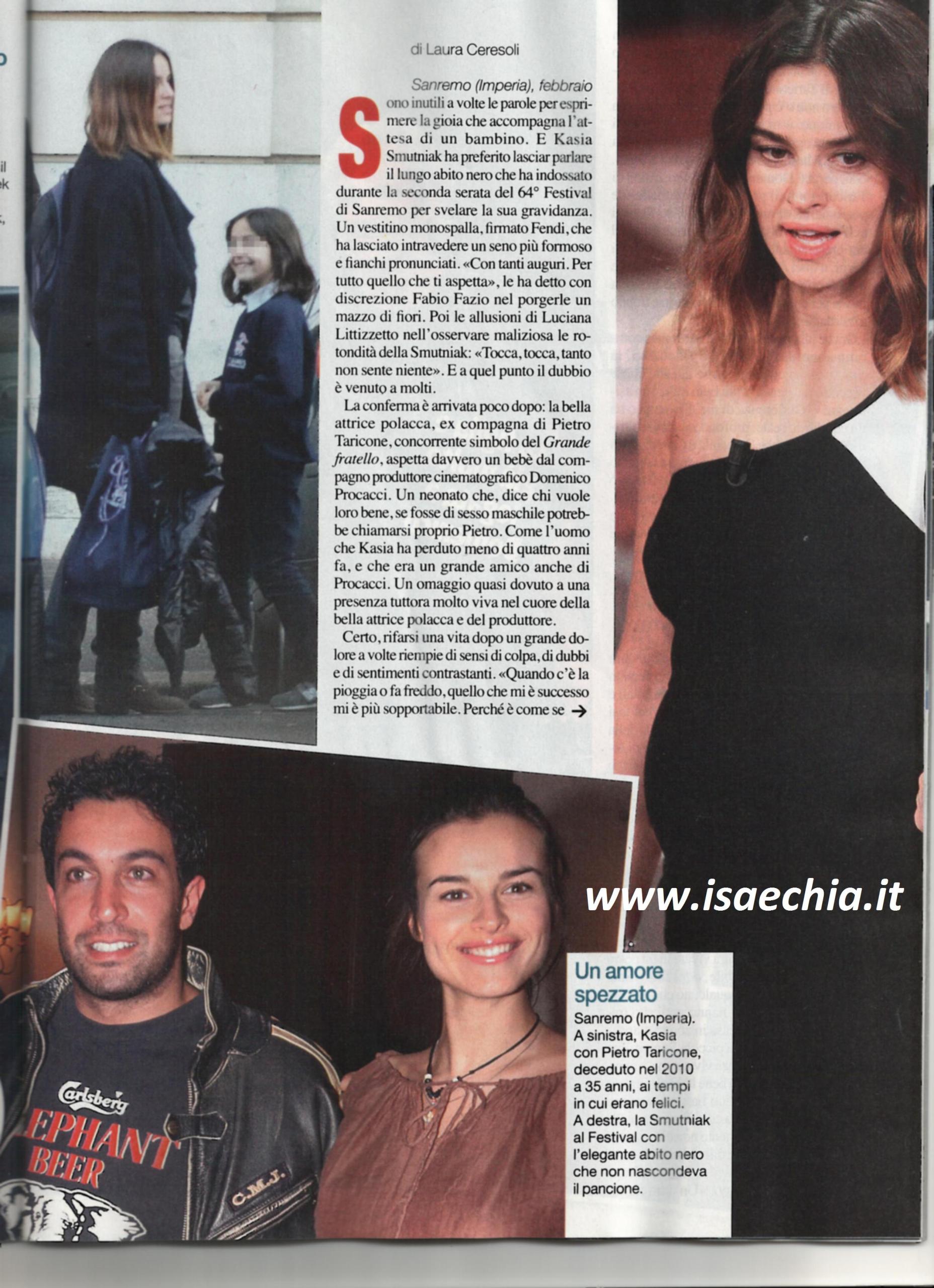 L’attrice Kasia Smutniak ha lasciato parlare il lungo abito nero che ha indossato in occasione del 64° Festival di Sanremo al posto suo per svelare la sua gravidanza. “Con tanti auguri per tutto quello che ti aspetta” sono state le parole di Fabio Fazio nel porgerle un mazzo di fiori. “Tocca, tocca, tanto non sente niente” ha detto invece Luciana Littizzetto. La conferma è arrivata solo dopo: l’attrice di origine polacca, vedova del concorrente del Grande fratello Pietro Taricone, aspetta davvero un bambino dal produttore cinematografico Domenico Procacci. E secondo coloro che sono vicini alla coppia, se fosse un maschietto, si chiamerà proprio Pietro, come il marito perduto quasi quattro anni fa, che era amico di Procacci. Quest’ultimo lo aveva visto anche librarsi col paracadute ed era presente quando ci fu l’incidente che ne ha causato la scomparsa ed è grazie alla sua pazienza che lei ha superato il momento: “A differenza di me, Domenico ha un equilibrio reale, profondo, altrimenti non avrebbe l’intelligenza di comprendere che il dolore con cui convivo non toglie niente al nostro legame”. La Smutniak ha lasciato il casale dove viveva con Taricone e la figlia Sophie, anche se abbandonare il posto dove ogni cosa e ogni angolo le ricordava lui non deve esser stato facile, e ha preso casa in zona Salaria con Procacci. E sulla possibilità di avere un altro figlio aveva dichiarato: “Perché no? Sono figlia unica ed ho sempre pensato che non fosse il massimo”. Circa la nuova gravidanza, ha detto: “Finalmente ho il seno. Non mi hanno fatto fare 007 perché sono senza tette! Ma ho deciso di rinunciare agli sport estremi”.