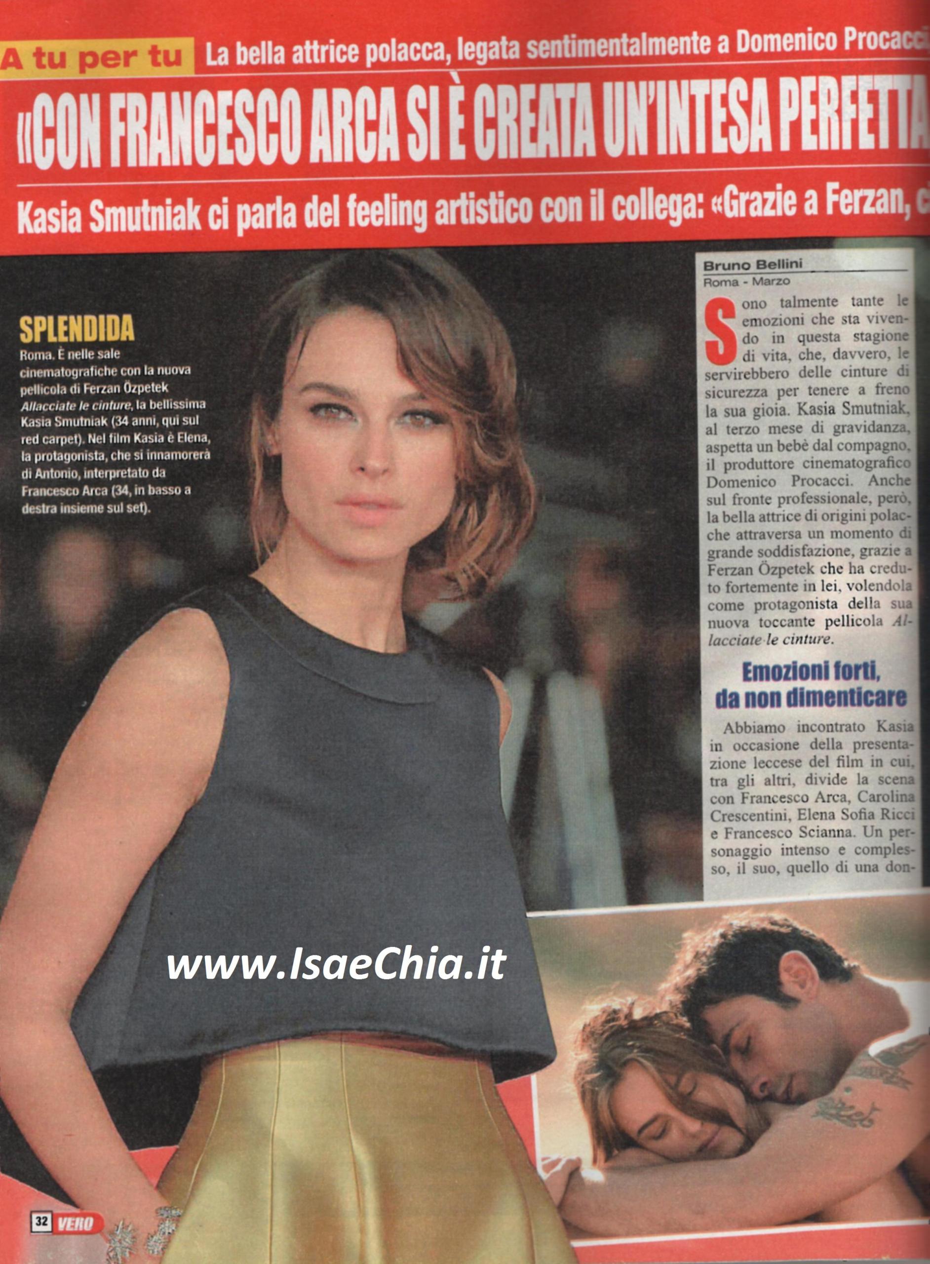Secondo le voci, l’attrice Kasia Smutniak sarebbe al terzo mese di gravidanza, in attesa di un figlio dal compagno Domenico Procacci. Dal punto di vista professionale, invece, ha lavorato al fianco di Francesco Arca sul set del film Allacciate le cinture, con la regia di Ferzan Ozpetek: “Lavorare con Ozpetek è stata un’esperienza unica, fortissima, di quelle che non dimentichi. Ha la capacità di unire tutti gli attori: tutti si rendono disponibili e si ha la possibilità di conoscersi prima delle riprese. Ci siamo seduti a tavola, abbiamo bevuto e scherzato e sul set eravamo già un gruppo unito. Quando giri alcune scene così intense, escono in modo molto naturale. Questo è avvenuto anche con Francesco Arca, soprattutto nella seconda parte, dove non c’era più bisogno di dirci nulla. Aver interpretato una donna con grandi sofferenze è stata un’esperienza fortissima. Un ruolo così, può aggiungere una vita in più. Per me ogni film ha una storia e ogni volta vivo una vita diversa. Ci sono pochi ruoli femminili interessanti; Ferzan, invece, per ognuno scrive qualcosa d’interessante e un ruolo ad hoc. Si tratta di ruoli particolari, pieni di umanità: ecco perché gli attori corrono quando chiama. Dopo le riprese, mi sono fermata per alcuni mesi. Spero di riuscire a raccontare, nel prossimo film, qualcosa di nuovo”.