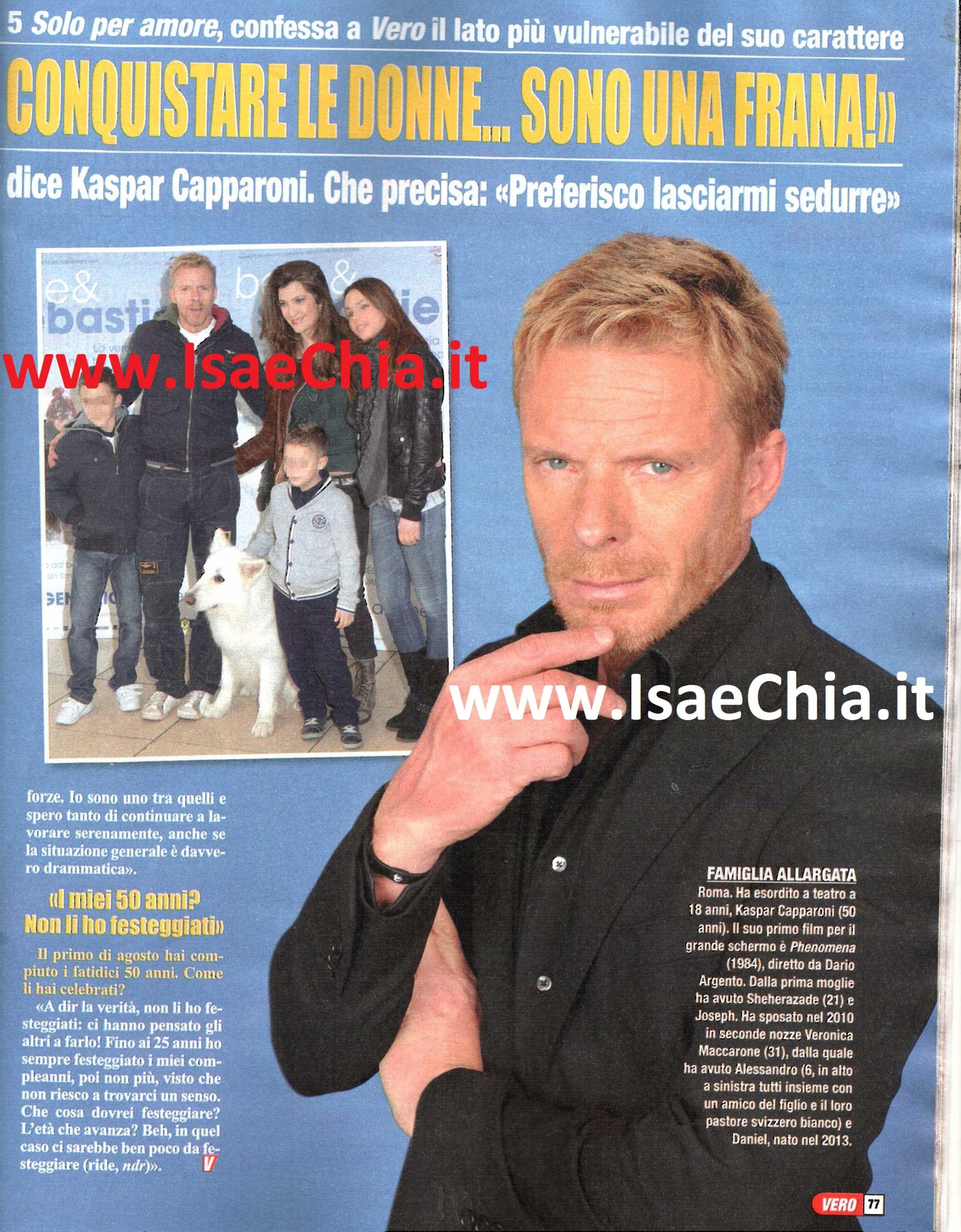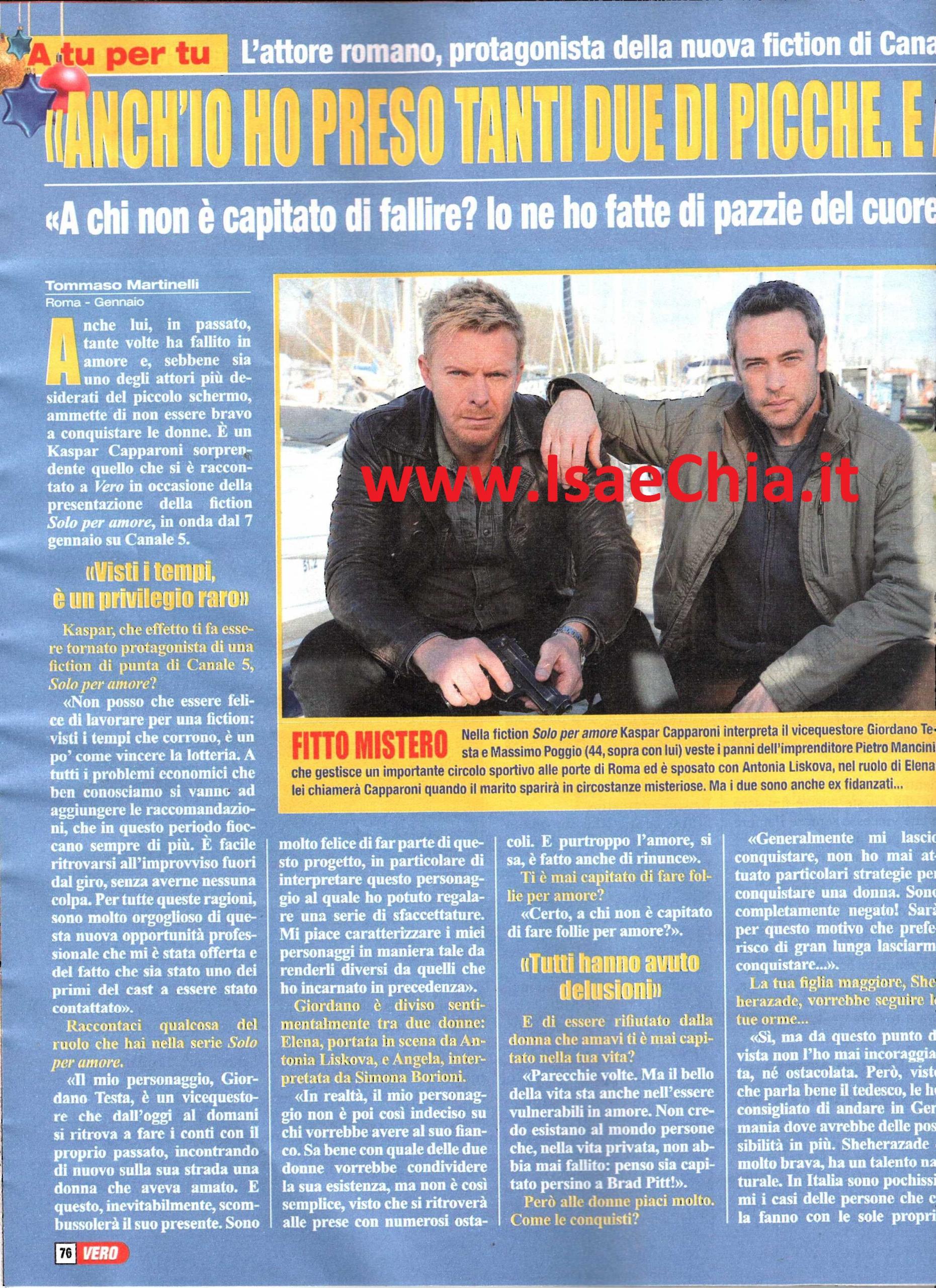 L’attore Kaspar Capparoni sta per tornare sul piccolo schermo con un importante ruolo nella nuova fiction di Canale 5, Solo per amore: “Non posso che essere felice di lavorare in questa fiction: coi tempi che corrono, è come vincere alla lotteria. E’ facile ritrovarsi fuori dal giro senza sapere neanche il perché. Il mio personaggio, Giordano Testa, è un vicequestore che si ritrova a fare i conti col proprio passato, incontrando una donna che aveva amato. Sono molto felice di partecipare a questo progetto e in particolare di aver interpretato questo personaggio, al quale ho dato molte sfaccettature: mi piace caratterizzare i miei personaggi in modo tale da renderli diversi da quelli interpretati in precedenza. Giordano sembra diviso tra Elena Ferrante (interpretata da Antonia Liskova) e Angela (interpretata da Simona Borioni), ma in realtà sa chi ha scelto il suo cuore. Solo che non è così semplice, dato che si ritroverà a dover affrontare molti ostacoli. E purtroppo l’amore è fatto anche di rinunce“. Così, quando gli si chiede se gli è capitato di fare follie per amore o di essere rifiutato, risponde: “Certo, a chi non è capitato? Ma il bello della vita è essere anche vulnerabili in amore. Non credo esistano persone che nella vita privata non abbiano mai fallito, nemmeno Brad Pitt! In genere, mi lascio conquistare: non seguo delle strategie, sono completamente negato!“. Parlando invece di sua figlia Sheherazade, che vorrebbe seguire le sue orme, dichiara: “Non l’ho mai incoraggiata, né ostacolata. Però, dato che parla tedesco, le ho consigliato di andare in Germania, dove avrebbe qualche possibilità in più: è brava, ha un talento naturale, ma in Italia la situazione è drammatica!“.