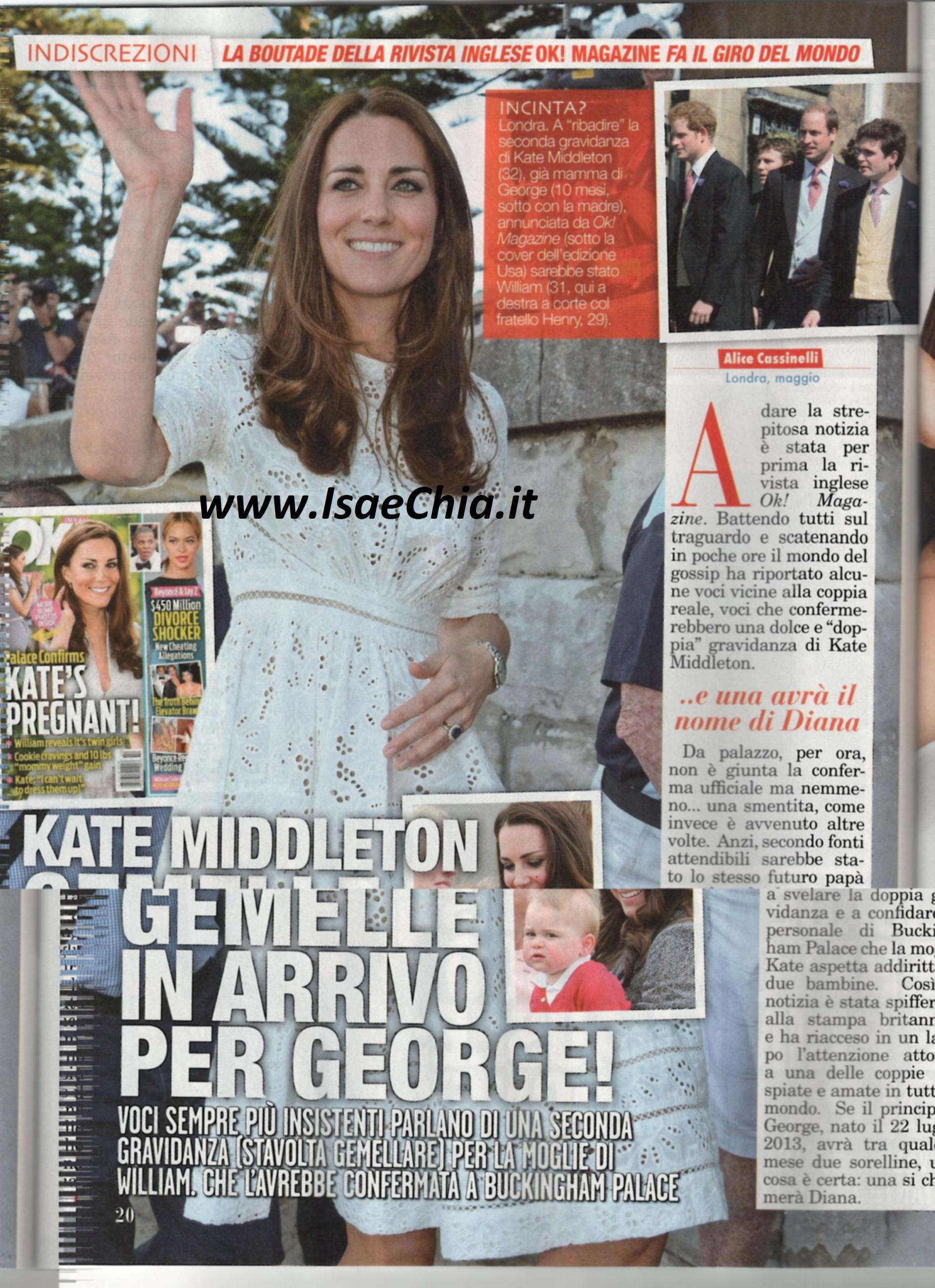 E da Oltremanica arriva anche la notizia di un’altra possibile gravidanza: si tratta di Kate Middleton, moglie del Principe William d’Inghilterra. Secondo la rivista OK! Magazine, la principessa sarebbe incinta di ben due gemelli. Da Buckingham Palace non è ancora giunta la smentita (come è successo altre volte) e anzi, secondo le voci, il papà avrebbe rivelato che per il piccolo George arriveranno addirittura due sorelline!
