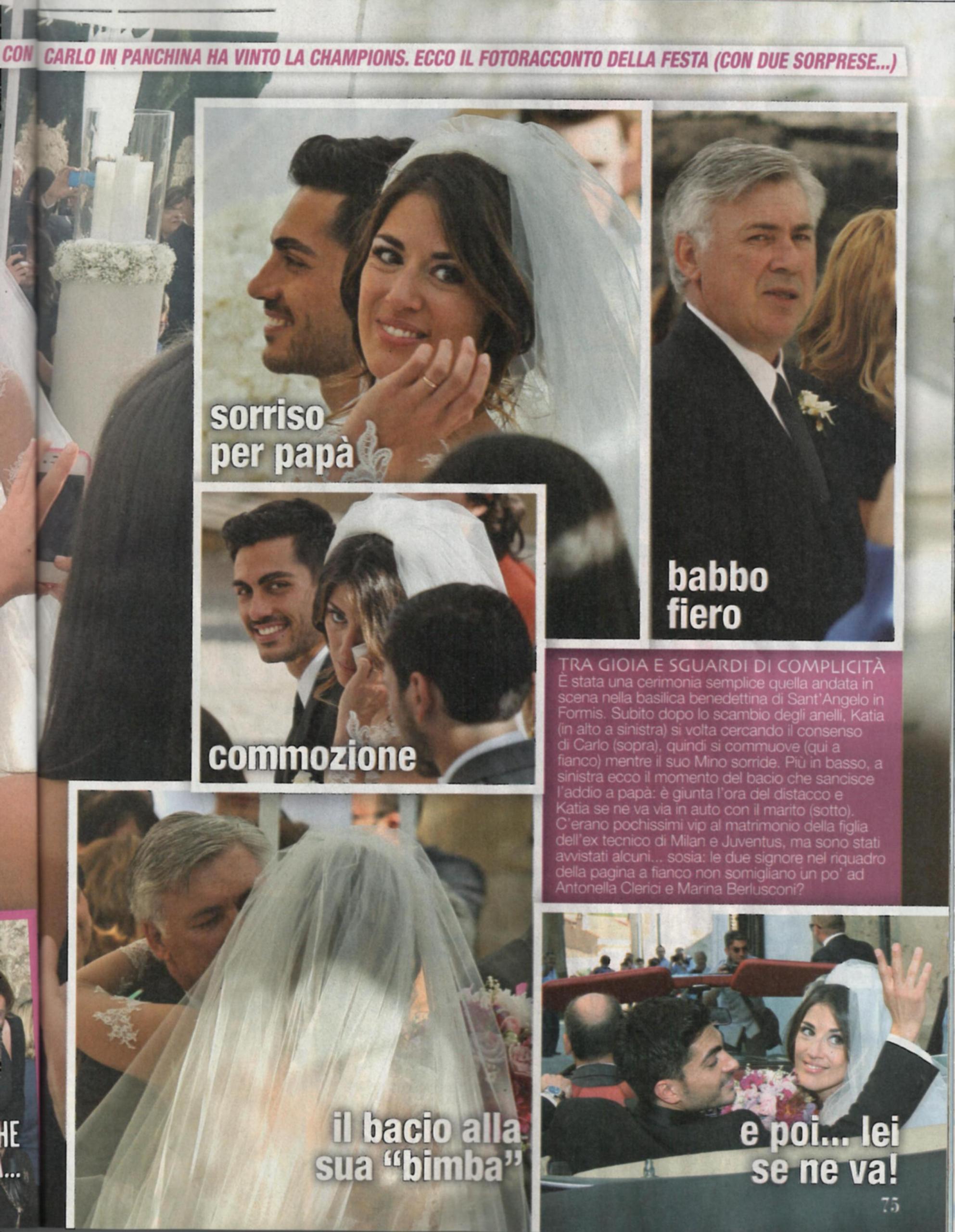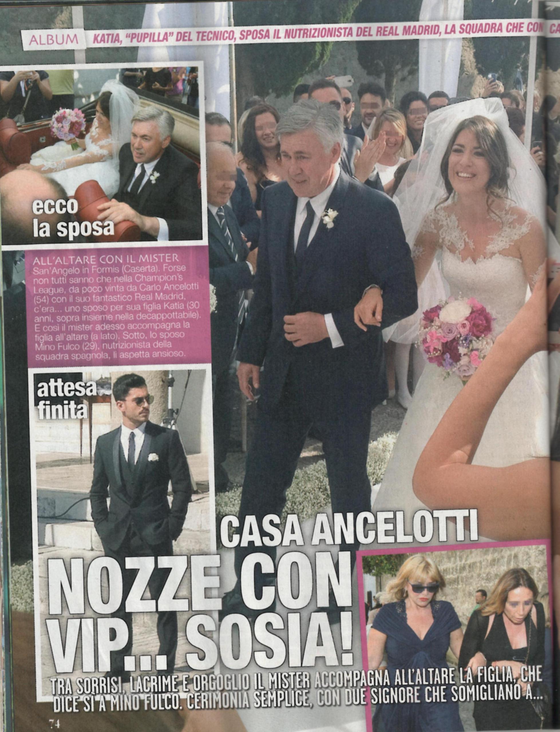 Forse non saranno in molti a ricordarla, ma Katia Ancelotti, figlia dell’allenatore di calcio Carlo Ancelotti, era tra le cantanti concorrenti della terza edizione di Amici (per intenderci, quella vinta dal ballerino Leon Cino), anche se non ha raggiunto la fase finale. Adesso Katia è cresciuta ed è cambiata e pochi giorni fa ha celebrato le sue nozze. Così, il padre, dopo aver festeggiato la vittoria della squadra che allena, il Real Madrid, ha accompagnato la figlia trentenne all’altare, dove ad attenderla c’era il marito Mino Fulco, che è anche il nutrizionista della squadra. La cerimonia, che ha avuto luogo nella basilica benedettina di Sant’Angelo in Formis (Caserta) è stata semplice. Dopo lo scambio degli anelli, Katia ha cercato con lo sguardo il padre ottenendone il consenso; in seguito si commuove (come mostrano le foto), mentre il suo Mino sorride. Poi il bacio che sancisce l’addio dal papà, prima di andare via in auto col neo-sposo. Alla cerimonia c’erano pochissimi vip, ma una curiosità ci ha colpito: due signore che sembrano proprio le sosia di Antonella Clerici e Marina Berlusconi!