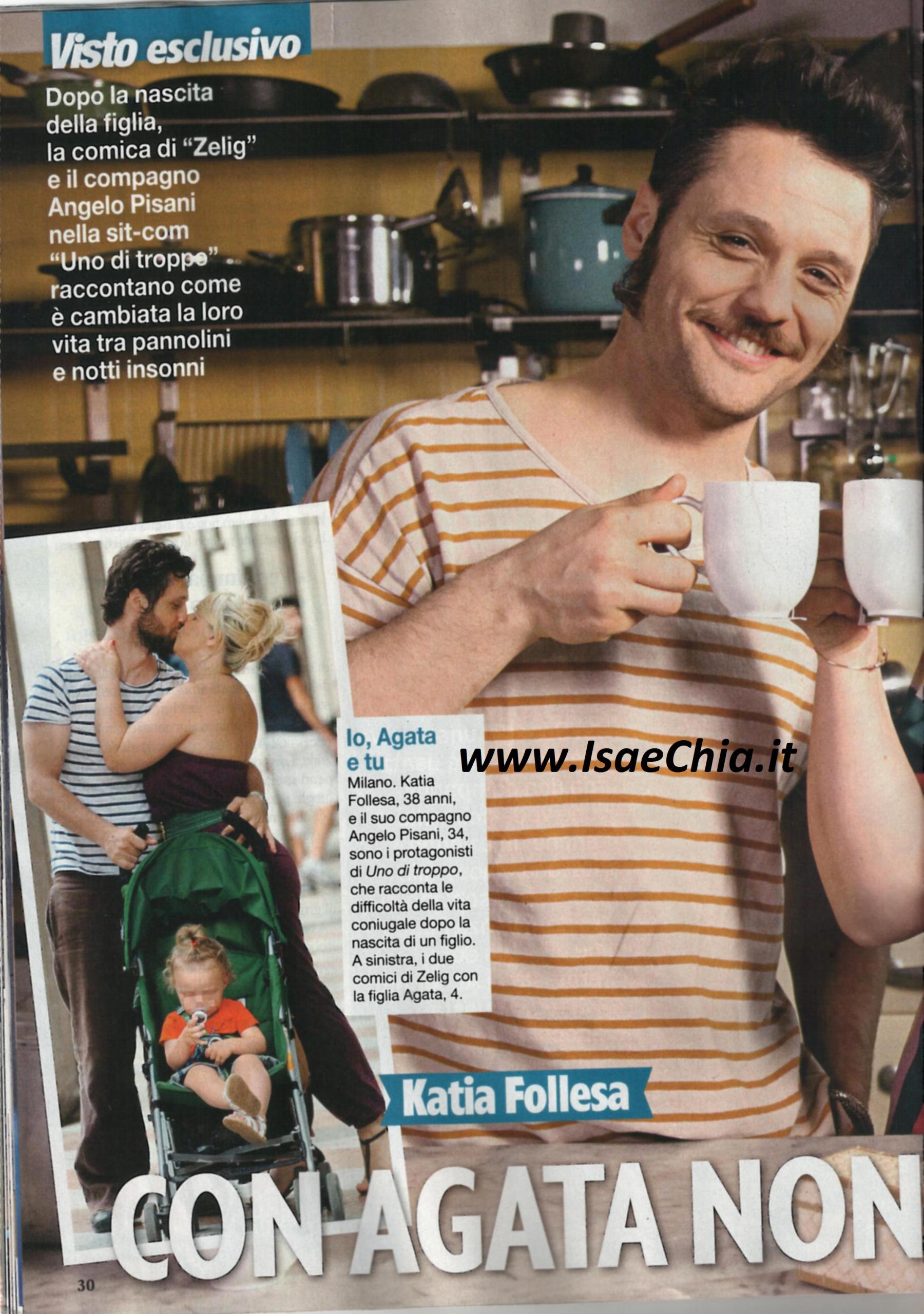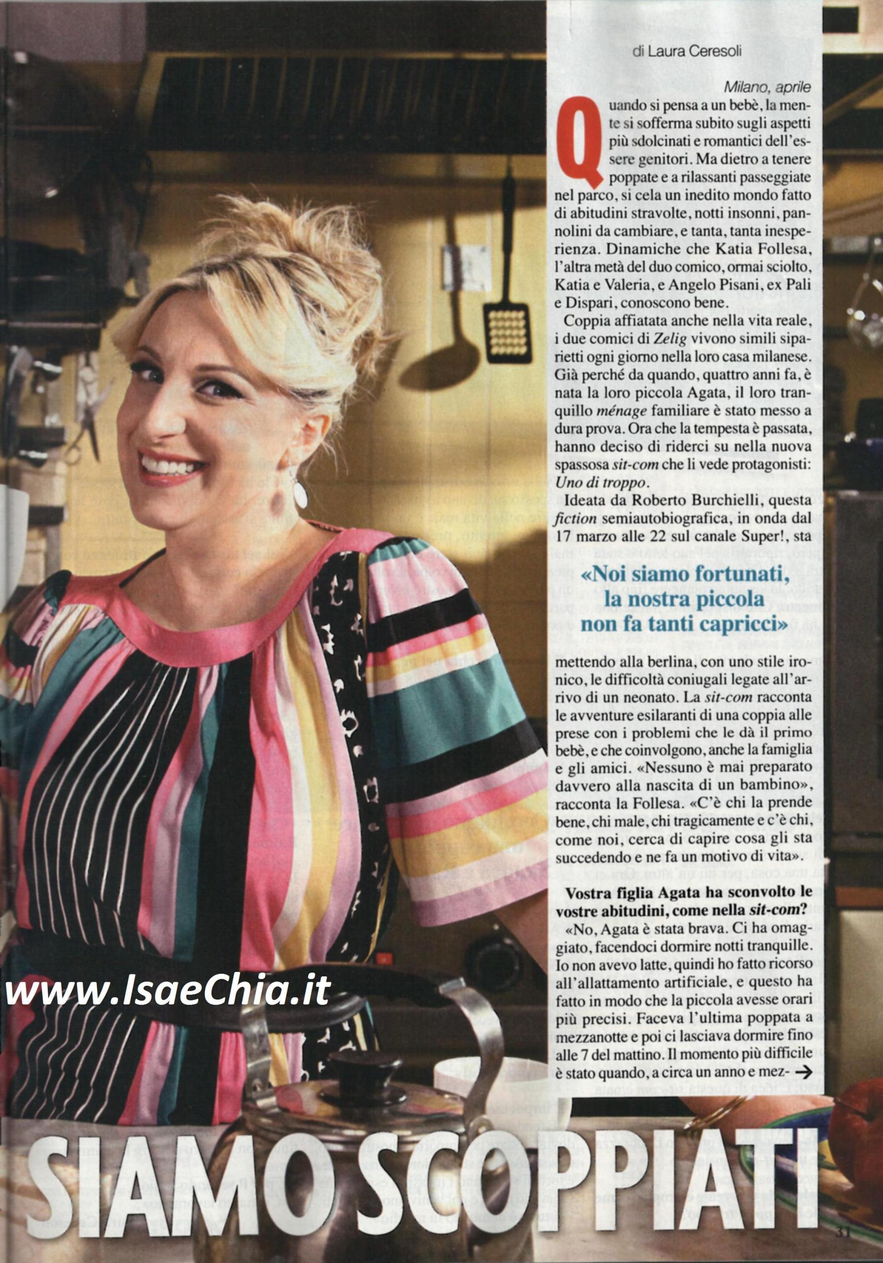 Katia Follesa era parte del duo Katia e Valeria, mentre Angelo Pisani faceva parte dei Pali e Dispari. I due si sono conosciuti a Zelig e la coppia più stabile l’hanno formata loro. E ora diventano anche una sit-com, in cui raccontano una coppia alle prese con il loro bebé, come nella vita reale: “Nessuno è mai davvero preparato alla nascita di un bambino. Nostra figlia Agata non ci ha mandati in crisi, ci ha fatto dormire notti tranquille. Il momento più difficile è stato quando a un anno e mezzo, quando ha avuto una febbre difficilissima, l’abbiamo portata nel letto con noi: riportarla nel suo letto è stata una tragedia. Abbiamo applicato il metodo “la lasciamo piangere fino allo sfinimento”, ci è dispiaciuto ma ha funzionato. Con un bambino ti ritrovi un estraneo in casa da accudire, mentre prima c’eri solo tu, ma ora io e Angelo ne faremmo altri mille. Tra noi non c’è stato conflitto, ma smarrimento e disaccordo su cosa fosse giusto. In Uno di troppo è tutto un po’ esagerato, ad esempio indossiamo un giubbino per paura che il bambino ci vomiti addosso! Angelo è giocherellone e distratto, mentre in realtà è un padre attento. Io nella fiction sono esasperata, una madre perfettina che in realtà non sono. Le suocere, invece, sono state scelte simili a quelle reali, anche se mia madre non è così rigida e altezzosa. L’aiuto dei nonni è fondamentale, ma loro si sentivano esperti di tutto e noi abbiamo dovuto lottare per imporre il nostro punto di vista. Paradossalmente, ora che abbiamo Agata usciamo più spesso perché i nostri amici storici hanno avuto anche loro dei figli, e quindi si tengono compagnia. Quando abbiamo finito di girare la sit-com, Angelo ha detto: “Domani non ti voglio vedere tutto il giorno!” perché siamo stati insieme a casa e sul lavoro. Però sul set è stata una risata continua e c’erano scene in cui ci arrivavano acqua e torte in faccia”. Infine, quando le si chiede di un altro figlio, risponde: “Ci stiamo lavorando…”