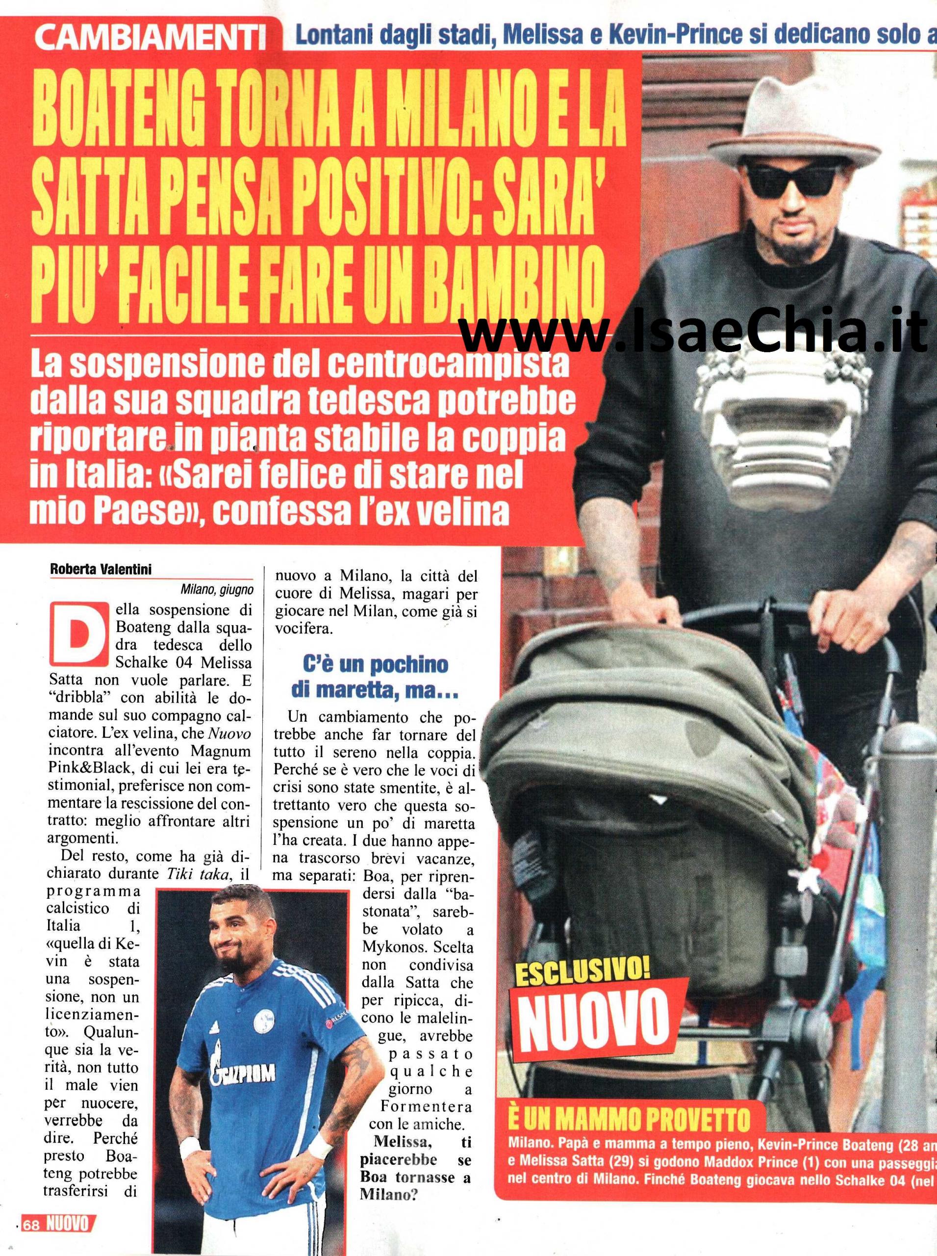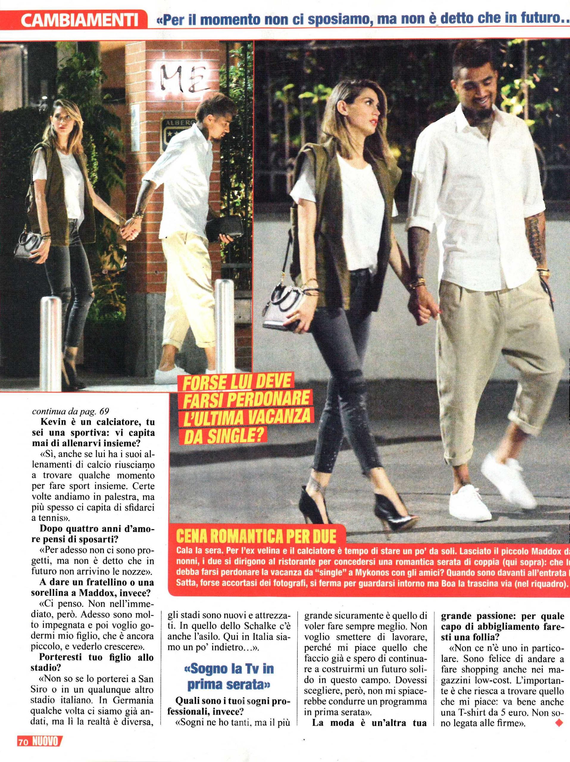 Il calciatore Kevin Prince Boateng è stato sospeso dalla squadra tedesco per cui ha giocato finora, lo Shalke o4, ma durante il programma calcistico Tiki taka la sua compagna Melissa Satta ha precisato: “Quella di Kevin è stata una sospensione, non un licenziamento“. Ospite dell’evento Magnum Pink&Black, quando le si chiede di più sul fidanzato calciatore, l’ex Velina resta vaga, ma rivela che non le dispiacerebbe se lui tornasse a Milano: “Milano è casa mia, lo è sempre stata ed è la città che prediligo. Se il mio compagno dovesse trovare lavoro qui, sarei molto contenta di tornarci in maniera definitiva. Negli ultimi tempi ero qui solo durante i fine settimana. Se poi gli arriverà un’offerta in un’altra città, andrà bene lo stesso. Il nostro è un lavoro che ci porta a girare e io sono felice solo insieme alla mia famiglia“.E, a proposito di famiglia la bella sarda racconta la sua vita da quando è mamma: “La giornata è molto più che impegnativa. E poi, ora che Maddox ha un anno, comincia a camminare e bisogna sempre corrergli dietro. Diciamo che è lui il mio allenamento quotidiano. Oltre a quello, cerco di fare sport, perché il movimento mi fa stare bene. A volte io e Kevin riusciamo a trovare qualche momento per fare sport insieme, a volte in palestra, a volte sfidandoci a tennis“. Quando le si chiede delle nozze o di un altro figlio, invece, risponde: “Per adesso non ci sono progetti di matrimonio, ma non è detto che non arrivi in futuro. Ad un altro figlio ci penso, ma adesso sono molto impegnata e voglio ancora godermi mio figlio, che è ancora piccolo, e vederlo crescere. Professionalmente, ho tanti sogni, ma il più grande è quello di voler fare sempre meglio. Non voglio smettere di lavorare, perché mi piace quello che faccio e spero di continuare a costruirmi un futuro solido in questo campo. Dovessi scegliere, però, non mi spiacerebbe condurre un programma in prima serata. Un’altra mia passione è la moda. Non c’è un capo d’abbigliamento in particolare per cui farei follie, sono felice di fare shopping anche nei magazzini low-cost. L’importante è che riesca a trovare quello che mi piace, va bene anche una t-shirt da 5 euro! Non sono legata alle firme“.