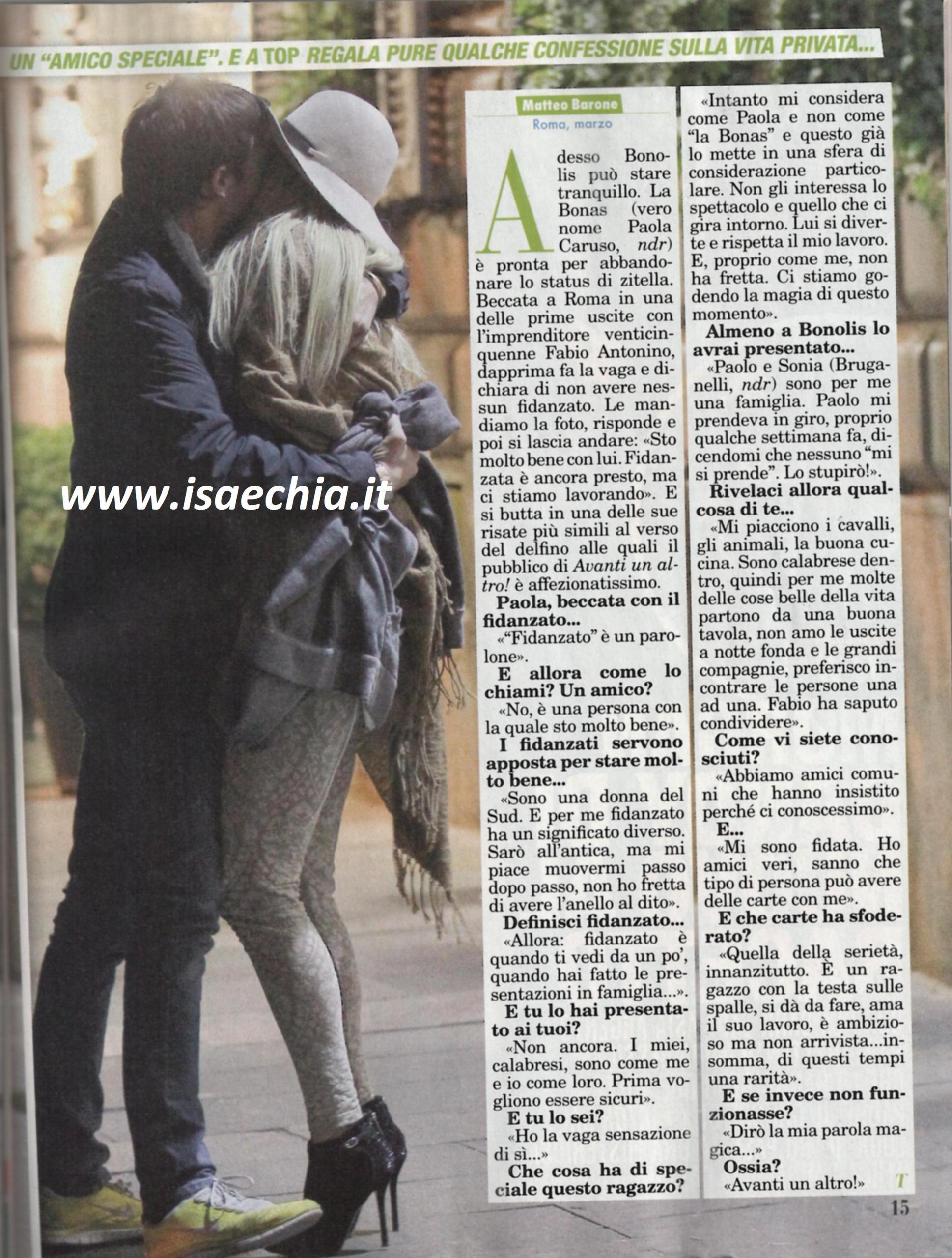 Forse non tutti sanno che la “Bonas” di Avanti un altro, Paola Caruso, oltre ad esser stata corteggiatrice di Fernando Vitale a Uomini e donne, ex concorrente di Veline e di Miss Italia, è anche una provetta cavallerizza e ha una laurea triennale in Giurisprudenza. Recentemente, la bella calabrese è stata beccata mentre baciava un “amico” e, intervistata, spiega: “Sto molto bene con lui, ma per dire “fidanzato” è troppo presto. Ci stiamo lavorando. Sono una donna del Sud e per me, parlare di fidanzamento vuol dire che ti ci vedi da un po’ e che hai fatto le presentazioni in famiglia. Sono una all’antica, mi piace muovermi passo per passo e non ho fretta di avere l’anello al dito. Non l’ho ancora presentato ai miei, prima voglio essere sicura”. Quando le si chiede cos’ha Fabio Antonino (questo è il nome del ragazzo) di speciale, risponde: “Intanto mi vede come Paola e non come “la Bonas”. Non gli interessa lo spettacolo e ciò che ci gira intorno. Lui si diverte e rispetta il mio lavoro e come me, non ha fretta: ci stiamo vivendo questo magico momento. Paolo Bonolis e sua moglie Sonia sono come una famiglia per me. Proprio qualche settimana fa Paolo mi prendeva in giro dicendo che “nessuno mi si prende”, ma lo stupirò! Io e Fabio ci siamo conosciuti tramite amici comuni che hanno insistito perché ci conoscessimo e mi sono fidata. Lui si è giocato le sue carte, prima di tutte quella della serietà. Ama il suo lavoro ed è ambizioso, ma non arrivista. E se non dovesse funzionare…Avanti un altro!”