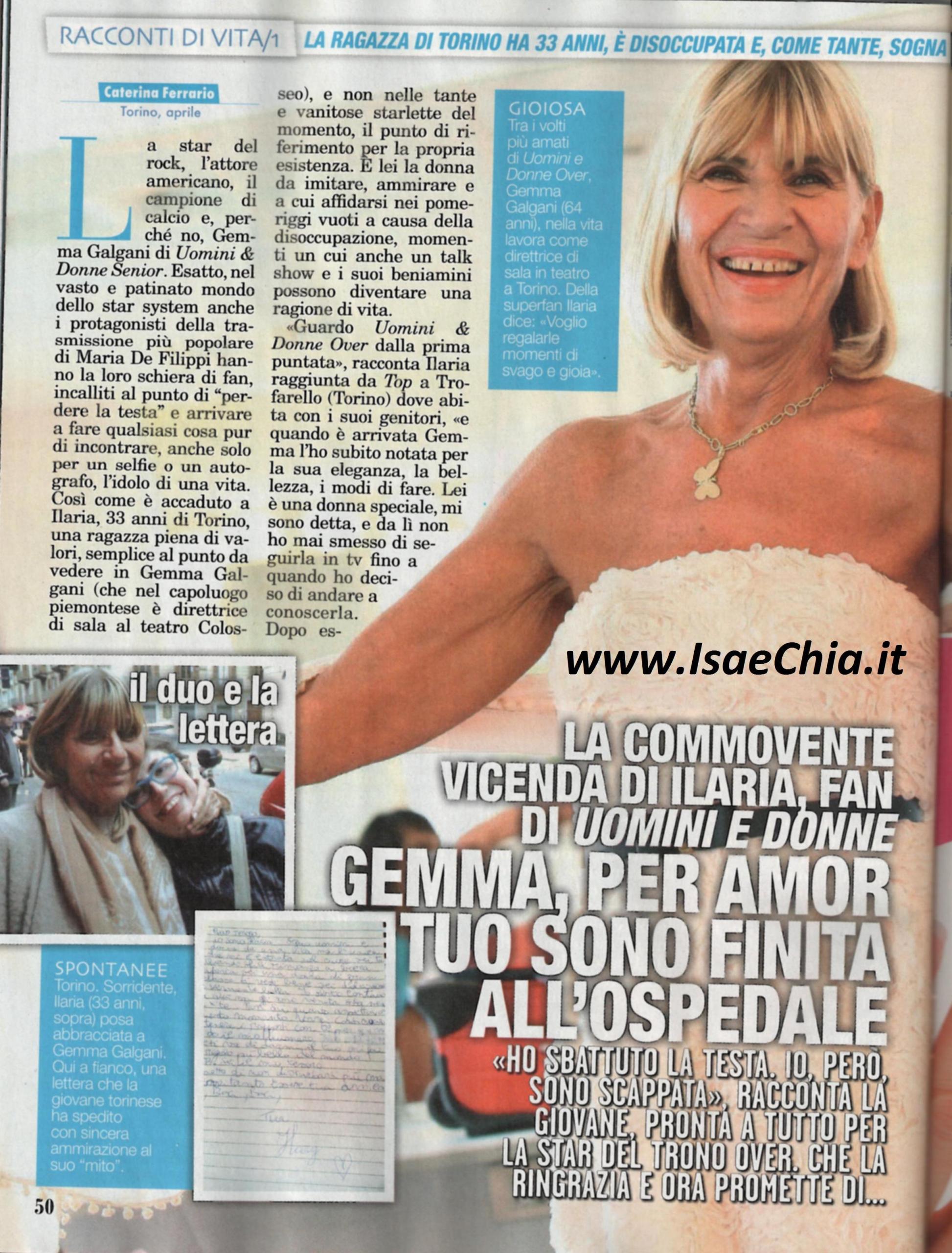 Ilaria, 33enne di Torino, è una ragazza piena di valori e semplice al punto da vedere in Gemma Galgani del Trono Over il suo idolo e punto di riferimento, la donna da ammirare nei suoi pomeriggi vuoti a causa della disoccupazione: “Guardo Uomini e donne Over dalla prima puntata e quando è arrivata Gemma l’ho notata subito per la sua eleganza, la bellezza, i modi di fare. ‘Lei è una donna speciale’ mi sono detta e da lì non ho smesso di seguirla, finché ho deciso di andare a conoscerla. Dopo esser riuscita ad avvicinarla un paio di volte in via ufficiale, venerdì scorso, prima del concerto di Enrico Ruggeri, ho deciso di farle una sorpresa. Mi sono trovata davanti al teatro di cui lei è direttrice alle 15,30 e l’ho aspettata fino alle 18,30. Presa dall’euforia non mi sono accorta di una porta a vetro mentre correvo per andare da Gemma e vi ho battuto la testa. Mi hanno portata al pronto soccorso, ma io sono scappata per tornare da lei!”. Questa non è l’unica dimostrazione di affetto di Ilaria, che ha anche scritto una lettera a Gemma, sempre nel rispetto della sua privacy. La protagonista di Uomini e donne ha risposto: “Sono lusingata e commossa dall’attaccamento e dalla dimostrazione d’affetto di Ilaria. Sento che è sincera e spontanea perché dotata di una sensibilità fuori dal comune. Voglio starle vicino, regalarle momenti di svago e gioia, per riscattarla dalla vita che per ora non è stata molto generosa nei suoi confronti”. E Ilaria sogna: “Di poter diventare sua amica e poter ricevere i suoi consigli, anche amorosi, dato che mi sono appena fidanzata…”