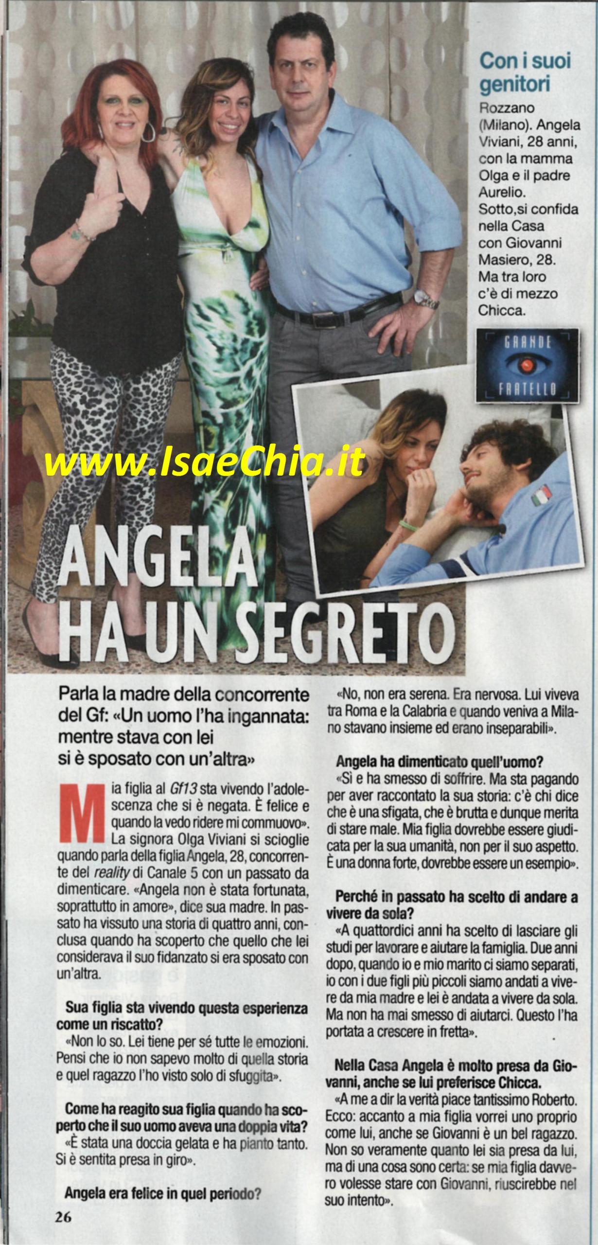 Ieri sera al Grande fratello si è parlato della delusione d’amore vissuta da Angela Viviani prima dell’ingresso nella Casa. Sua madre, la signora Olga, commenta: “Angela sta vivendo l’esperienza nella Casa come un riscatto, sta vivendo l’adolescenza che si è negata. E’ felice e quando la vedo ridere mi commuovo. Lei è una che tiene dentro tutte le emozioni, pensi che io non sapevo molto di quel ragazzo che l’ha fatta soffrire, l’ho visto solo di sfuggita. Per lei è stata una doccia gelata, ci ha pianto tanto. Non era serena, era nervosa: lui viveva tra Roma e la Calabria, ma quando veniva a Milano erano inseparabili. Ora ha smesso di soffrire, ma sta pagando per aver raccontato questa storia: c’è chi dice che è sfigata e brutta e merita di stare male. Mia figlia dovrebbe essere giudicata per la sua umanità, non per il suo aspetto! E’ una donna forte e dovrebbe essere un esempio. A 14 ani ha deciso di lasciare la scuola e andare a lavorare. Due anni dopo, quando io e mio marito ci siamo separati, io sono andata a vivere da mia madre e lei da sola. Non ha mai smesso di aiutarci e questo l’ha portata a crescere in fretta”. Quando le si chiede cosa pensa di Giovanni Masiero, dal quale Angela sembrava presa all’inizio, la signora risponde: “In verità credo che vicino a lei ci voglia uno come Roberto Ruperti. Non so quanto fosse presa da Giovanni, ma di una cosa sono certa: se lo fosse stata davvero, sarebbe riuscita nel suo intento!”