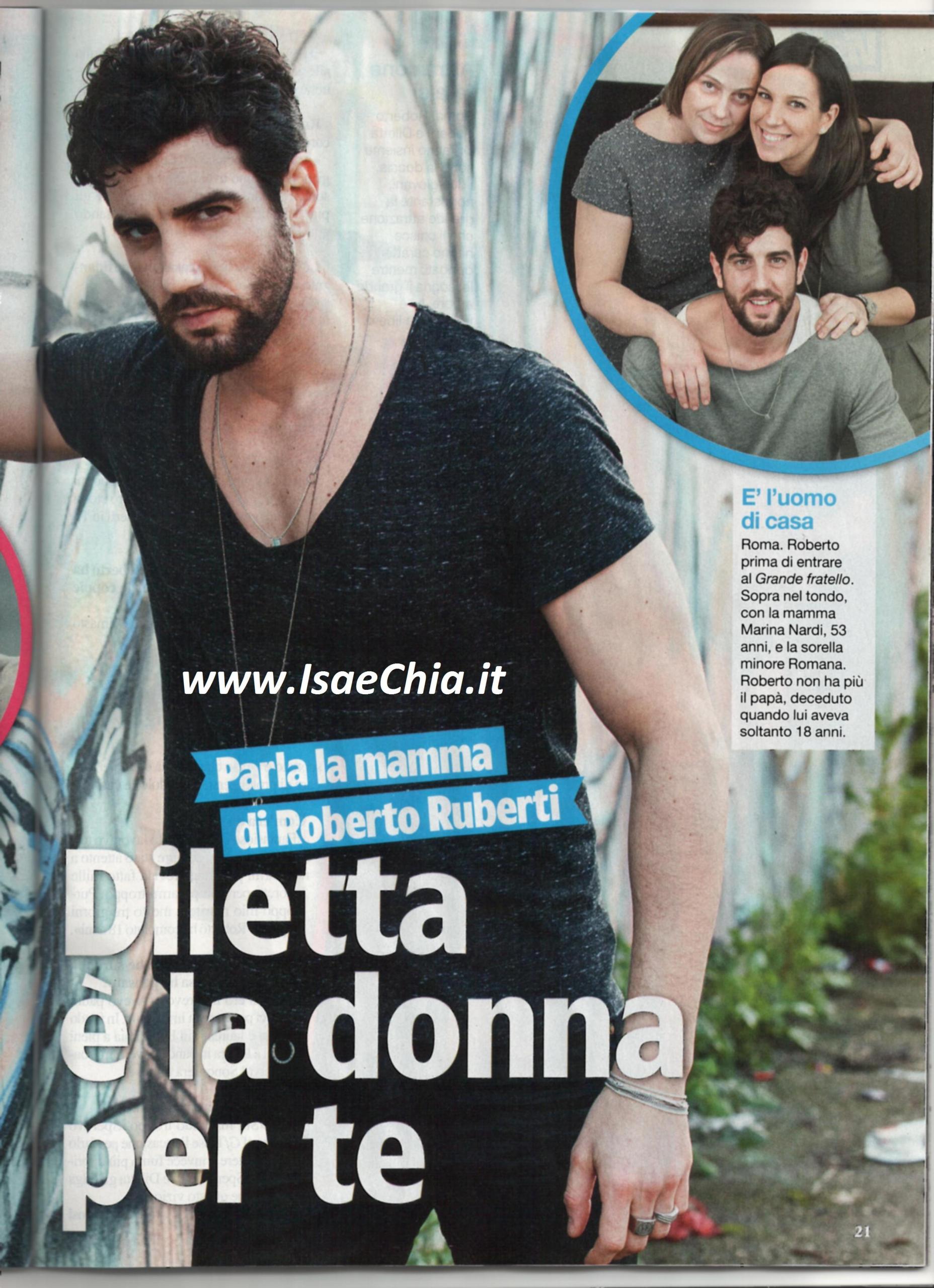 Nella Casa del Grande fratello 13 è scoppiata la passione tra Diletta Di Tanno e Roberto Ruberti. La mamma del bel romano, la signora Marina Nardi commenta così: “Mio figlio è molto preso. Se me l’avessero detto alla vigilia non ci avrei creduto, perché è molto riservato. Invece mi sembra che stia veramente bene con lei. Senza togliere nulla alle altre, lei rispecchia in pieno il suo canone di donna. E’ stato un po’ contesto tra lei e Veronica Graf: adesso funziona così, le donne si fanno avanti! Lui è sereno così, quindi ben venga che stanno affrontando quest’avventura insieme”. Quando le si chiede se ha conosciuto altre sue ragazze, la signora risponde: “Quasi tutte e ogni volta mi sono talmente affezionata che quando si lasciavano, era come perdere una figlia. Ma l’ultima volta gli ho detto: “Adesso basta. La prossima che mi presenti deve essere quella per sempre”. Così da due anni non mi porta nessuna a casa, anche se so che non è rimasto single tutto questo tempo. Mi auguro che mi presenterà Diletto e confesso che mi sono già affezionata a lei: vederli in tv è come averli a casa con me e se la loro storia non decollasse ci rimarrei male”. Quando le si chiede di interpretare la dichiarazione del figlio, che dice di “non essere un uomo per le coppie classiche”, risponde: “Quando è finita l’ultima storia è rimasto molto scottato e credo lo abbia detto per proteggersi”. Infine, la mamma racconta: “Da piccolo era fantasioso e studioso. Io lavoravo tutto il giorno e lui non mi dava preoccupazioni. Ha fatto mille lavoretti. Mio marito è morto tre giorni dopo che Roberto ha compiuto 18 anni. Non ero favorevole alla sua partecipazione al GF: in fondo si è laureato in Economia a pieni voti e ha un posto in banca. Ma mi sbagliavo e sono fiera di lui. Speravo che fosse l’occasione giusta per farlo smettere di fumare, invece lo fa più di prima! Spero che Diletta gli faccia togliere anche questo vizio!”
