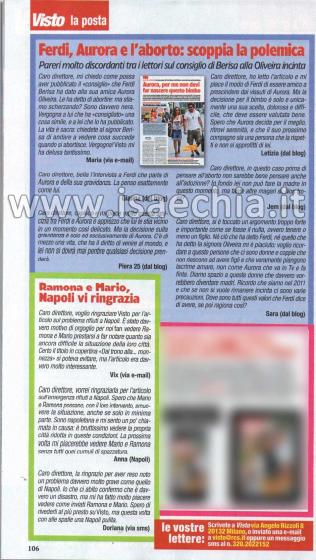 Ha suscitato un vespaio di polemiche l’articolo di Visto, risalente alla scorsa settimana, in cui Ferdi Berisa consigliava all’ex escort Aurora Oliveira di abortire; ma soprattutto, trend inverso rispetto ai commenti di questo blog tra i lettori di Visto riguardo la “gita” della coppia Amodeo – De Felice a Napoli.
