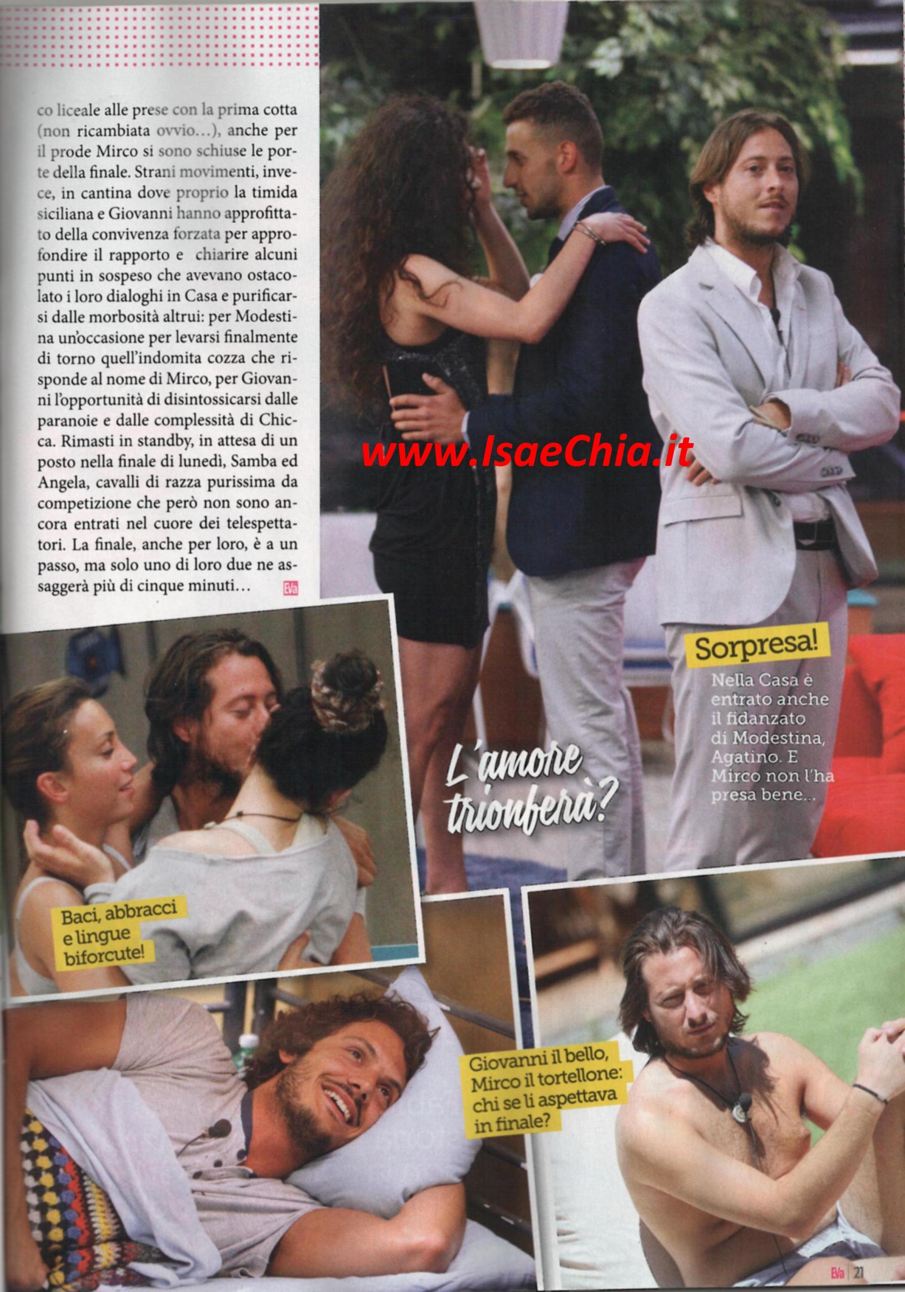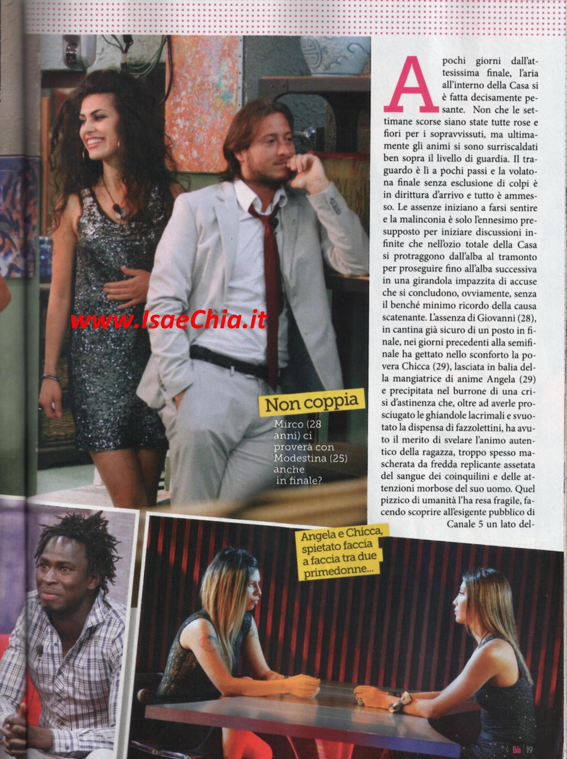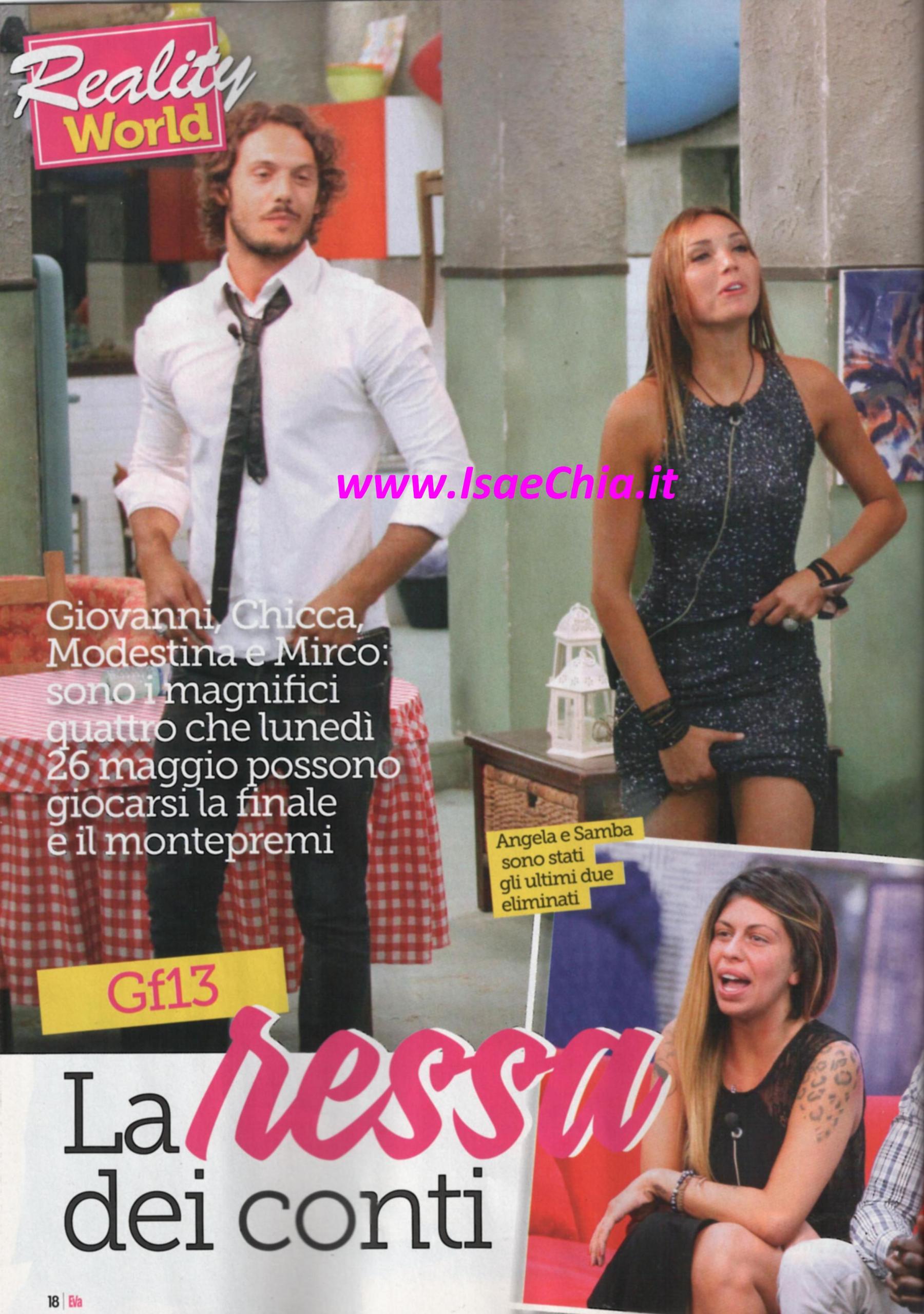 E’ arrivata la fine anche per la tredicesima edizione del Grande fratello e domani dovrebbe andare in onda l’ultima puntata, che decreterà il vincitore tra Chicca Rocco, Modestina Cicero, Mirco Petrilli, Giovanni Masiero e il concorrente che il pubblico sceglierà come finalista tra Angela Viviani e Samba Laobe Ndiaye. Grazie agli scherzetti giocati dal GF, nella Casa si respira un’atmosfera molto tesa: Giovanni è stato separato per tutta la settimana scorsa da Chicca e quest’ultima l’ha visto scherzare con Modestina e ha dovuto confrontarsi faccia a faccia con Angela, a cuore aperto. Mirco, invece, ha sentito la mancanza di Modì: “Mi manca, mi sono legato molto a lei. E’ strano, ma sembra tutto diverso qui senza di lei”, e nel corso della scorsa puntata ha avuto conferma del fatto che lei avesse davvero un ragazzo fuori ad aspettarla. Infine, Samba e Angela sono rimasti nella Casa, isolati e presi in giro dagli autori, convinti di combattere per la vittoria e di aver fatto fuori tutti gli altri, mentre in realtà il pubblico ha preferito tutti gli altri a loro. Solo uno di loro assaggerà la sensazione di arrivare in finale per più di cinque minuti.