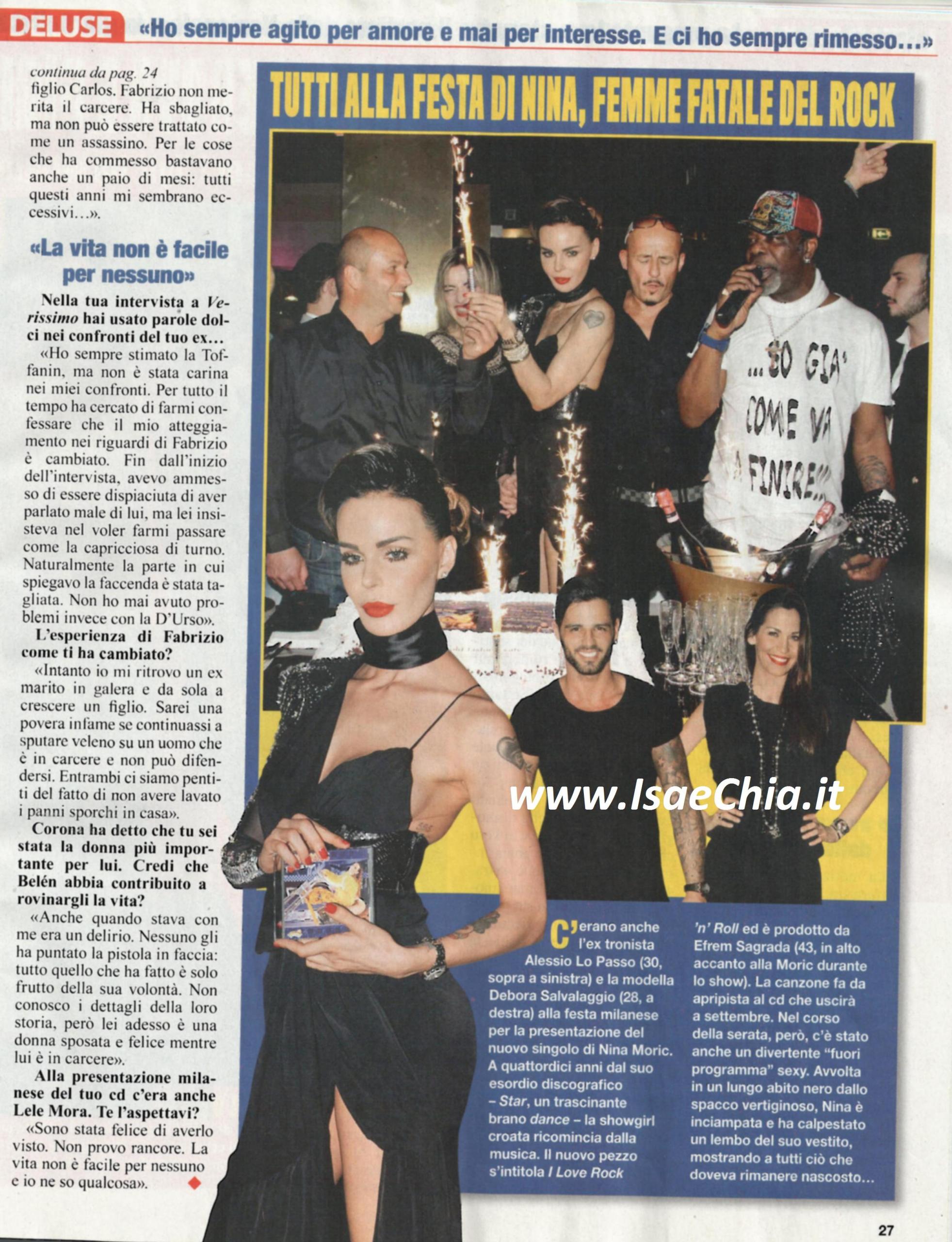 Qualche sera fa, Nina Moric è stata beccata mentre baciava appassionatamente un misterioso ragazzo di nome Nicolò (clicca QUI per rivedere l’articolo). Eppure, nella sua ultima intervista, l’ex naufraga ha dichiarato: “Ho fatto voto di castità. Sono tre mesi che non ho rapporti sessuali perché sono stanca di dare qualcosa di me a persone che non meritano. Dopo Fabrizio Corona è stato un abisso continuo. Ho sempre agito per amore e mai per interesse, e puntualmente ci ho rimesso, con ogni uomo. Metterei tutti i miei ex sul Titanic per farli affondare e sono convinta del mio fioretto”. Quando le si chiede se ha fatto il fioretto per ricevere come grazia la scarcerazione dell’ex marito, Corona, nonché padre di suo figlio Carlos, risponde: “L’ho fatto innanzitutto per me stessa, per la mia serenità interiore. Ho il dovere di trasmettere serenità a mio figlio. Fabrizio non merita il carcere, ha sbagliato ma non può essere trattato come un assassino: bastavano pochi mesi”. E parlando della sua intervista a Verissimo, in cui ha avuto parole dolci per lui, dice: “Ho sempre avuto stima per Silvia Toffanin, ma non è stata carina nei miei confronti: per tutto il tempo ha cercato di farmi confessare che il mio atteggiamento nei riguardi di Fabrizio è cambiato, cercando di farmi passare per la capricciosa di turno fin dall’inizio dell’intervista. Naturalmente la parte in cui spiegavo la faccenda è stata tagliata. Non ho avuto problemi, invece, con Barbara D’Urso. Sarei una povera infame se continuassi a sputare veleno su un uomo che è in carcere e non può difendersi. Entrambi ci siamo pentiti di non aver lavato i panni sporchi in casa”. Quando le si chiede se stare con Belén Rodriguez abbia contribuito a rovinargli la vita, risponde: “Anche quando stava con me, era un delirio e tutto ciò che ha fatto era frutto della sua volontà. Non so i dettagli della loro storia, ma so che lei è felicemente sposata e lui è in carcere”. Infine, quando le si chiede se si aspettava che alla presentazione del suo cd ci fosse anche Lele Mora, risponde: “Sono stata felice, io non provo rancore. La vita non è facile per nessuno e io ne so qualcosa”.