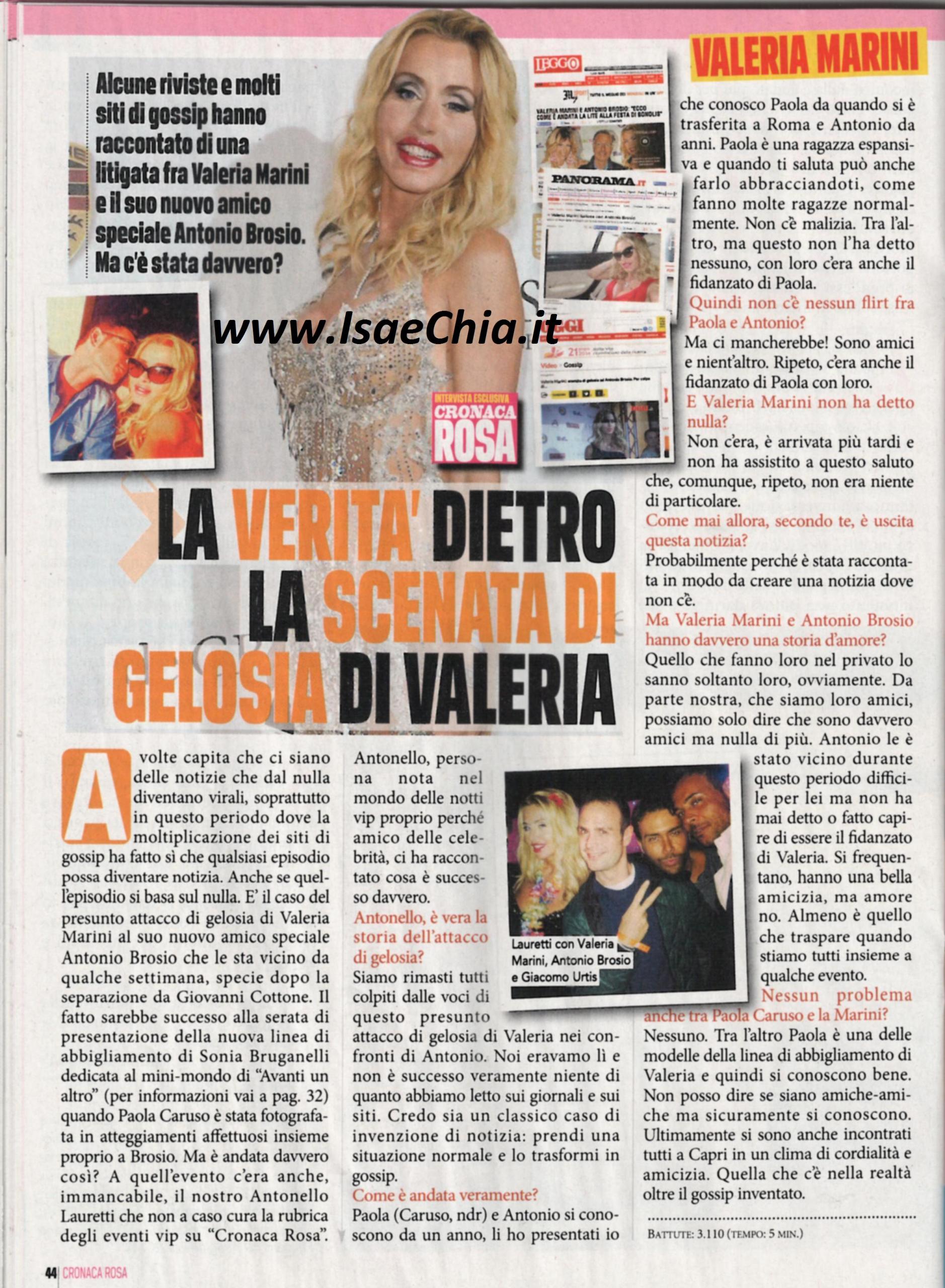 Dopo la separazione dal marito Giovanni Cottone, al fianco di Valeria Marini si fa vedere da un po’ un nuovo uomo, Antonio Brosio, che era apparso in precedenza a Uomini e donne. Recentemente, però, si era parlato di una sua sceneggiata di gelosia nei confronti di Antonio, durante la presentazione della linea di Sonia Bruganelli, la moglie di Paolo Bonolis, dedicata al piccolo mondo di Avanti un altro. In tale occasione, infatti, l’ex naufraga avrebbe mostrato gelosia nei confronti della “Bonas” Paola Caruso. L’esperto di gossip di Cronaca rosa, Antonello Lauretti, era presente alla festa e racconta come sono andate davvero le cose: “E’ stato tutto esagerato: noi eravamo lì e non è successo veramente nulla di quello che è stato descritto nei giornali. Paola e Antonio si conoscono da tempo, li ho presentati io; lei è una ragazza espansiva, che quando ti saluta può farlo abbracciandoti. Tra l’altro quella sera c’era il fidanzato di Paola! Non c’è stato nessun flirt, sono amici e nient’altro! Valeria non c’era, è arrivata più tardi e non ha assistito a questo saluto, che, ripeto, non aveva nulla di particolare. Probabilmente è stato raccontato in modo da creare una notizia che non c’è”. Quando gli si chiede se tra Valeria e Antonio è vero amore, Antonello risponde: “Noi che siamo amici loro, sappiamo di un’amicizia e niente più. Si frequentano, hanno una bella amicizia, ma amore no, almeno questo è quello che traspare quando stiamo insieme a qualche evento. Tra Paola e Valeria non c’è nessun problema: lei è una delle modelle per la sua linea d’abbigliamento; non sono proprio amiche-amiche ma si conoscono e a Capri si sono salutate cordialmente”.