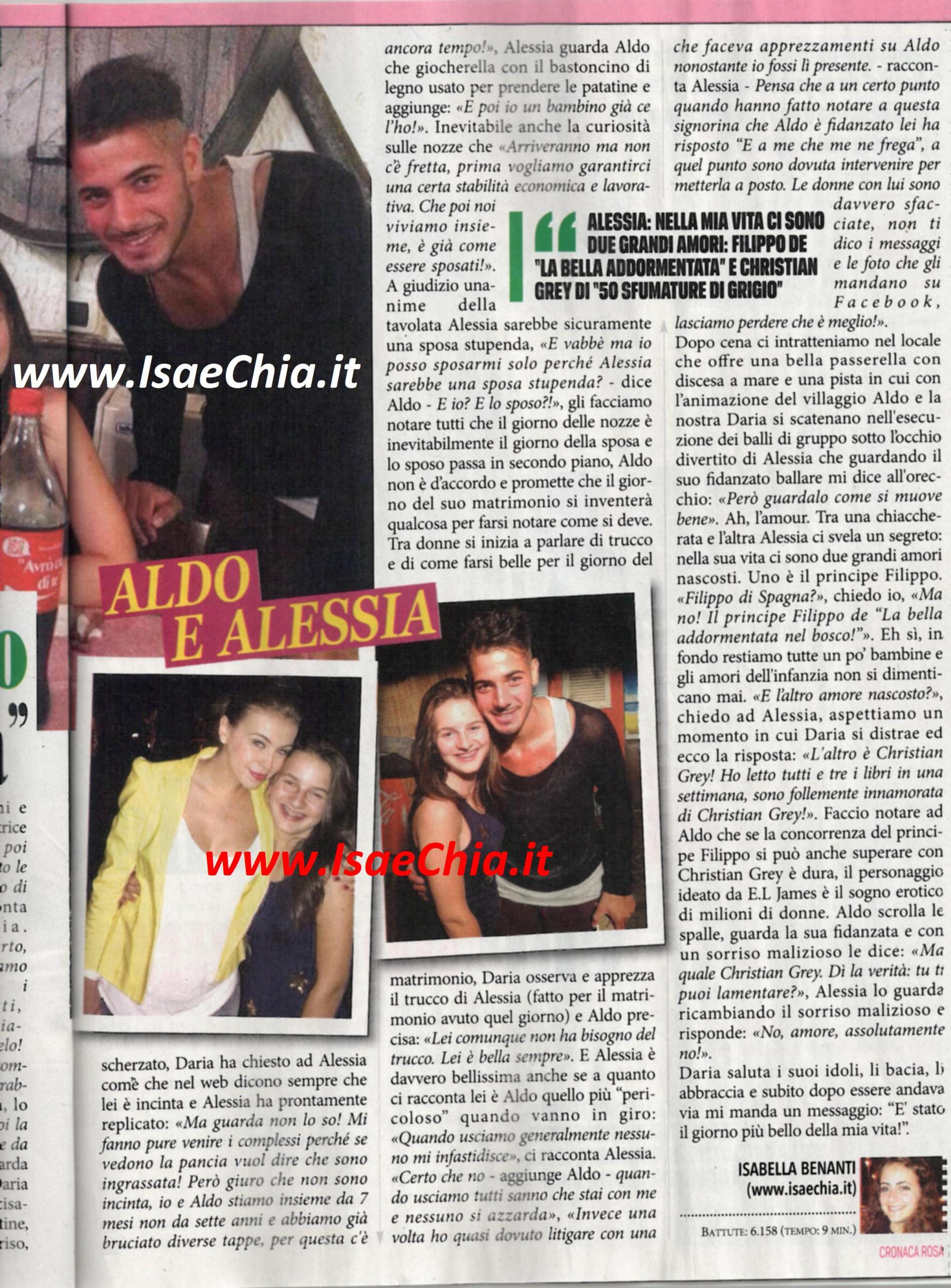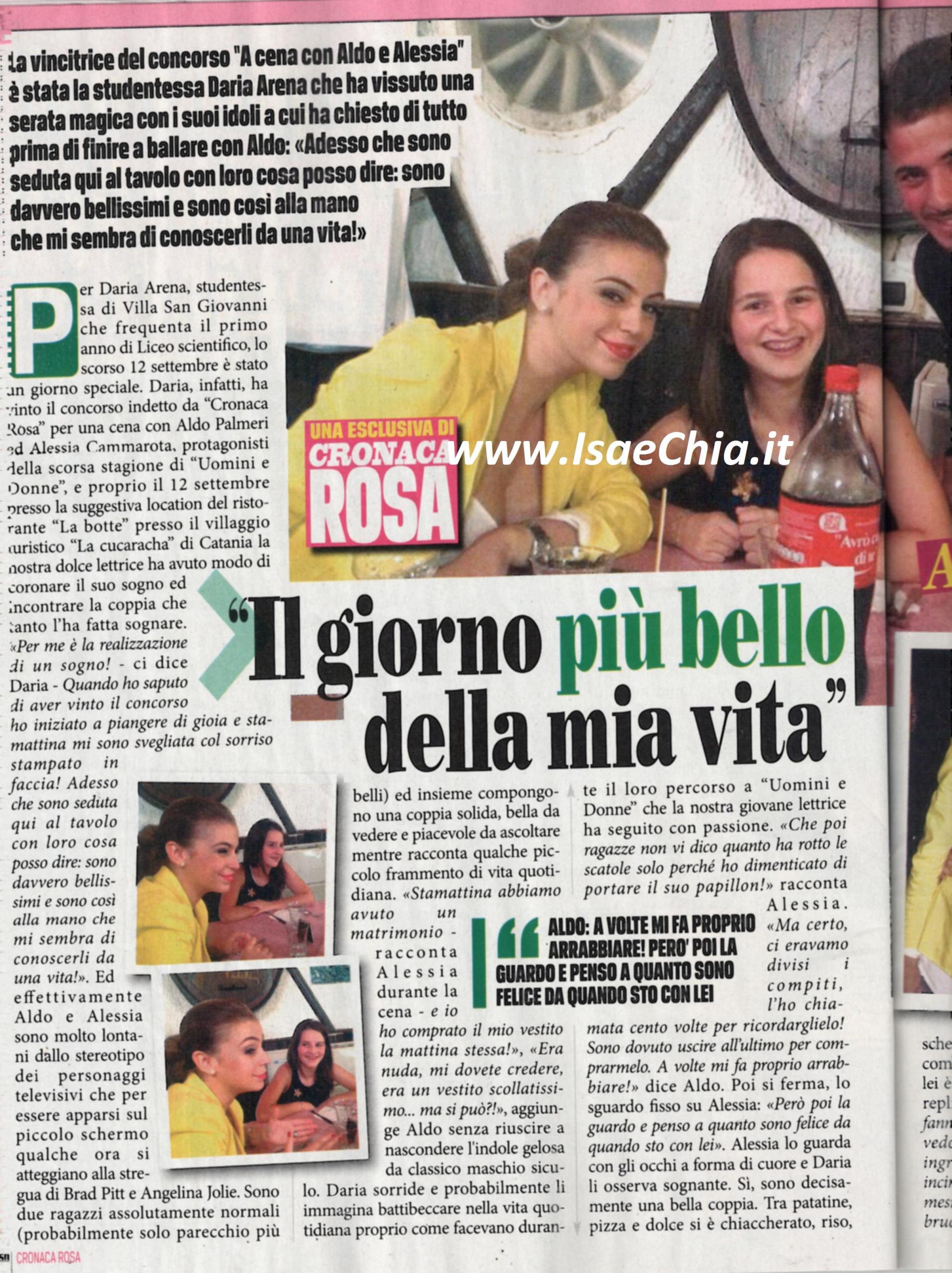 Per Daria Arena, studentessa al primo anno di liceo scientifico, di Villa San Giovanni, il 12 settembre è stato un giorno speciale: è lei la vincitrice del concorso lanciato alla rivista Cronaca rosa, che le ha permesso di trascorrere una serata con l’ex tronista Aldo Palmeri e la sua fidanzata Alessia Cammarota a Catania. La nostra Isa ha avuto modo di intervistarla: “Per me è stata la realizzazione di un sogno! Quando ho saputo di aver vinto il concorso, ho iniziato a piangere di gioia e stamattina mi sono alzata col sorriso stampato in faccia. Adesso sono qui seduta al tavolo con loro e cosa posso dire? Sono bellissimi e mi sembra di conoscerli da una vita!”. La coppietta, invece, ha raccontato qualche dettaglio della loro vita insieme: “Stamattina siamo stati a un matrimonio, ma io ho comprato il vestito stamattina stessa!” confessa la bionda corteggiatrice. “Era nuda, era un vestito scollatissimo. Ma si può?” esclama geloso il siciliano. “Non vi dico Aldo quanto ha rotto lo scatole perché ho dimenticato di portare il suo papillon” dice lei, “Sì, ci eravamo divisi i compiti, l’ho chiamata cento volte per ricordarglielo, ma poi ho dovuto comprarlo all’ultimo momento. Mi ha fatto proprio arrabbiare. Poi, però, la guardo e penso a quanto sono felice da quando sto con lei”. Daria ne ha approfittato per fare qualche domanda alla coppia e quando ha chiesto ad Alessia se è vero che fosse incinta, come si è letto in Rete, lei risponde: “Mi fanno venire i complessi, perché se vedono la pancia vuol dire che sono ingrassata! Io e Aldo stiamo insieme a 7 mesi, non 7 anni, e abbiamo già bruciato diverse tappe. Per questa c’è ancora tempo! E poi, un bambino io già ce l’ho” dice, riferendosi a lui. “Le nozze arriveranno, ma non c’è fretta. Prima vogliamo garantirci una certa stabilità economica. Noi viviamo insieme ed è già come se fossimo sposati!”. Infine, Alessia ha raccontato aneddoti divertenti: “Una volta una faceva apprezzamenti su Aldo nonostante io fossi là e quando le hanno fatto notare che lui fosse fidanzato, lei ha risposto: “E che me ne frega”. Sono dovuta intervenire per metterla a posto: le donne sonno avvero sfacciate, per non parlare di quelle che scrivono messaggi su Facebook!” e poi rivela i suoi due amore segreti: “Il principe Filippo de La bella addormentata nel bosco, e Christian Grey, della collana 50 sfumature…”. Quando Aldo le dice: “Ma quale Christian Grey? Ti puoi lamentare?” Alessia però, risponde: “No, amore, assolutamente no!”