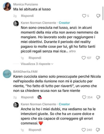 Futuro che è diventato presente per Karen: infatti, attraverso i suoi social, ha lasciato qualche indizio di apertura. Attraverso un video postato su Tik Tok, ha risposto ad alcuni commenti e ha voluto sottolineare il fatto che non si è mai allontanata da Nicola per il diverso stile di vita, ma che per avere ora quello che ha, ha lavorato sodo per raggiungere tutti i suoi obbiettivi.