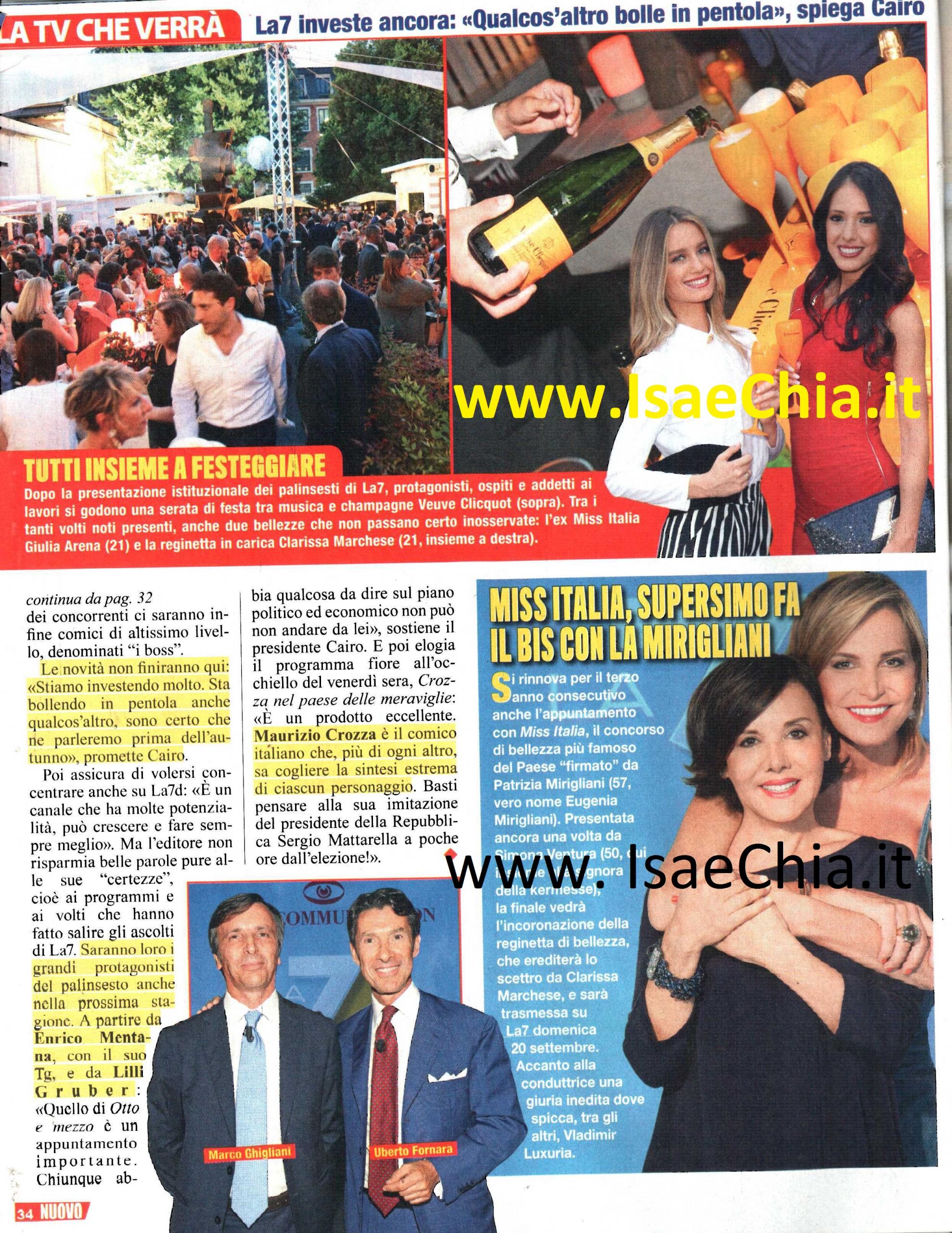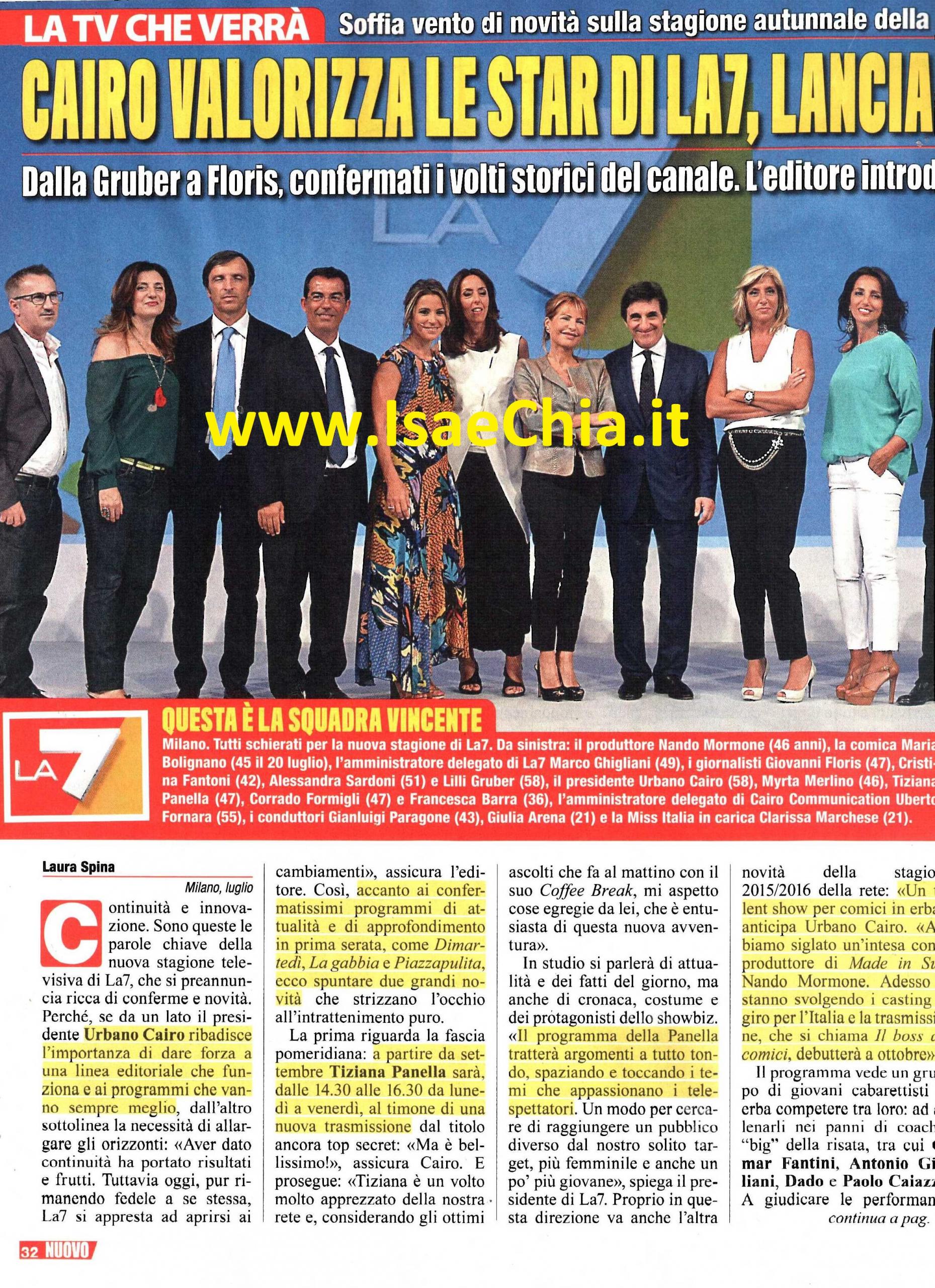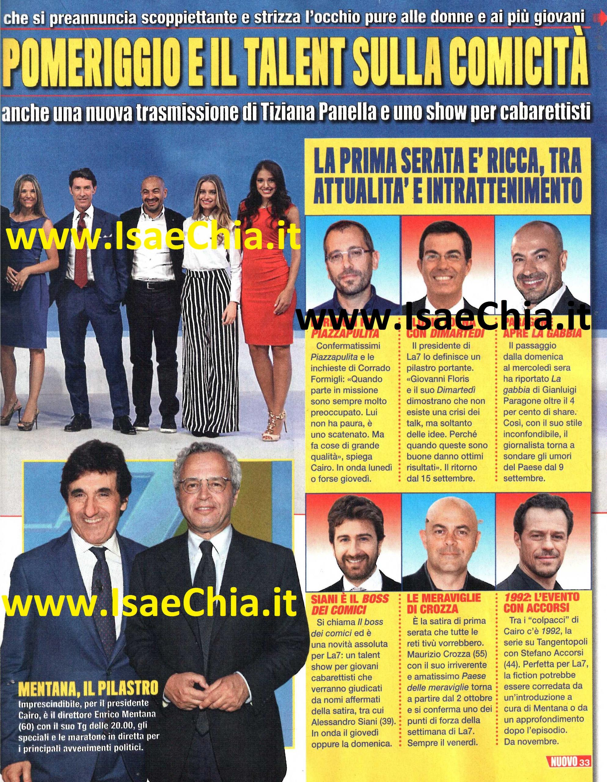 “Continuità e innovazione”: sono queste le parole chiave della prossima stagione televisiva di La7. Il presidente Urbano Cairo, infatti, ha confermato molti programmi che funzionano, pur restando aperto alle novità: “Aver dato continuità ha portato i suoi frutti. Tuttavia, oggi, pur rimanendo fedele a se stessa, La7 si apre ai cambiamenti“. Così, accanto alle conferme dei programmi Dimartedì, La gabbia e Piazza pulita, ci saranno varie innovazioni. La prima è il programma pomeridiano condotto da Tiziana Panella: “Tiziana è un volto molto apprezzato e considerato il successo del programma che fa la mattina, Coffee break, mi aspetto cose egregie da lei, che è entusiasta per la nuova avventura. Tratterà argomenti a tuttotondo, spaziando e toccando temi che appassionano i telespettatori. Un modo per cercare di raggiungere un pubblico diverso dal nostro solito target, più femminile e anche un po’ più giovane“. E proprio in questa direzione va anche l’altra grande novità: un talent show per i comici in erba. “Abbiamo siglato un’intesa con il produttore di Made in Sud, Nando Mormone. Adesso stanno svolgendo i casting in giro per l’Italia per la nostra trasmissione, che si chiama Il boss e i comici”. Ad allenare i concorrenti, ci saranno i coach Omar Fantini, Antonio Giuliani, Dado e Paolo Caiazzo. A giudicare le performance ci saranno dei comici di altissimo livello. Per ora è certo il nome di Alessandro Siani, ma si parla anche del Mago Forest e di Vincenzo Salemme. Ma, oltre che delle novità, Cairo parla anche delle grandi conferme, delle sue certezze, che hanno fatto salire gli ascolti della rete: Enrico Mentana, con il suo TG, e Lilli Gruber. “Quello di Otto e mezzo è un appuntamento importante. Chiunque abbia qualcosa di importante da dire sul piano economico e politico non può non andare dalla Gruber“. E infine, il fiore all’occhiello di La7, Crozza nel paese delle meraviglie: “E’ un prodotto eccellente. Maurizio Crozza è il comico italiano che più di ogni altro, sa cogliere la sintesi estrema di ogni personaggio. Basti pensare alla sua imitazione del Presidente della Repubblica Sergio Mattarella a poche ore dalla sua elezione!“. E si rinnova, per il terzo anno consecutivo dopo l’addio alla Rai, anche l’appuntamento con Miss Italia, firmato da Patrizia Mirigliani. Anche stavolta alla conduzione ci sarà Simona Ventura e la finale verrà trasmessa domenica 20 settembre. La vincitrice erediterà la corona di Clarissa Marchese, la Miss Italia in carica, che a sua volta l’ha ereditata da Giulia Arena, ora conduttrice del programma Gustibus, sulla stessa rete. La grande novità? Una giuria inedita, dove spicca una vecchia conoscenza della Ventura: Vladimir Luxuria, vincitrice dell’Isola dei famosi 6.