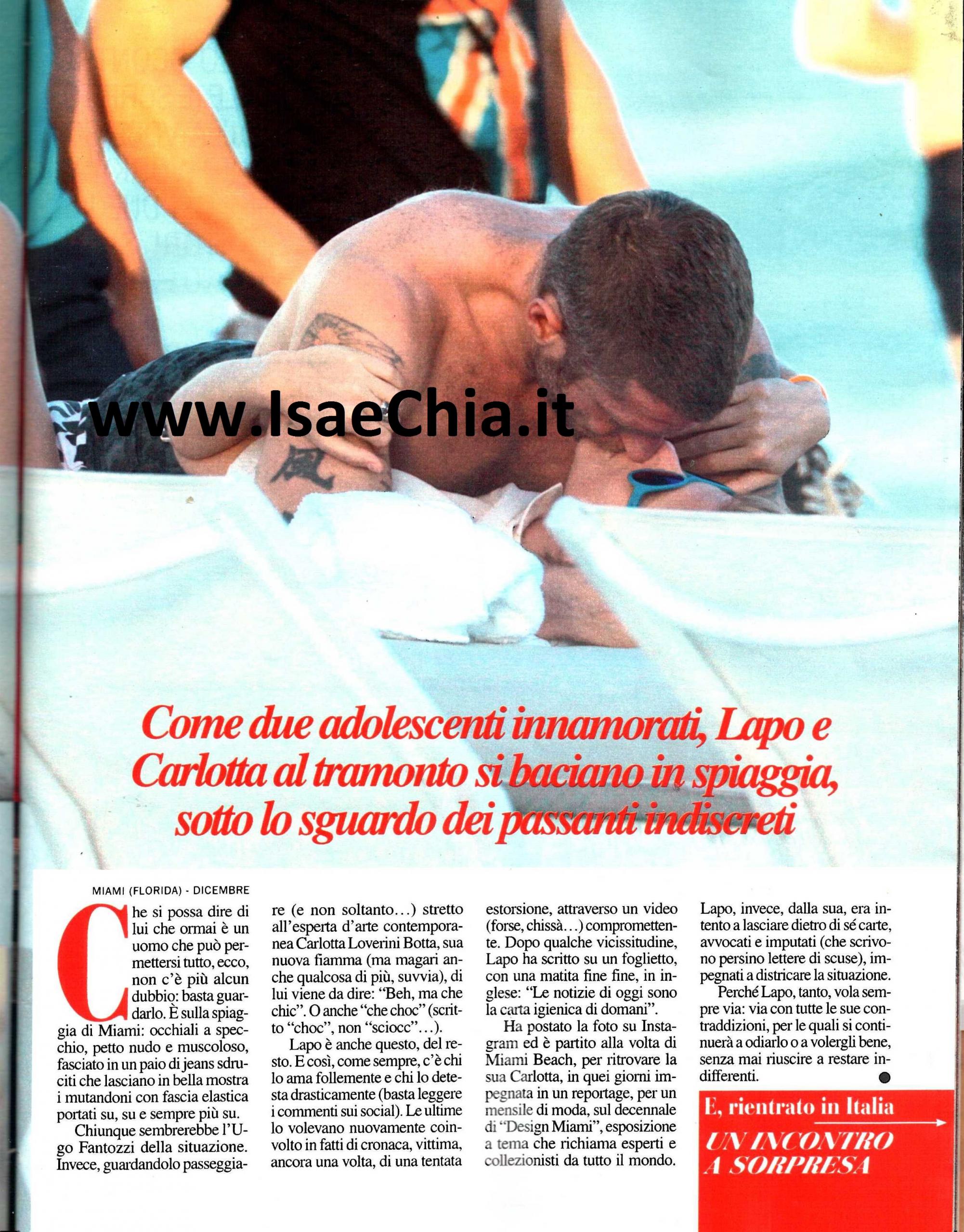 L’imprenditore Lapo Elkann è recentemente stato vittima di alcuni tentativi di estorsione tramite un video compromettente e per distrarsi dalla situazione complicata, è volato in Florida, dove è stato beccato in compagnia della sua nuova fiamma: lei si chiama Carlotta Loverini Botta, ha 33 anni, ed era a Miami per fare un reportage per il Decennale dell’evento Design Miami, che richiama designer e galleristi da tutto il mondo. Lapo è conosciuto per il suo stile singolare e di lui si può dire che può permettersi di tutto: eccolo, infatti, a torso nudo, con gli occhiali da sole a specchio, e…delle mutande con l’elastico tirato un po’ troppo su. Chiunque altro, al suo posto, sarebbe sembrato il ragionier Ugo Fantozzi, invece lui appare comunque chic e fa le sue conquiste… I due si lasciano andare ad effusioni a bordo della loro barca e così Lapo dimentica tutte le carte, gli avvocati e gli imputati, impegnati a districare tra di loro la situazione. Al suo ritorno in Italia, infatti, Lapo ha fatto un incontro particolare. Recentemente, lui e l’imprenditore delle calzature Diego Della Valle si erano scambiati dei tweet al vetriolo: “Il modo in cui è stato liquidato Montezemolo è stato vergognoso, il motivo evidente. Ferrari ha salvato quel bidone che è Fiat” aveva dichiarato Della Valle. La risposta di Elkann non si è fatta attendere: “Scusa, hai le Hogan, non ti posso parlare” e poi “Una macchina può far sognare più di un paio di scarpe”. Eppure, dopo lo scontro verbale, quando i due si incontrano al centro di Milano, si fermano, scambiano due chiacchiere e perfino un gesto affettuoso…Pace fatta?