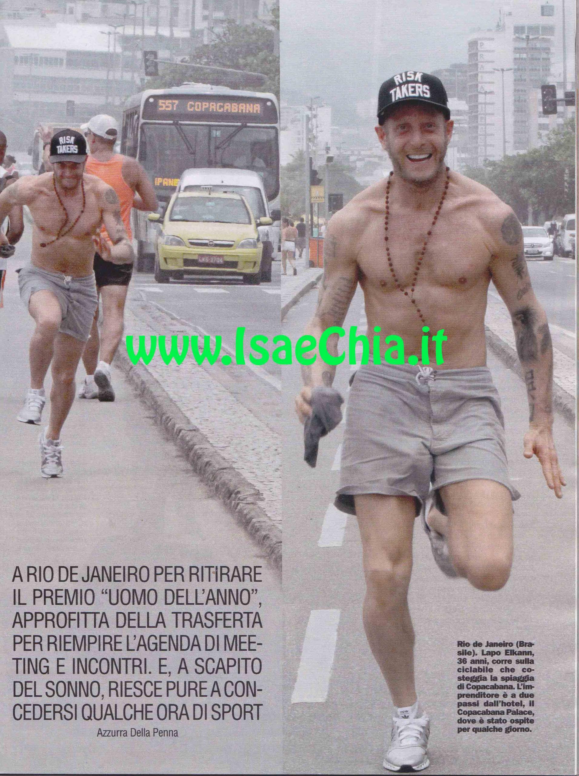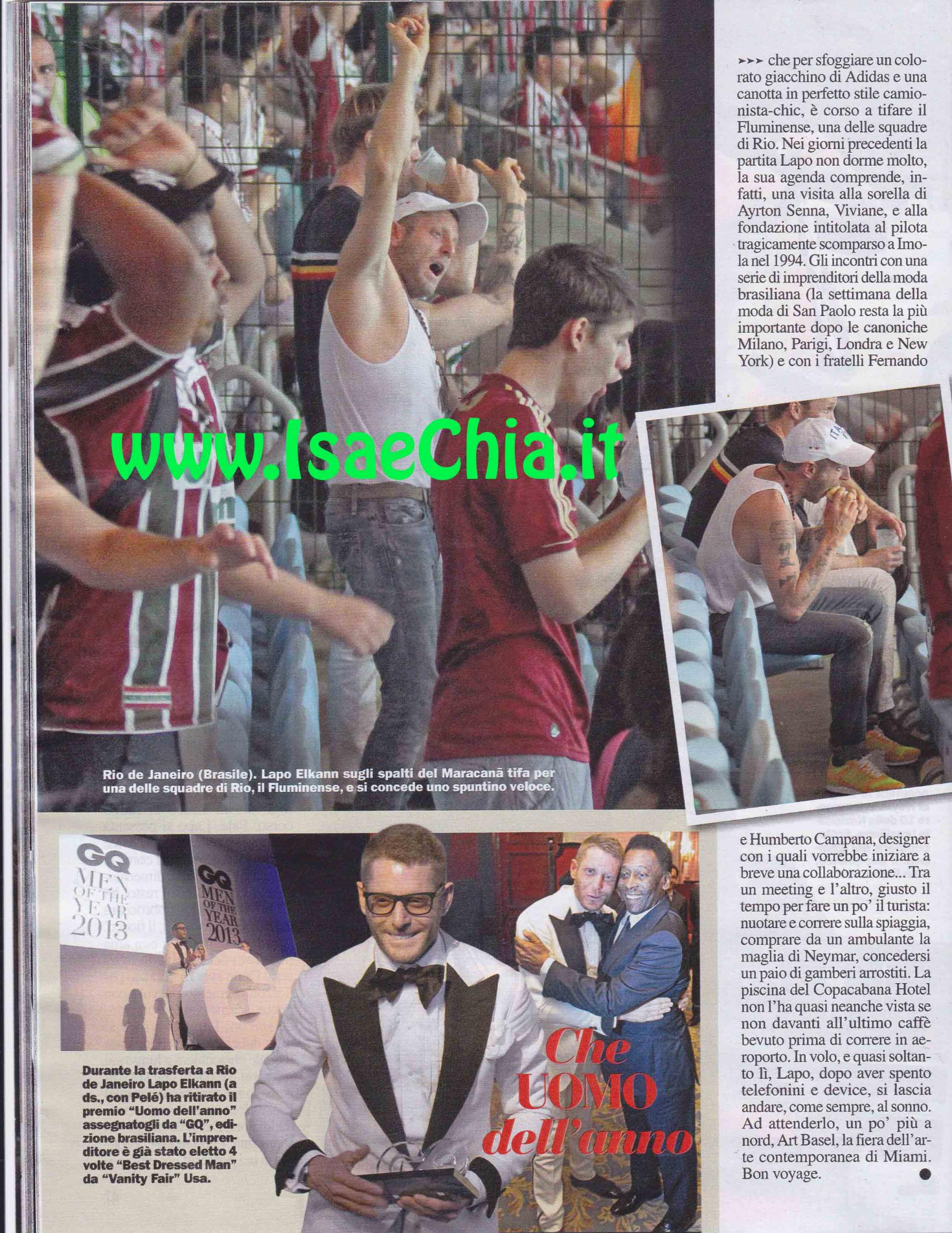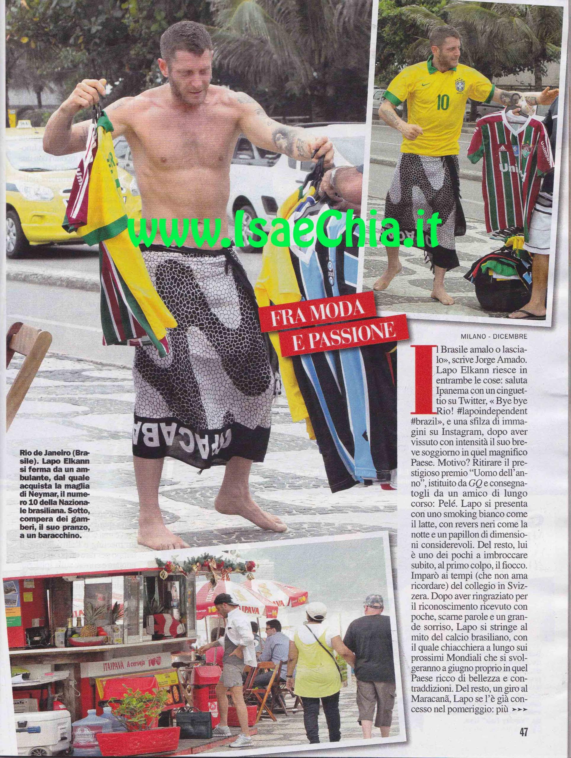 Per ritirare il prestigioso premio “Uomo dell’anno”, istituito da GQ e consegnatogli dall’amico Pelé, l’imprenditore Lapo Elkann si è recato in Brasile. Alla cerimonia si è presentato in smoking bianco con revers neri e un grande papillon. Ringraziato con poche parole, Elkann chiacchiera con Pelé circa i mondiali di calcio, che si terranno proprio nello splendido Paese. Infatti, anche lui ne ha approfittato per fare un giretto: eccolo in giro per le strade di Rio De Janeiro, mentre fa una corsetta a torso nudo. Poi, scende sulla contigua spiaggia di Copacabana e fa qualche esercizio. Poi, con una canotta in perfetto stile camionista, va a tifare per una squadra locale, la Fluminense. I giorni di permanenza sono stati intensi: ha incontrato Viviane Senna (sorella del pilota Ayrton, scomparso nel 1994), una serie di imprenditori della moda e i fratelli Campana, designer con cui vorrebbe collaborare.