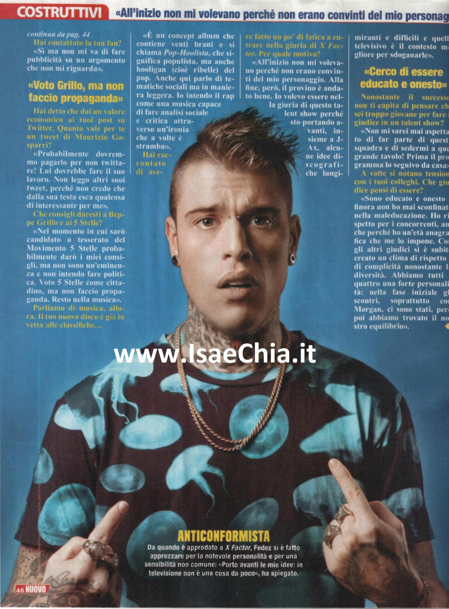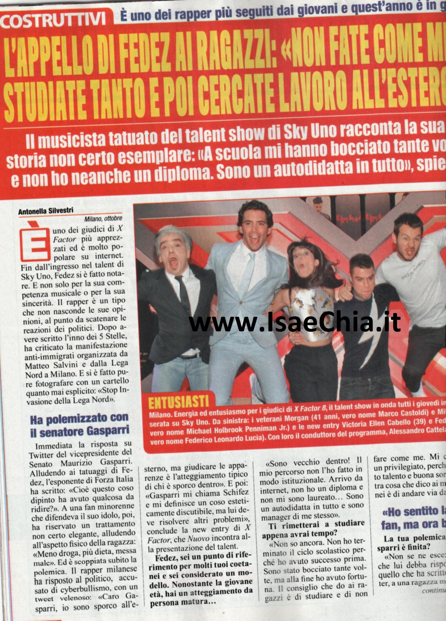 Il rapper Fedez è nella giuria di X Factor, dove si è fatto notare, oltre che per la competenze musicale, anche per la sincerità. Inoltre, è molto attivo politicamente (ha scritto l’inno del Movimento Cinque Stelle) e non ha peli sulla lingua, come ha dimostrato con le sue recenti discussioni in Rete (ha preso le difese di una ragazzina sua fan offesa dal ministro Maurizio Gasparri). Quando gli si fa notare che nonostante la giovane età (25 anni), ha un atteggiamento molto maturo, risponde: “Sono vecchio dentro! Il mio percorso non l’ho fatto in modo istituzionale. Arrivo da internet, non ho un diploma e non mi sono laureato. Sono un autodidatta in tutto e sono il manager di me stesso. Non ho terminato il ciclo scolastico perché ho avuto successo prima e non so ancora se mi rimetterò a studiare. Sono stato bocciato tante volte, ma alla fine ho avuto fortuna. Il consiglio che do ai ragazzi è di studiare e di non fare come me: io sono un privilegiato perché ho avuto una buona sorte. Un’altra cosa che consiglio loro è andare via dall’Italia a cercare lavoro”. Parlando invece della polemica con Gasparri, dice solo: “Non se ne esce! Ho contattato la mia fan, ma non mi va di farmi pubblicità su un argomento che non mi riguarda. Il valore dei tweet di Gasparri? Forse dovremmo pagare per non farlo twittare! Lui dovrebbe fare il suo lavoro. Non leggo altri suoi tweet perché non credo che dalla sua testa esca qualcosa di interessante per me”. Quando invece gli si chiede di dare un consiglio al Movimento 5 Stelle, risponde: “Quando sarò candidato o tesserato del Partito, lo farò. Ma non sono un’eminenza e non intendo fare politica. Voto 5 Stelle come cittadino, ma non faccio propaganda e resto nella musica. Io intendo il rap come una musica capace di fare analisi sociale e critica attraverso un’ironia a volte stramba”. Infine, parla della sua partecipazione al talent: “All’inizio non erano convinti di me come personaggio, ma poi il provino è andato bene. Volevo essere parte di questa giuria perché sto portando avanti, insieme a J-Ax, alcune idee discografiche lungimiranti ma difficili da sdoganare. Non mi sarei mai aspettato di far parte di questa squadra e di sedermi a quel gran tavolo! Prima il programma lo seguivo da casa! Ho rispetto per i concorrenti, anche perché ho un’età anagrafica che me lo impone. Con gli altri giudici si è creato subito un clima di rispetto e complicità nonostante le diversità. Abbiamo tutti e quattro grandi personalità; ci sono stati degli screzi all’inizio con Morgan, ma poi abbiamo trovato il nostro equilibrio”.