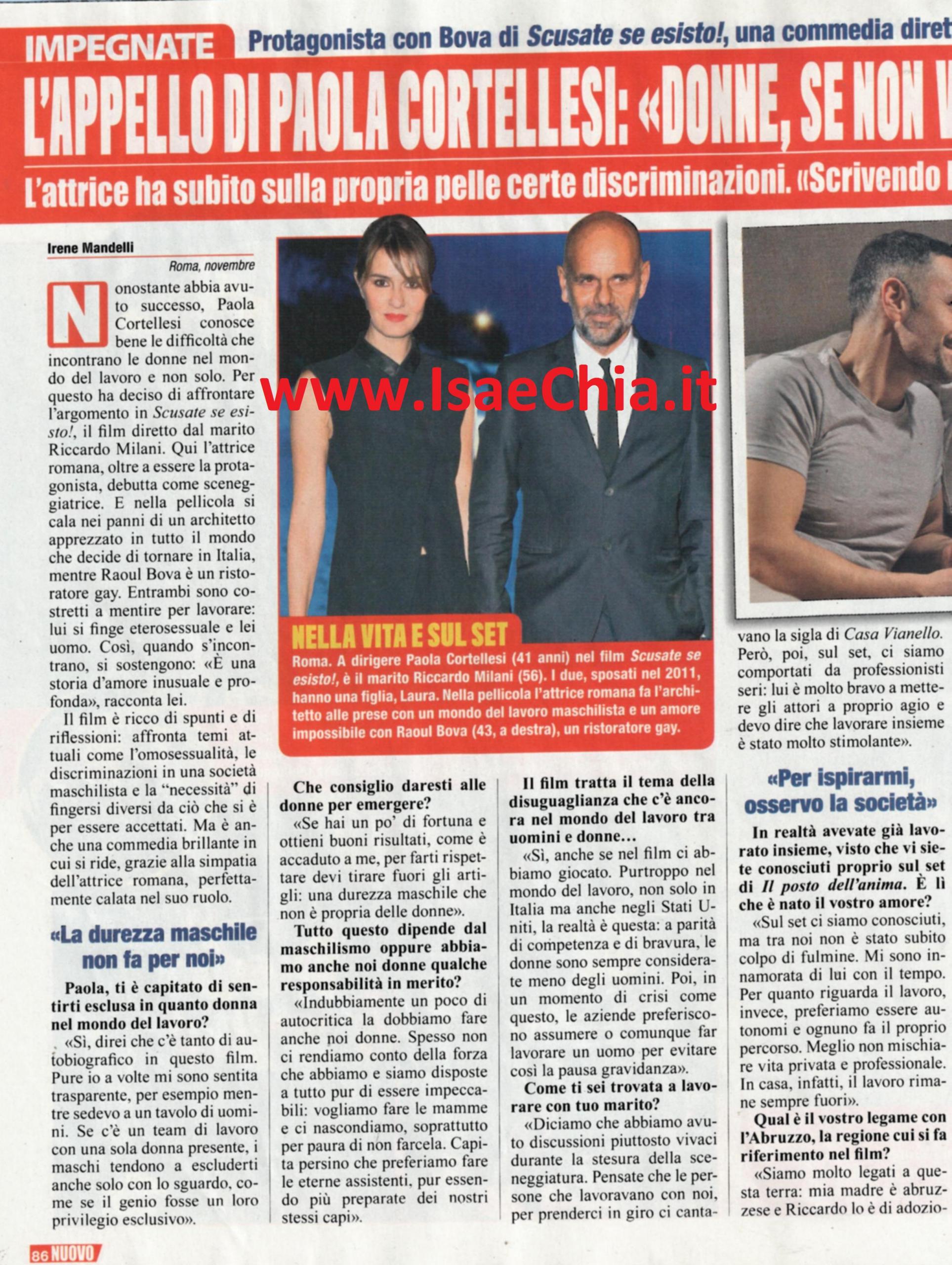 L’attrice Paola Cortellesi affronta il tema delle difficoltà incontrate dalle donne nella vita nel suo ultimo film, Scusate se esisto!, diretto da suo marito, Riccardo Milani. Nel film lei finge di essere un uomo per poter lavorare, mentre Raoul Bova, suo complice, si finge eterosessuale. “C’è tanto di autobiografico in questo film: pure io a volte mi sono sentita trasparente, quando mi sedevo al tavolo con tutti uomini. Se nel team di lavoro c’è una sola donna presente, i maschi tendono ad escluderti. Il consiglio che do alle donne è che se hanno un po’ di fortuna e ottengono buoni risultati, come è successo a me, devono tirare fuori gli artigli. Spesso non ci rendiamo conto della forza che abbiamo. E siamo disposte a tutto per essere impeccabili: vogliamo fare le mamme e ci nascondiamo, per paura di non farcela; capita di fare le eterne assistenti, pur essendo più preparate dei capi. Purtroppo in Italia, così come negli Stati Uniti, a parità di bravura, le donne sono considerate meno degli uomini e le aziende preferiscono evitare la pausa gravidanza”. Quando le si chiede com’è stato lavorare con suo marito, risponde: “Abbiamo avuto discussioni vivaci durante la stesura della sceneggiatura. Chi lavorava con noi, per prenderci in giro, ci cantava la sigla di Casa Vianello. Poi, però, sul set lui ha messo tutti a proprio agio ed è stato molto stimolante. Noi ci siamo conosciuti sul set di Il posto dell’anima, ma non è stato colpo di fulmine, mi sono innamorata col tempo. Nel lavoro preferiamo essere autonomi: ognuno fa il proprio percorso, in casa il lavoro rimane sempre fuori. L’idea del film è nata in casa, confrontandomi con mio marito sulle notizie che riguardano le donne che vediamo in tv. La cosa buffa è che interpreto un architetto: proprio io che non so nemmeno costruire i Lego con mia figlia!”