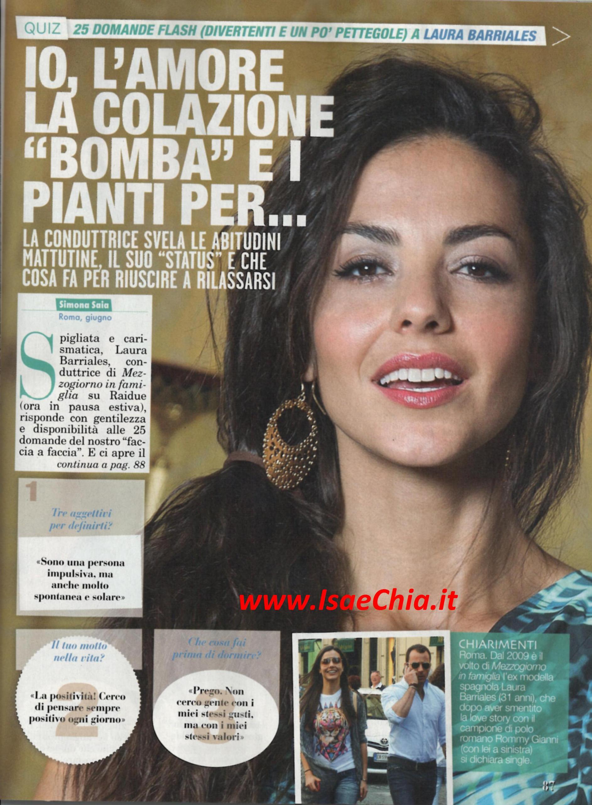 La showgirl Laura Barriales è reduce da un’altra edizione di Mezzogiorno in famiglia ed è attualmente impegnata sul set della fiction Squadra mobile per Canale 5, mentre quest’estate condurrà il tour musicale itinerante Festival Show. Dopo la storia con il campione di polo Rommy Gianni, si dichiara single e si racconta rispondendo a 25 domande flash: “Sono impulsiva, ma anche spontanea e solare. Vorrei cambiare la mia impulsività, perché sono troppo vera per il mondo in cui viviamo. A volte è meglio essere più cinica. Il mio motto è la positività, cerco di pensare sempre positivo ogni giorno. Prima di andare a dormire prego, mentre la mattina faccio una grande colazione, con tre brioches integrali, 4 kiwi, 3 pezzi d’ananas, una pesca e una spremuta gigante! La mia più grande paura è la noia, perché quando c’è non hai più voglia di vivere, ma l’ultima volta che ho pianto è stato quando i miei sono andati via dopo esser venuti a trovarmi qui a Roma per una settimana”. Parlando d’amore, invece, confessa: “Sono gelosa solo se me ne danno motivo; ciò che non perdonerei è la mancanza di rispetto. Tra convivenza e matrimonio scelgo il secondo, perché è un’unione seria, anche per la famiglia. Il mio sogno è diventare mamma! Per colpirmi un uomo non deve essere troppo estroverso: preferisco scoprirlo piano piano”.