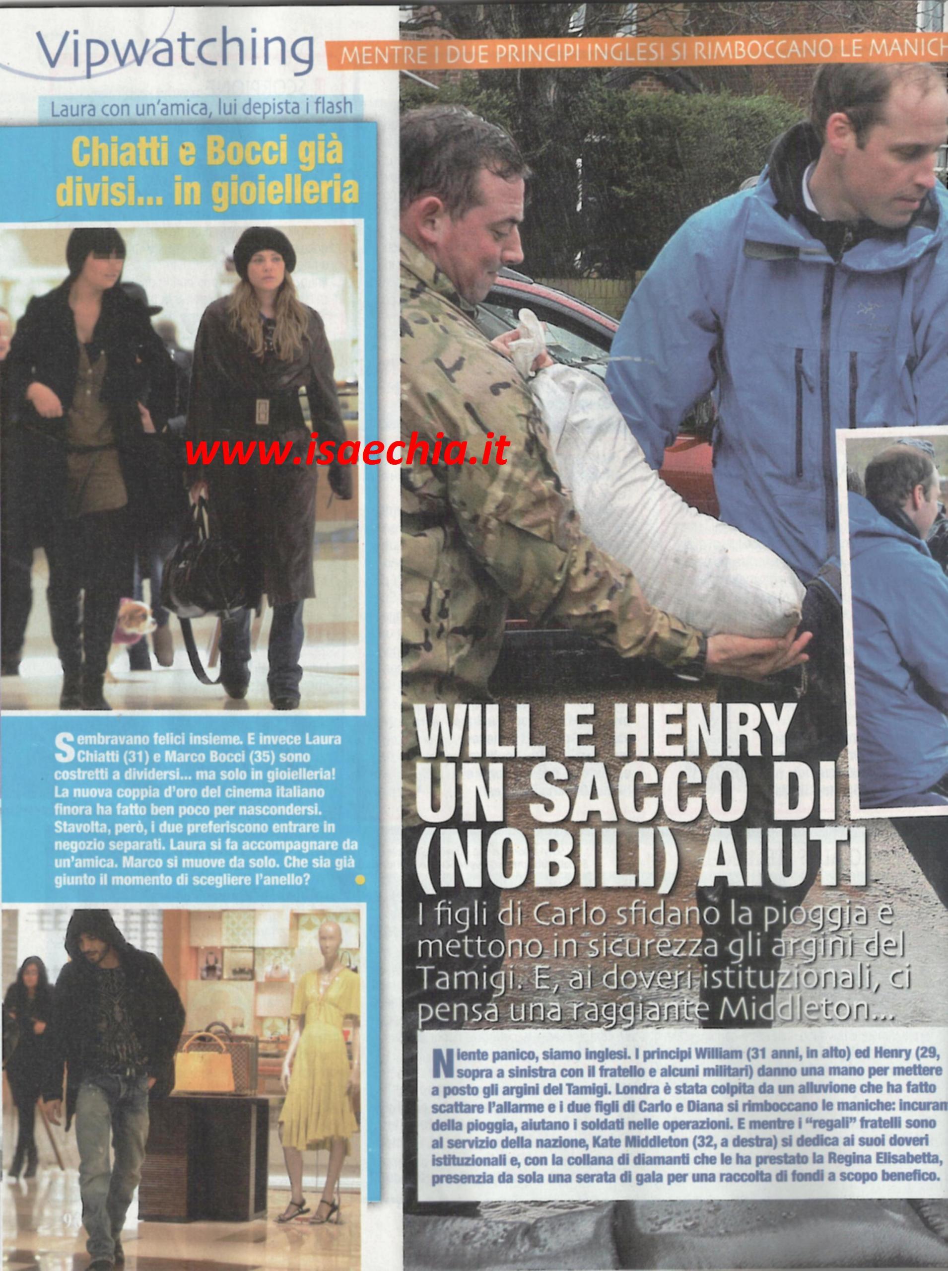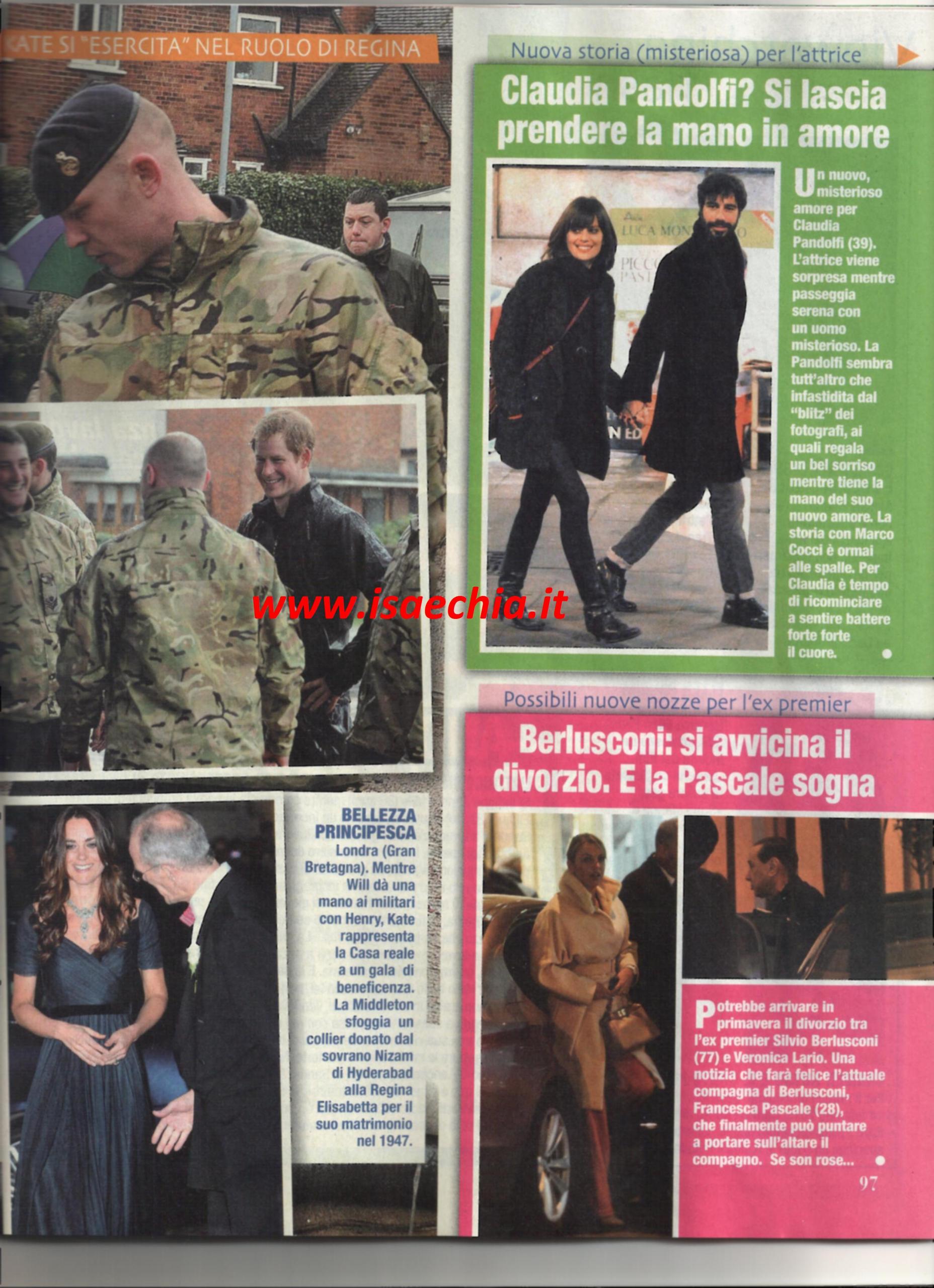 Forse si fidanzerà presto l’attrice Claudia Pandolfi, che è stata fotografata con un nuovo amore, un misterioso moro e regala ai paparazzi un bel sorriso. Odore di nozze anche per Francesca Pascale: l’ex Premier Silvio Berlusconi otterrà in primavera il divorzio dalla moglie Veronica Lario e per lei si apre la possibilità di un matrimonio! Sono invece già felicemente sposati il Principe William d’Inghilterra e Kate Middleton; ma mentre lei rappresenta la Casa Reale ad una serata di beneficenza con un collier che fu donato alla Regina Elisabetta per le sue nozze, il consorte dà una mano, insieme al fratello Henry, a ricostruire le rive del fiume Tamigi distrutto da un alluvione.