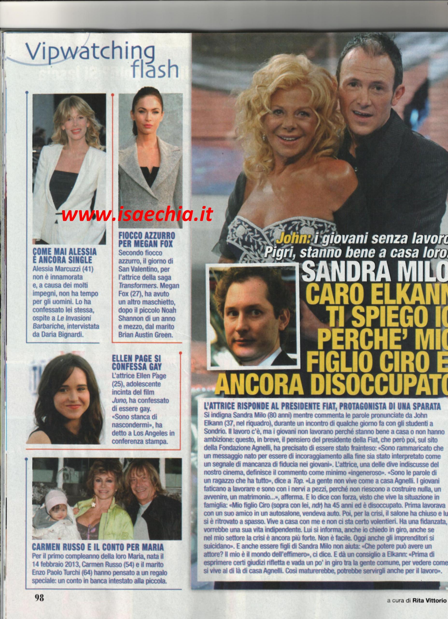 Infine, l’attrice Sandra Milo si scaglia contro il presidente della Fiat John Elkann, che ha detto che i giovani non trovano lavoro perché stanno a casa e non hanno ambizione: “La gente non vive come a casa Agnelli. I giovani faticano a trovare lavoro e sono con i nervi a pezzi. Mio figlio Ciro ha 45 anni ed è disoccupato. Prima vendeva auto, ma l’autosalone ha chiuso per la crisi e si è ritrovato a spasso. Ha una fidanzata, ma vive con me e non ci sta volentieri perché vorrebbe una vita indipendente. Io chiedo in giro, ma anche nel mio settore la crisi è forte: oggi anche gli imprenditori si suicidano. Elkann dovrebbe guardare cosa succede in giro, al di là della casa Agnelli, così maturerebbe e gli servirebbe anche nel lavoro!”