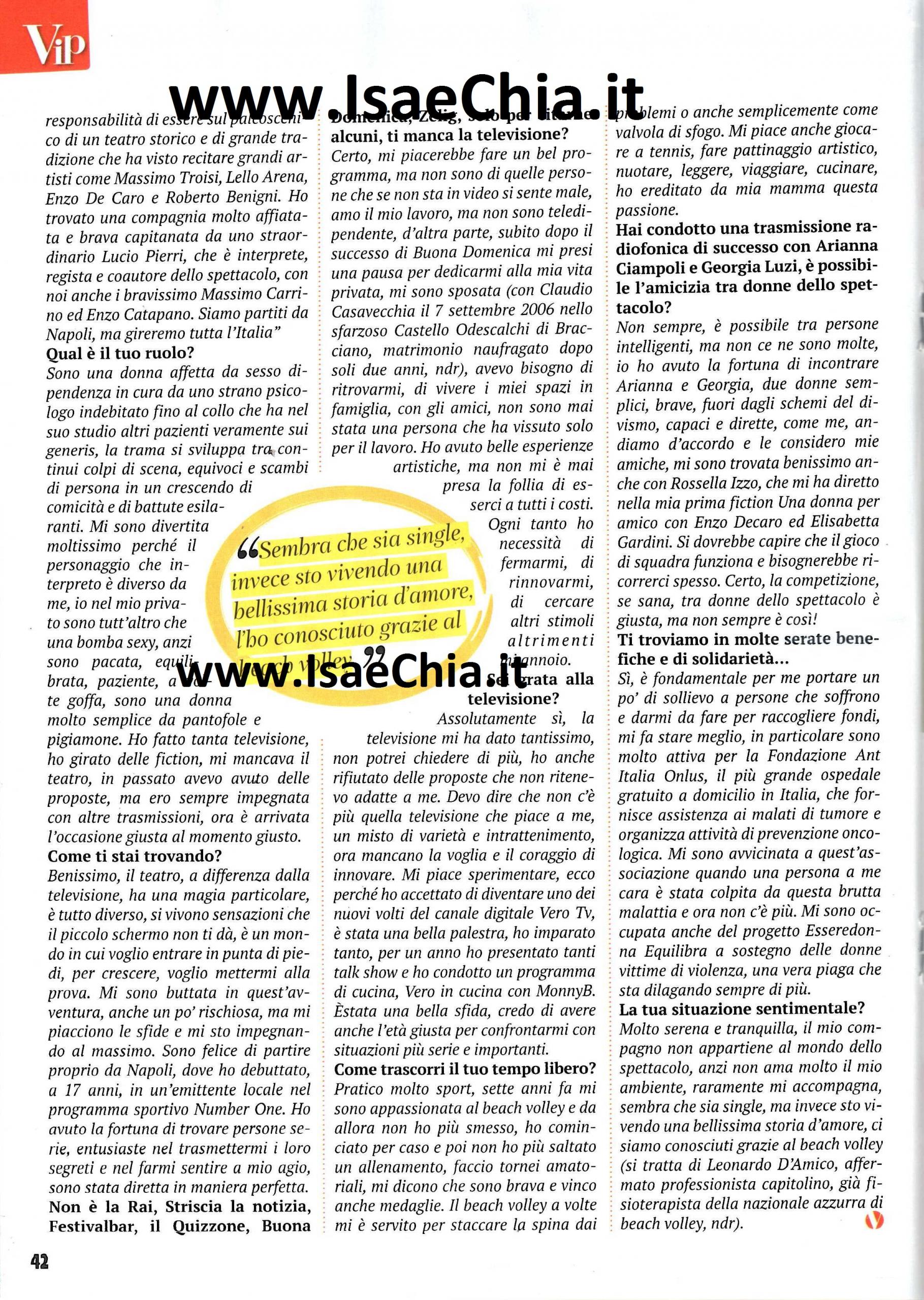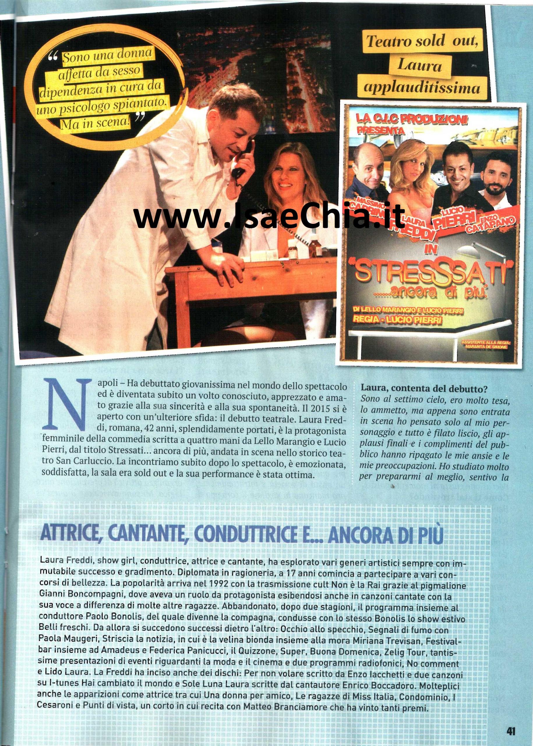 Laura Freddi ha debuttato giovanissima nel lontano 1992 a Non è la Rai, qualche anno dopo è stata una delle Veline di Striscia la notizia e poi è passata per programmi come Scherzi a parte, il Festivalbar, Buona domenica e Zelig, diventando uno dei volti più noti per il pubblico italiano. Adesso, però, la si vede poco in tv perché sta lavorando principalmente a teatro con Stressati, ancora di più, una commedia con la quale ha debuttato a Napoli: “Sono al settimo cielo; ero molto tesa ma appena sono entrata in scena ho pensato solo al mio personaggio e tutto è filato liscio. Ho studiato molto per prepararmi al meglio, sentivo la responsabilità di essere su un palco calcato da Massimo Troisi, Lello Arena, Enzo De Caro e Roberto Benigni. Interpreto una donna affetta da sesso-dipendenza in cura da uno strano psicologo indebitato fino al collo, che ha clienti sui generis. La trama si sviluppa tra colpi di scena, equivoci, scambi di persona e battute esilaranti. Mi sono divertita molto perché è un personaggio molto diverso da me: io sono tutt’altro che una bomba sexy, sono pacata, paziente, a volte goffa, una da pigiama e pantofole! Ho fatto tanta tv, girato delle fiction, ma ora era arrivato il momento del teatro. Il teatro ha una magia particolare, si vivono sensazioni che la tv non ti dà. Mi sono buttata in quest’avventura rischiosa, ma mi piacciono le sfide e mi sto impegnando al massimo“. Quando le si chiede se le manca la tv, Laura risponde: “Certo, mi piacerebbe fare un bel programma, ma non sono di quelle persone che se non sta in video sta male. D’altra parte dopo Buona domenica, mi presi una pausa per dedicarmi alla vita privata, mi sono sposata (anche se è durata due anni), ho ritrovato me stessa. Ogni tanto ho la necessità di fermarmi e sentire nuovi stimoli, altrimenti mi annoio. Sono molto grata alla televisione, ma ho anche rifiutato molte proposte perché non le ritenevo adatte a me. Non c’è più quella tv che piaceva a me, mista di varietà e intrattenimento, mancano la voglia e il coraggio di innovare. Ecco perché ho accettato di lavorare a Vero Tv: è stata una bella palestra, ho presentato tanti talk show e ho condotto un programma di cucina. Inoltre, ho lavorato in radio con Arianna Ciampoli e Georgia Luzi, due donne semplici, brave, fuori dagli schemi del divismo, capaci e dirette come me. Mi sono trovata bene anche con Rossella Izzo, che mi ha diretto nella fiction Una donna per amico. La sana competizione tra donne dello spettacolo è giusta, ma il gioco di squadra funziona!“. Infine, la Freddi parla della sua situazione sentimentale: “E’ molto serena: il mio compagno Leonardo D’Amico non appartiene al mondo dello spettacolo e non ama quest’ambiente: ci siamo conosciuti grazie al beach volley. Raramente mi accompagna e sembra che io sia single, invece sto vivendo una bellissima storia d’amore!“.