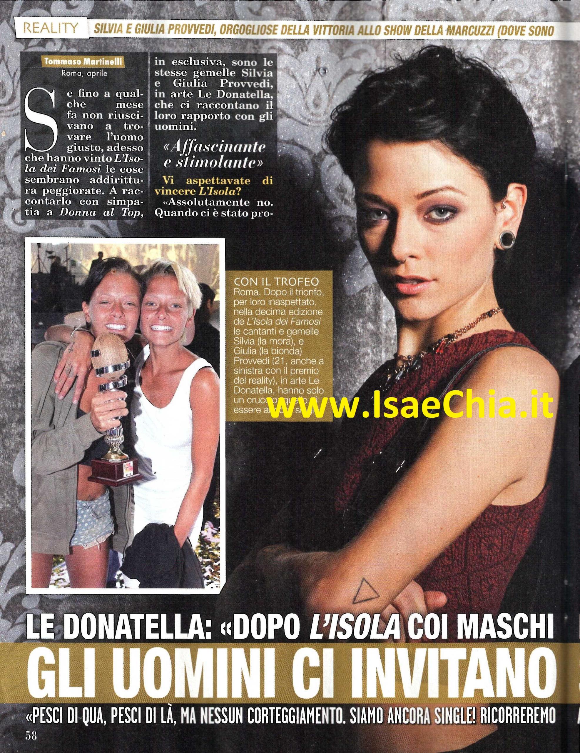 Hanno lottato con tutte le loro forze e alla fine sono uscite vittoriose: sovvertendo i pronostici iniziali, le Donatella hanno vinto l’Isola dei famosi 10. Quando si chiede al duo se si aspettavano la vittoria, le gemelle rispondono: “Assolutamente no. Quando ci hanno proposto di partecipare, abbiamo accettato subito convinte di poter vivere un’esperienza diversa dal solito, ma non fino alla finale. Un’esperienza che, tornando indietro, rifaremmo sicuramente, perché si è rivelata stimolata ed affascinante anche se faticosa: le difficoltà non sono mancate. Avendo vissuto sempre insieme, noi ci conoscevamo già a fondo, ma è stato interessante avere la conferma della nostra capacità di adattamento alle varie situazioni e anche il nostro non tirarci indietro davanti alle prove più dure. All’inizio non pensavamo affatto alla vittoria; man mano ci siamo accorte che andavamo d’accordo con tutti i concorrenti ma il fatto di esser simpatiche agli altri naufraghi non significava esserlo ai telespettatori. Il giorno della finale, tornate a Milano, siamo rimaste senza parole per tutto l’affetto e l’incoraggiamento nei nostri confronti“. Quando si chiede loro se è stato imbarazzante spogliarsi su Playa Desnuda, dove sono state alcuni giorni in compagnia di Brice Martinet, le due rispondono: “No, anche se non siamo certo tipe che si mettono in topless, quando ci hanno detto che saremmo andate su Playa Desnuda non ci siamo perse d’animo. La prima notte è stata un disastro perché con le foglie non siamo riuscite a crearci un vestito decente, poi abbiamo fatto leva sul nostro spirito creativo e grazie alla sacca dell’acqua di Brice siamo riuscite a coprirci“. Quando si chiede loro se è stata almeno una rivincita nei confronti del talent X Factor, al quale hanno partecipato alcuni anni fa ma senza arrivare in finale, le due “twins” rispondono: “In realtà anche se la nostra partecipazione ad X Factor non si è conclusa con la vittoria, di certo non la consideriamo una sconfitta, anche perché ci ha permesso di conoscere, tra gli altri, il grande Luca Tommassini e le sue fantastiche coreografie. La nostra estate si preannuncia piena di impegni, che però non possiamo ancora annunciare. Prima dell’Isola avevamo partecipato come giurate al programma Tacco 12 e di recente siamo state ospiti di Colorado, ma la nostra priorità rimane la musica“. E gli uomini? Quando si chiede loro come va la vita amorosa, purtroppo Giulia e Silvia Provvedi rispondono: “Siamo ancora entrambe single. Se prima spaventavamo gli uomini, adesso che abbiamo vinto l’Isola le cose sono alquanto peggiorate. Adesso ci invitano tutti a pesca insieme! Mai qualcuno che dica ‘Che belle ragazze’ o qualcosa del genere. Arrivano solo inviti a pescare, ma nessun corteggiamento! Forse a breve ricorreremo a un bel processo di ristrutturazione“.