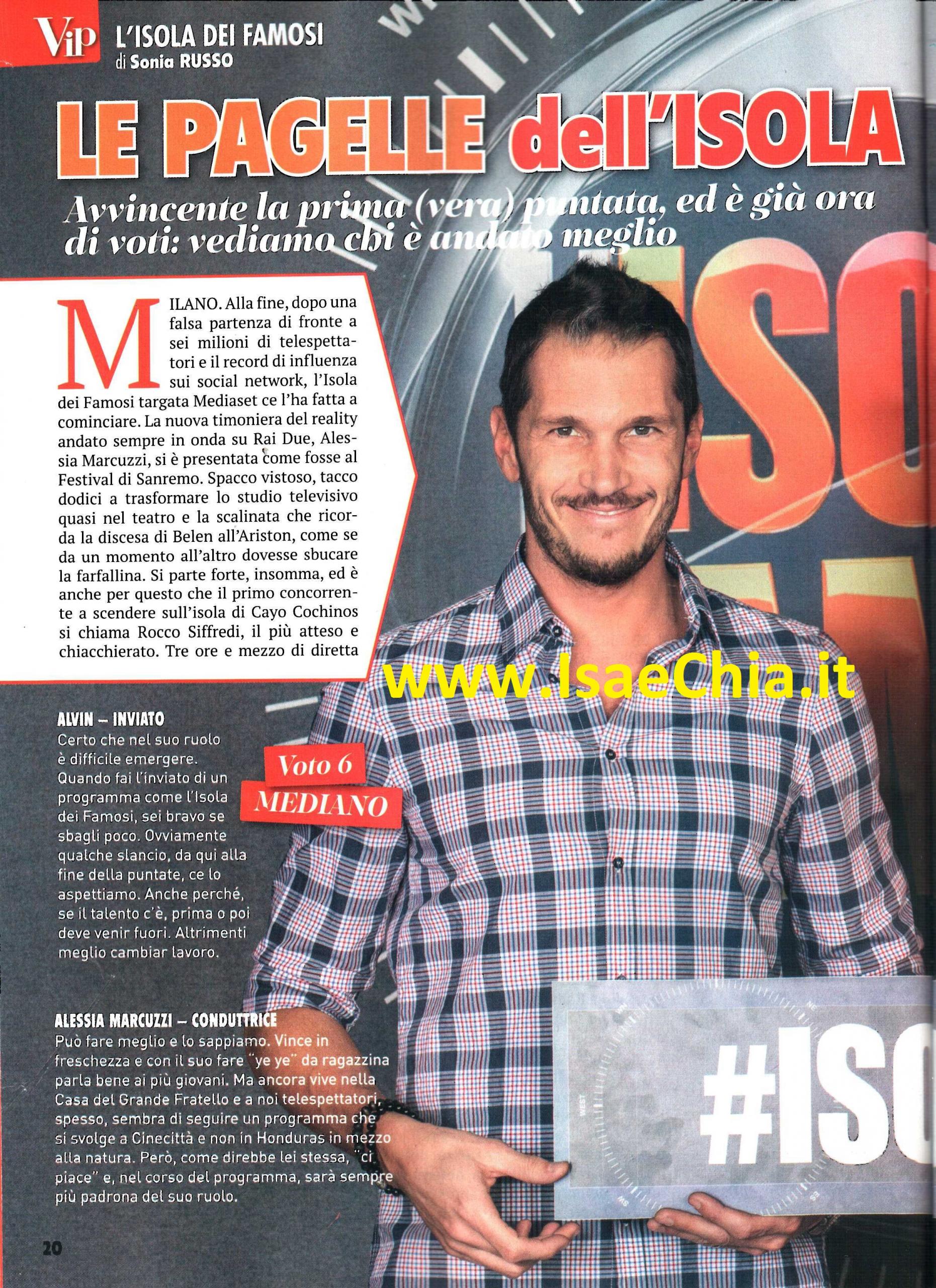 Dopo una prima puntata “pilota” durante la quale è stata mostrata l’isola in preda al maltempo ed è stato rimandato ufficialmente l’inizio del reality, L’Isola dei Famosi numero 10 è finalmente iniziata. Durante la prima puntata ufficiale, andata in onda lo scorso 2 febbraio, i dodici concorrenti ospiti di Cayo Paloma sono giunti a destinazione e sono stati presentati al pubblico; tra una prova e l’altra, però, la puntata si è conclusa con le nomination, che hanno mandato al televoto Valerio Scanu e Patrizio Oliva. Contemporaneamente alla seconda puntata, andata in onda invece lo scorso lunedì, la rivista Vip ha dato i suoi voti relativi alla prima. La conduttrice Alessia Marcuzzi e il suo inviato in Honduras Alvin si fermano giusto alla sufficienza: “Certo, nel ruolo di Alvin è difficile emergere; in questo programma sei bravo se sbagli poco. Certo, qualche slancio da qui alla fine ce lo aspettiamo, anche perché se il talento c’è, deve venir fuori. Altrimenti meglio cambiar lavoro! La Marcuzzi vince col suo fare da ragazzina, ma ancora vive nella Casa del Grande fratello e ai telespettatori sembra di seguire un programma che si svolge a Cinecittà, anziché su un’isola deserta. Può dare di più, nel corso del programma sarà più padrona del suo ruolo“. Per Catherine Spaak, che ha annunciato il suo ritiro ancor prima di iniziare la gara e dopo una settimana di attesa in Honduras, il giudizio è severo: “Non un aggettivo per lei, ma il nome del duo che vinse Sanremo di cui si sono perse le tracce: Jalisse. Anche per lei è andata così: la signora dell’Isola ha lasciato il reality in mezzo allo stupore generale e di lei non si ricorderà niente. Quando si parte per un’esperienza come questa, i rischi si conoscono, mica è una vacanza!“. Un bel 7 d’incoraggiamento, invece, per i primi due nominati: “Dispiace per la nomination di entrambi. Vivaci e con la battuta pronta, sia l’ex concorrente di Amici che il pugile napoletano hanno le caratteristiche per piacere al pubblico. Ha ragione Signorini quando dice che per strategia, i compagni hanno nominato i più forti?“. Per ora, Oliva ha dovuto cedere il posto e Scanu è già di nuovo al televoto, stavolta con Charlotte Caniggia. Proprio a quest’ultima, il settimanale dà un giudizio…stupefacente: “Sexy quanto basta, leggera e sorridente, un mix tra originalità, leggerezza e clownismo, quanto basta per mettersi in mostra. Sarà tra i protagonisti del programma: 8“. E un 8 va anche a Cecilia Rodriguez e Brice Martinet, che gareggiano sulla Playa Desnuda senza abiti: “Aver accettato la sfida di Playa Desnuda è già un successo. Lei è stata più titubante, ma non ci sono state scenate eccessive, anzi, in alcuni momenti ci hanno fatto ridere, trasmettendo le basi per un buon affiatamento“. Ed è ottimo anche il giudizio nei confronti degli opinionisti: “Il loro compito è quello di accendere toni ed emozioni e lo hanno fatto bene, alternandosi nei ruoli di buono e cattivo. Alfonso Signorini è sempre il solito, ma efficace. Mara Venier simpatica e senza peli sulla lingua“. Infine, questi sono i giudizi sintetici per gli altri concorrenti: “Rocco Siffredi, il più atteso, 6: per ora ci ha regalato troppo poco. Pierluigi Diaco 5: logorroico, fa di tutto per dimostrarsi simpatico, ma ottiene l’effetto contrario. Fanny Neguesha 6: la più sexy, per ora nelle retrovie. Rachida Karrati 5.5, ma crediamo che il suo carattere emergerà. Alex Belli: 7, guerriero, ma speriamo non si sgonfi. Andrea Montovoli, Melissa Panarello e Le Donatella: giudizio sospeso. Nella prima puntata sono stati poco più che fantasmi“.