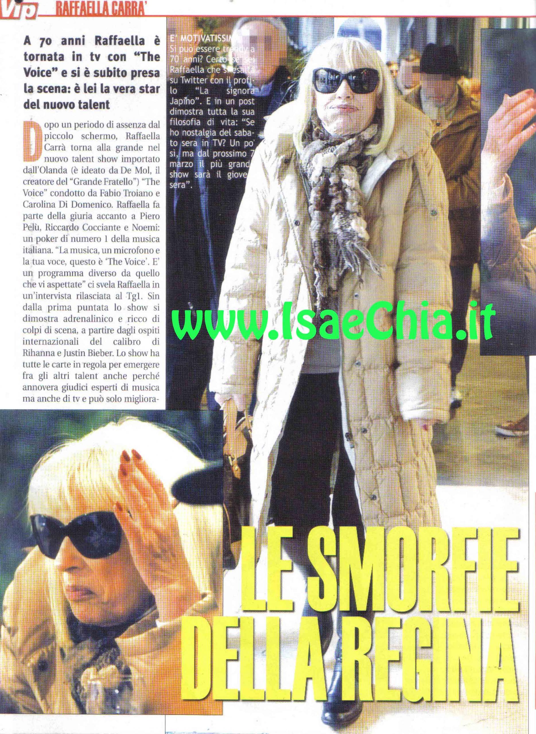 Dopo un periodo di assenza dal piccolo schermo, Raffaella Carrà torna a 70 anni e lo fa da regina del nuovo talent, The Voice. Intervistata a proposito, ha dichiarato: “La musica, un microfono e la tua voce. Questo è The voice!” e lo show ha tutte le carte in regola per emergere, poiché nella sua giuria ci sono esperti non solo di musica, ma anche di tv. Lei, la Raffa, si è subito distinta e si è presentata piena di energia e vitalità. E così è stata beccata pure per le strade di Milano: prima sbuffa, poi fa una smorfia di disgusto, infine gesticola mentre una fuma una sigaretta col compagno Sergio Japino.