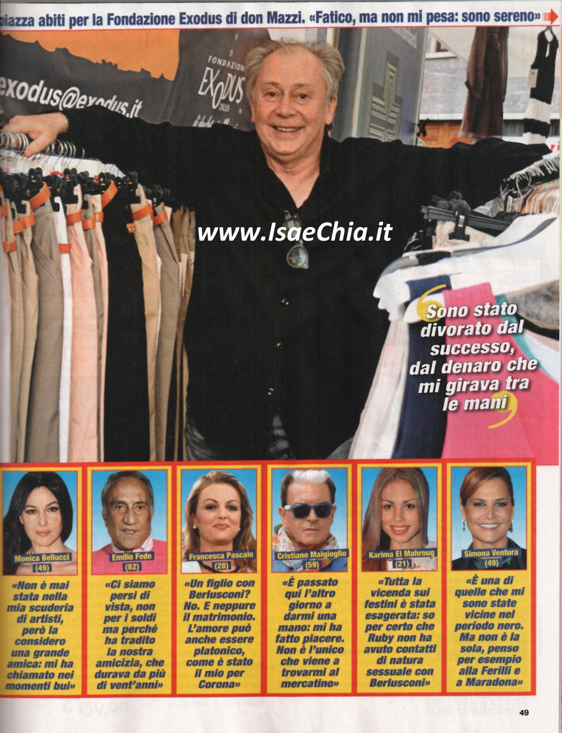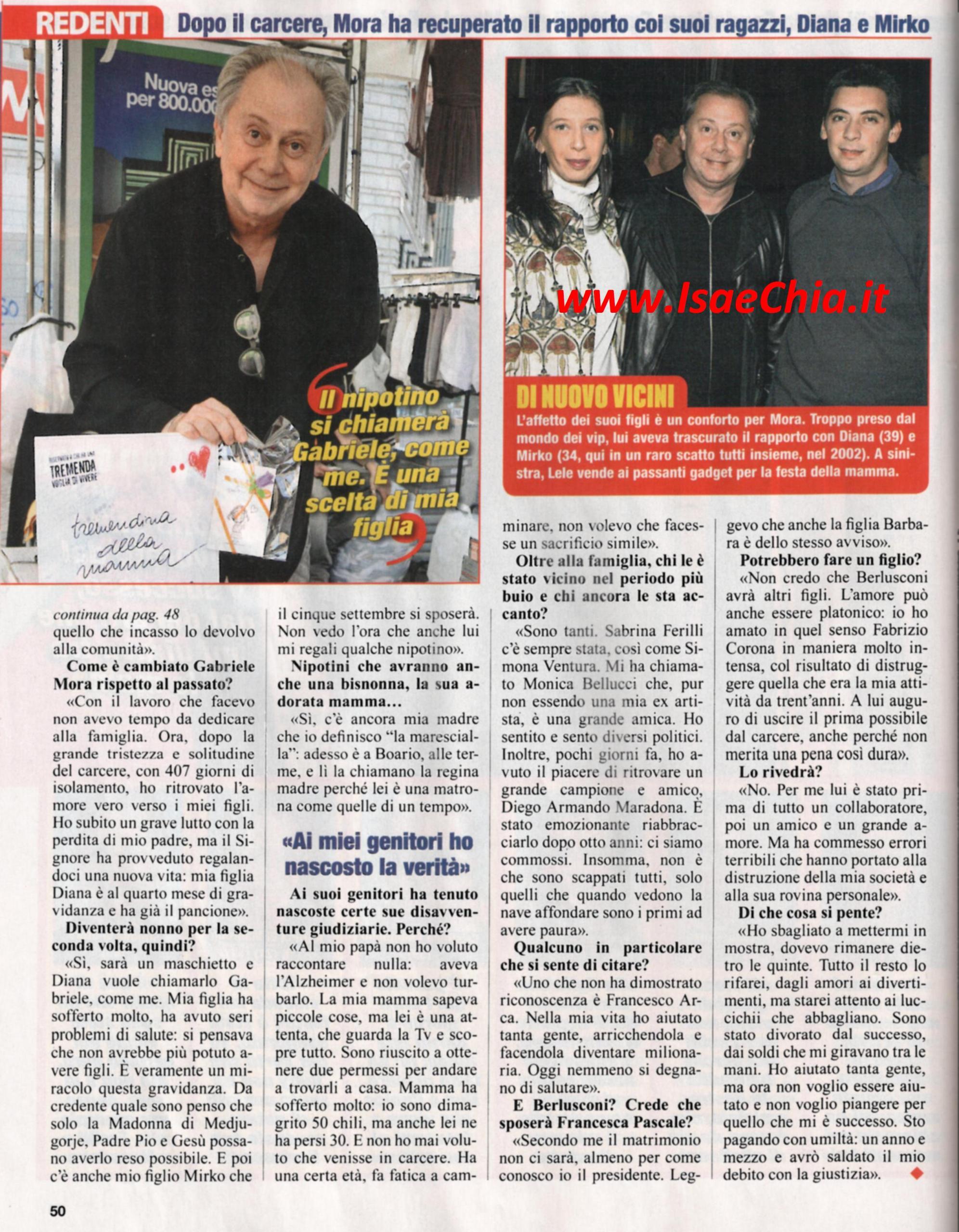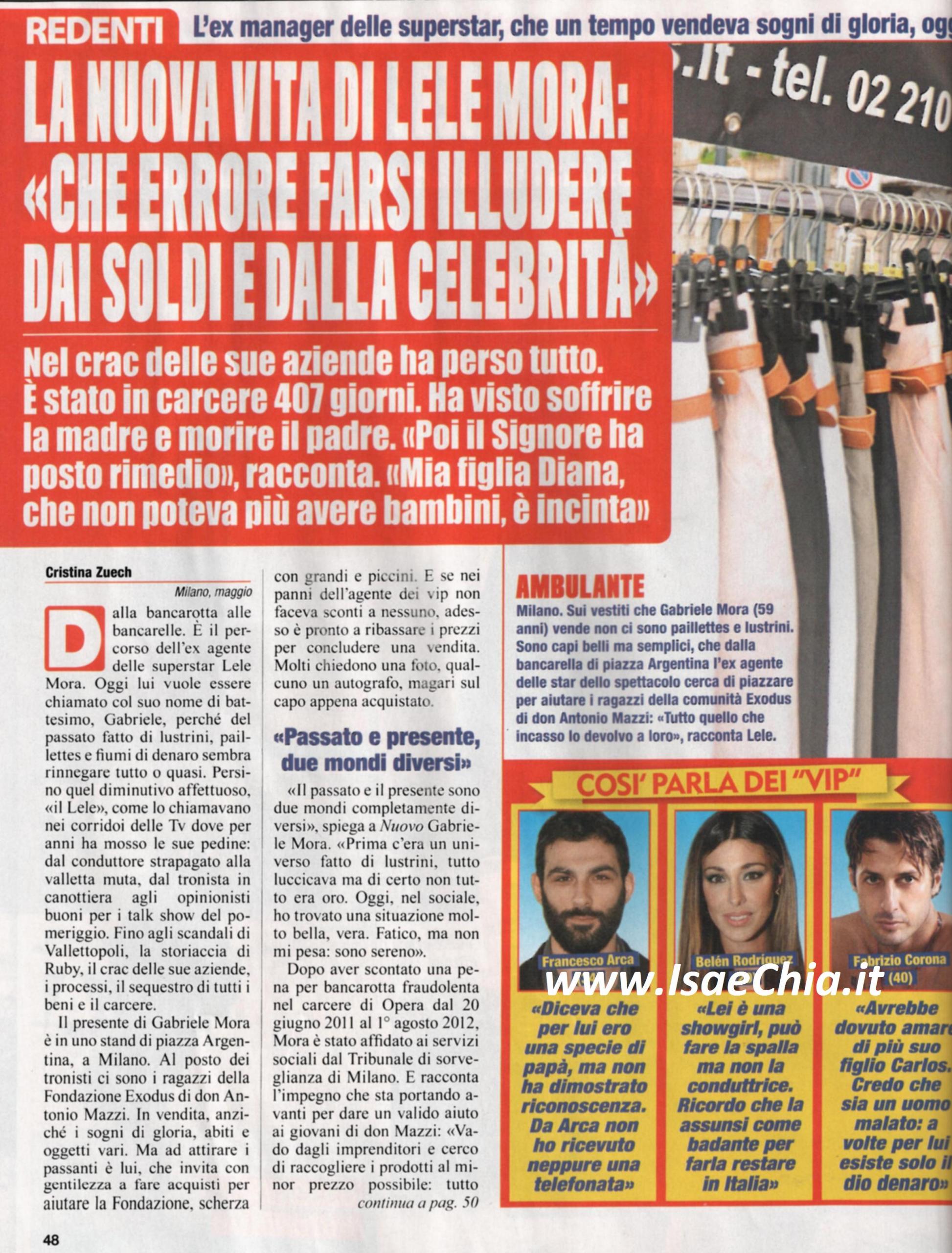 L’ex agente dei vip Lele Mora, che ora preferisce farsi chiamare Gabriele, ha cambiato vita dopo un periodo di reclusione in carcere: “Prima c’era un universo fatto di lustrini, tutto luccicava, ma di certo non era oro. Oggi nel sociale ho trovato una situazione molto bella. Fatico, ma non mi pesa, sono sereno. Ora ho ritrovato l’amore verso la mia famiglia e i miei figli. Ho subito il lutto di mio padre, ma mia figlia Diana è in attesa da 4 mesi. Lei ha avuto problemi di salute e si pensava che non avrebbe potuto avere figli: è veramente un miracolo. Mio figlio Mirko si sposerà il 5 settembre e non vedo l’ora che arrivi qualche altro nipotino. Ai miei genitori ho tenuto nascoste le mie vicende giudiziarie: mio padre aveva l’Alzheimer e non volevo turbarlo. Mia mamma ha capito e se io ho perso 50 chili, anche lei ne ha persi 30. In tanti mi sono stati vicini: Sabrina Ferilli e Simona Ventura ci sono sempre state. Mi ha chiamato anche Monica Bellucci, ho sentito e sento diversi politici e ho riabbracciato dopo otto anni un grande amico: Diego Armando Maradona. Uno che non ha dimostrato riconoscenza è l’ex tronista Francesco Arca: nella vita ho aiutato tanta gente arricchendola e facendola diventare milionaria. Oggi nemmeno si degnano di salutare”. Quando gli si chiede se secondo lui Silvio Berlusconi sposerà Francesca Pascale, risponde: “Non credo, anche sua figlia Barbara è dello stesso avviso. L’amore può anche essere platonico: io ho amato in tal senso Fabrizio Corona, in modo molto intenso, col risultato di distruggere quella che era la mia attività di trent’anni. A lui auguro di uscire quanto prima dal carcere, perché non lo merita. Per me è stato un collaboratore, un grande amico e un grande amore, ma ha commesso errori terribili che hanno portato alla distruzione della mia società e alla sua rovina personale. Ho sbagliato a mettermi in mostra, sarei dovuto rimanere dietro le quinte, il resto lo rifarei. Sono stato divorato dal successo, dai soldi che mi giravano tra le mani. Ho aiutato tanta gente, ma ora non voglio essere aiutato. Sto pagando con l’umiltà e tra un anno e mezzo il mio conto con la giustizia sarà saldato”.