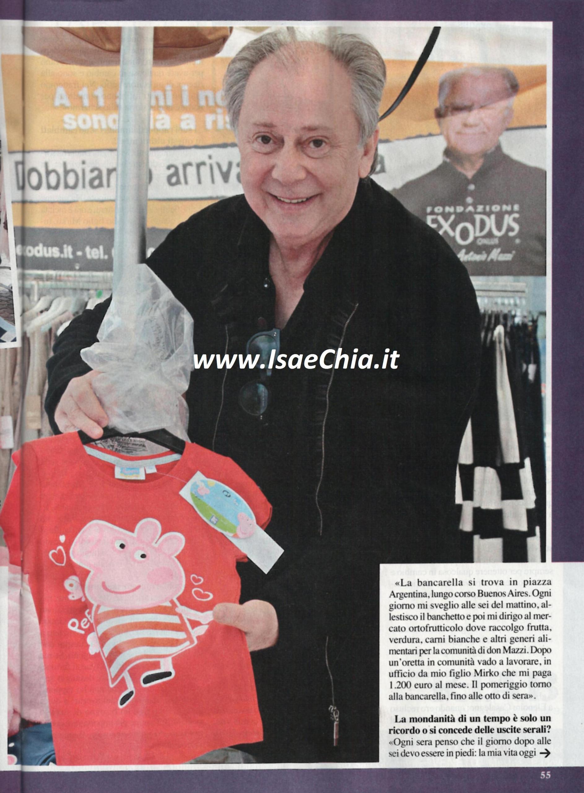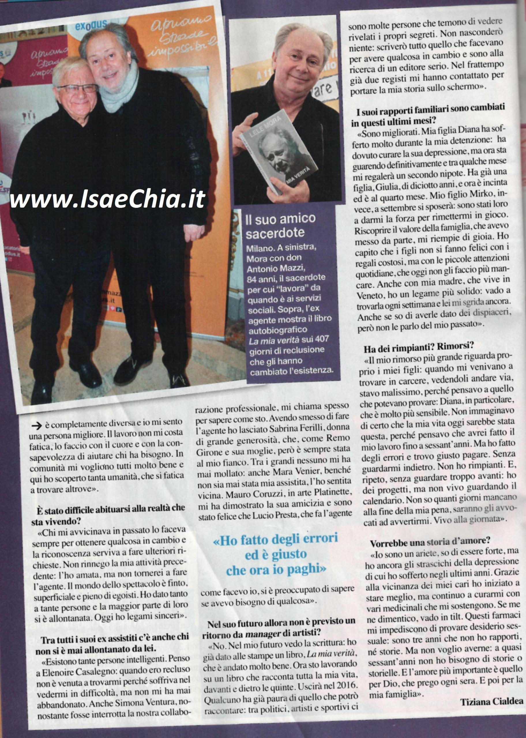 Dopo esser stato condannato nel 2011 per bancarotta fraudolenta ed evasione fiscale, Lele Mora è tornato sulla scena con un’iniziativa che ha suscitato curiosità: “Per aiutare la comunità Exodus mi sono inventato una bancarella della solidarietà, coinvolgendo amici imprenditori che donano, abiti, oggettistica, accessori e li vendono dietro un’offerta libera. Questo progetto mi ha dato nuovo entusiasmo, perché il successo cresce e don Mazzi, fondatore dell’associazione, è contento come me. Mi sveglio ogni mattina alle 6, allestisco la bancarella e poi vado al mercato a comprare frutta, verdura e alimentari per l’associazione. Lavoro nell’ufficio di mio figlio Mirko, che mi dà 1200 euro al mese, poi il pomeriggio torno alla bancarella. Ogni sera penso che il giorno dopo devo essere in piedi e la mia vita oggi è completamente diversa da quella di prima: ho amato la mia attività precedente, ma non tornerei a fare l’agente delle star: il mondo dello spettacolo è finto, superficiale, pieno di egoisti. Ci sono anche persone che mi sono sempre state vicine: Platinette, Elenoire Casalegno, Simona Ventura, Mara Venier, Remo Girone e sua moglie, Sabrina Ferilli, l’agente Lucio Presta. Nel mio futuro vedo la scrittura: ho già pubblicato un libro ed è andato bene. Ora sto lavorando ad un libro che racconterà tutta la mia vita e uscirà nel 2016. Qualcuno ha paura di quello che potrò raccontare: non nasconderò niente, scriverò tutto ciò che facevano per avere qualcosa in cambio e cerco un editore serio. Nel frattempo mi hanno contattato due registi per portare la mia storia sugli schermi. Ora ho riscoperto i miei figli e la mia famiglia, compresa mia madre. I miei rimorsi riguardano loro, perché quando ero in carcere li vedevo stare male per me. Ho ancora degli strascichi di depressione, di cui ho sofferto negli ultimi anni e se mi dimentico dei medicinali vado in tilt. Questi medicinali mi impediscono di avere desideri sessuali: sono tre anni che non ho rapporti, né storie. Ma non voglio averne. A 60 anni non ho bisogno di storie: l’amore più importante è quello per Dio, che prego ogni sera, e per la mia famiglia”.