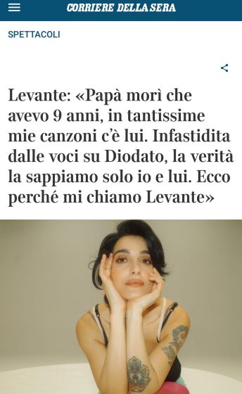 Levante fa addirittura tre stories contro il Corriere perché ha titolato sull’ex Diodato e sul padre. I social in mano a questi “artisti” sono pericolosi per la loro credibilità. La prossima volta il titolo glielo dice lei, così è contenta.