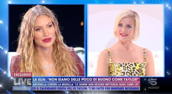 ‘Live – Non è la D’Urso’, confronto super trash tra Taylor Mega e Antonella Elia che stronca il calendario dell’influencer: “Spogliarsi contro la violenza sulle donne è come fotte*e per la verginità!”(Video)