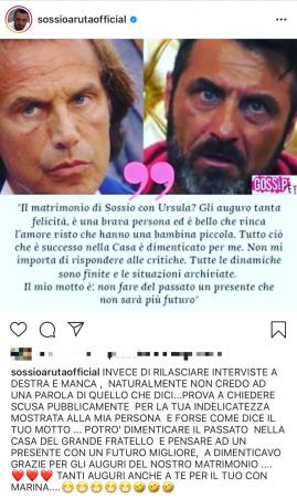 Intanto a fare dell’ironia sulle nozze saltate tra Antonio e la sua dolce metà ci ha pensato anche l’ex gieffino Sossio Aruta, che sui social – commentando un’intervista in cui Zequila sembrava deporre l’ascia di guerra nei suoi riguardi – ha dichiarato: “Non credo ad una parola di quello che dici, prova a chiedere scusa pubblicamente per l’indelicatezza mostrata verso di me e forse come dice il tuo motto potrò dimenticare quello che è successo al Gf. Ah dimenticavo, grazie per gli auguri per il nostro matrimonio e tanti auguri anche a te per il tuo con Marina!”.