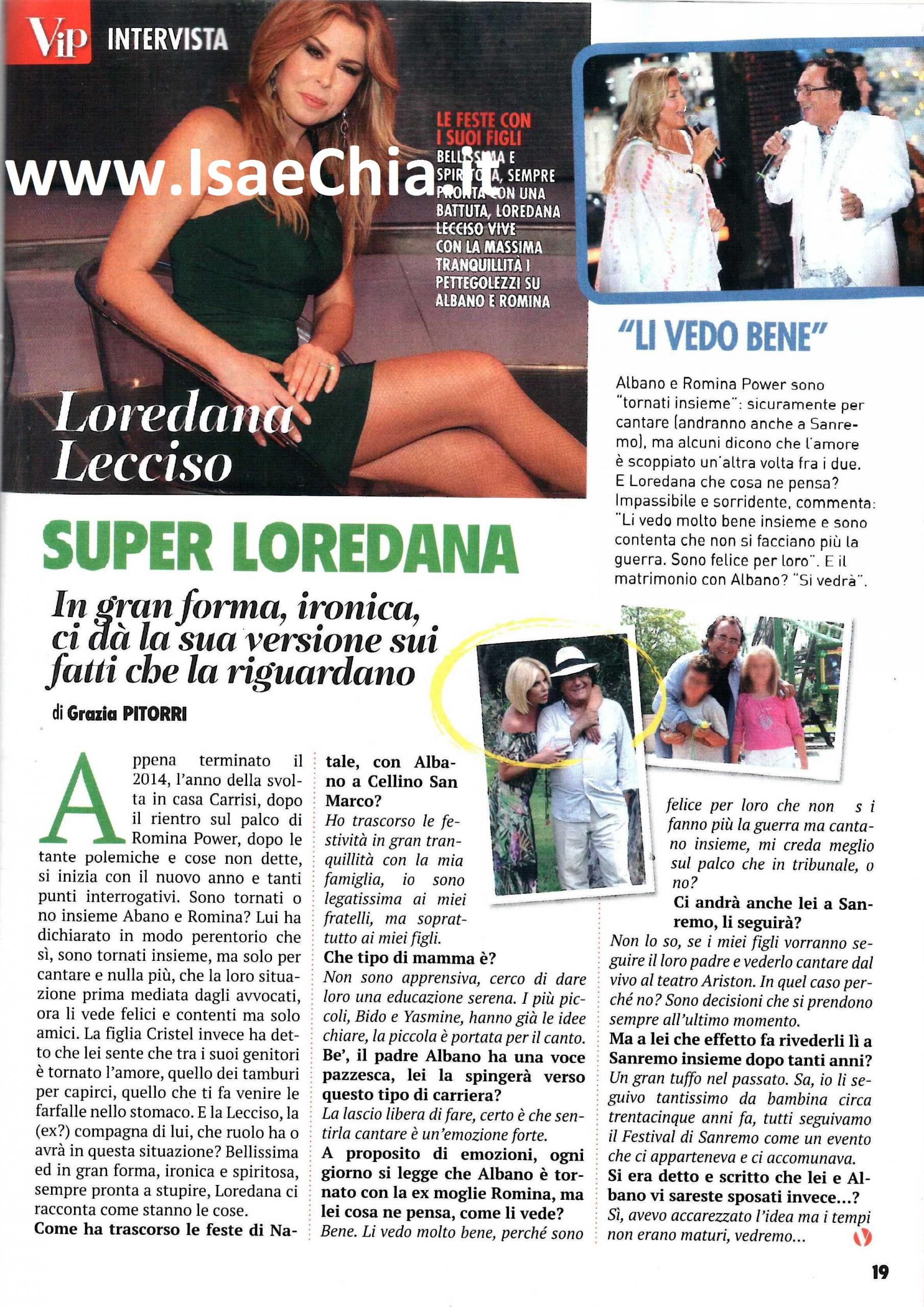 Tra i tanti eventi dello spettacolo importanti del 2014, c’è sicuramente il ritorno della coppia formata da Al Bano e Romina Power: i due ex coniugi, infatti, hanno fatto pace dopo anni di tensione e si sono esibiti di nuovo in pubblico per una serie di concerti. Ma quando se tra i due c’è anche un ritorno di fiamma, il cantante di Cellino San Marco risponde perentorio: “Solo per cantare e nulla più”. Quanto alla situazione con Loredana Lecciso, la donna da cui Al Bano ha avuto altri due figli, essa pare ancora più misteriosa. La showgirl aveva fatto intendere che lei e Al Bano si vedevano ancora, pur non vivendo insieme (QUI per rileggere l’intervista); in un primo momento si era parlato di matrimonio, ma l’idea è stata poi definitivamente accantonata: “Avevamo accarezzato l’idea, ma i tempi non erano maturi. Vedremo…” dice lei a proposito. Nel frattempo, Loredana racconta: “Ho trascorso le feste natalizie in tranquillità, in compagnia della mia famiglia: io sono legatissima ai miei fratelli ma soprattutto ai miei figli. Non sono una mamma apprensiva, ma cerco di dare loro un’educazione serena. Jasmine ha le idee chiare: è portata per il canto, come suo padre. Io la lascio libera di fare: sentirla cantare è una grande emozione“. Sul ritorno della coppia Al Bano-Romina si esprime così: “Li vedo molto bene. Sono felice che non si facciano più la guerra, ma cantano insieme. Meglio sul palco insieme che in tribunale, no?“. E se fossero davvero ospiti sul palco dell’Ariston al Festival di Sanremo? “Per me sarebbe un gran tuffo nel passato: li seguivo tantissimo da bambina, 35 anni fa. Se i miei figli vorranno seguire il padre che canta a Sanremo, in quel caso perché non dovrei esserci? Sono decisioni che si prendono sempre all’ultimo momento“.