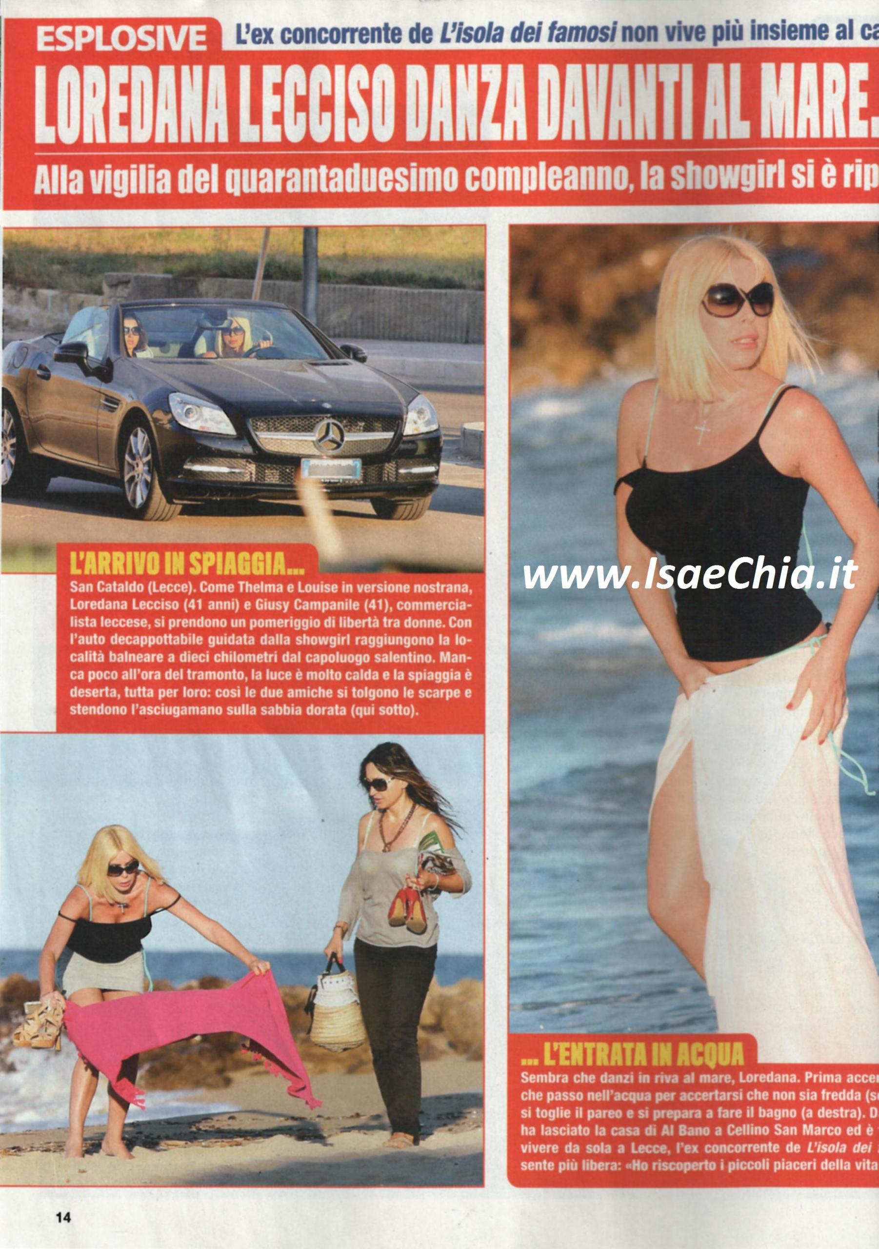 Alla vigilia dei 42 anni, Loredana Lecciso è più in forma che mai: eccola sulla spiaggia di San Cataldo (LE), con l’amica Giusy Campanile, commercialista. Le due, come Thelma e Louise, arrivano su un’auto decappottabile; la spiaggia è deserta perché sono quasi al tramonto, stendono un asciugamano e l’ex concorrente dell’Isola dei famosi si prepara ad un bagno. Prova l’acqua, gioca con l’amica schizzando e sembra una ragazzina. Quando glielo si fa notare, spiega i cambiamenti che ci sono stati nella sua vita: pare, infatti, che abbia lasciato la tenuta di Cellino San Marco dell’ex (?) compagno Al Bano. “Ultimamente ho riconquistato una bella tranquillità interiore, che mi accompagna dalle piccole cose alle grandi cose dell’esistenza. Sono serena e ho raggiunto questo stato psicologico in modo naturale. Facendo un bilancio dei miei 42 anni, non ho rimpianti, però ho avuto l’impressione che la mia vita scivolasse troppo velocemente. Io mi sono sposata giovanissima con Fabio Cazzato, poi mi sono messa con Al Bano e ho avuto altri due figli. Ma era come se avessi fretta e non mi godevo niente, così ho deciso di fermarmi”. Quando le si chiede chiaramente se lei e Al Bano sono una coppia o si considera single, risponde: “Non mi sento di incasellare o definire la nostra storia. Direi che abbiamo alleggerito il nostro rapporto, che è più maturo. Qualche giorno fa lui è venuto a casa mia e siamo rimasti un paio d’ore a parlare. E’ stato bellissimo, molto meglio degli ultimi due mesi a Cellino, dove c’erano giorni in cui nemmeno parlavamo. I miei figli sono rimasti lì, ma la vivono benissimo, perché sono abituati agli spostamenti miei e del padre. Mi vengono a trovare spesso e io vado spesso da loro. Non sono gelosa del riavvicinamento tra Al Bano e la sua ex moglie Romina Power: per anni si sono guadati in cagnesco nelle aule del tribunale, io preferisco che oggi si sorridano sul palco”.
