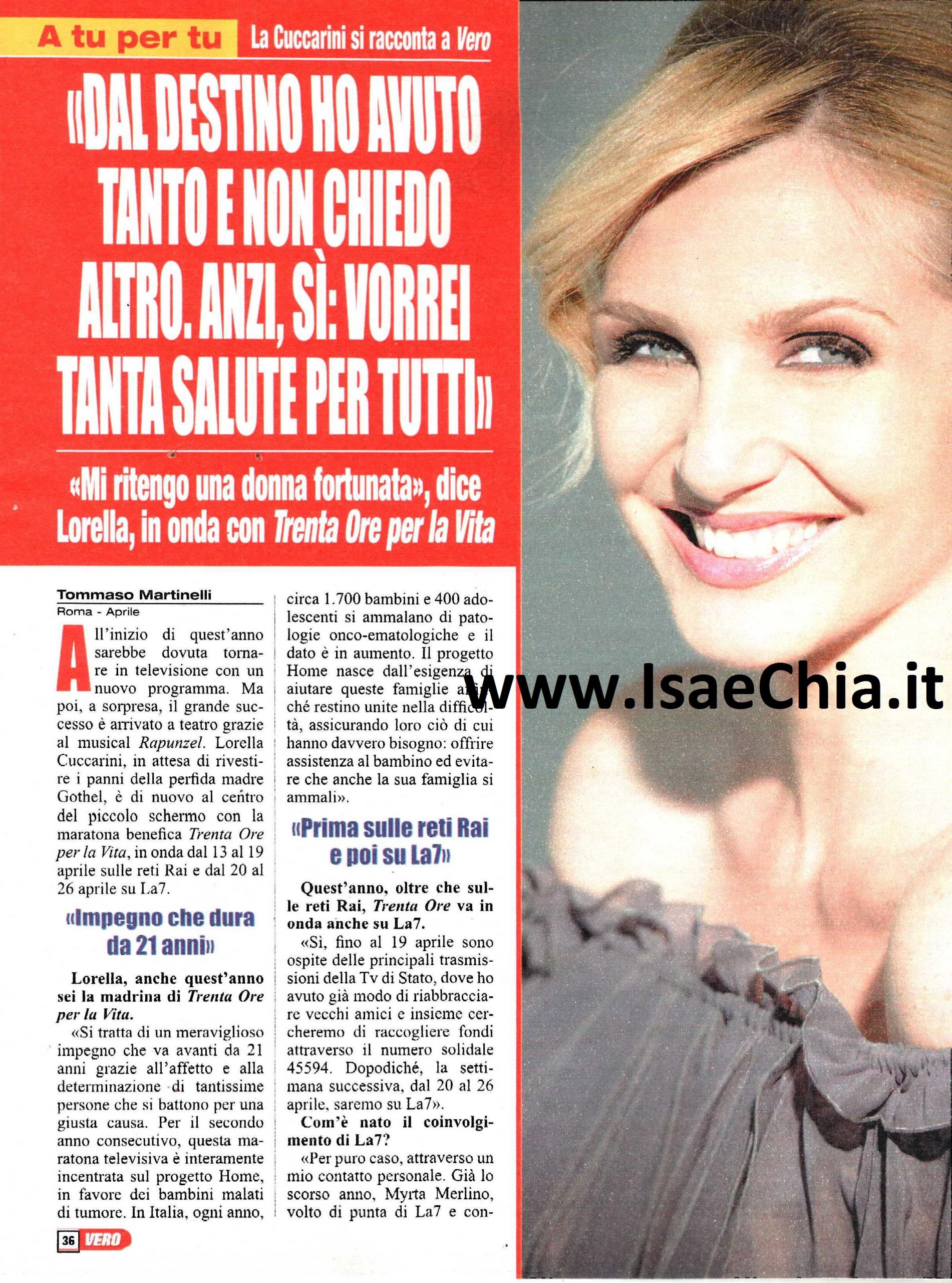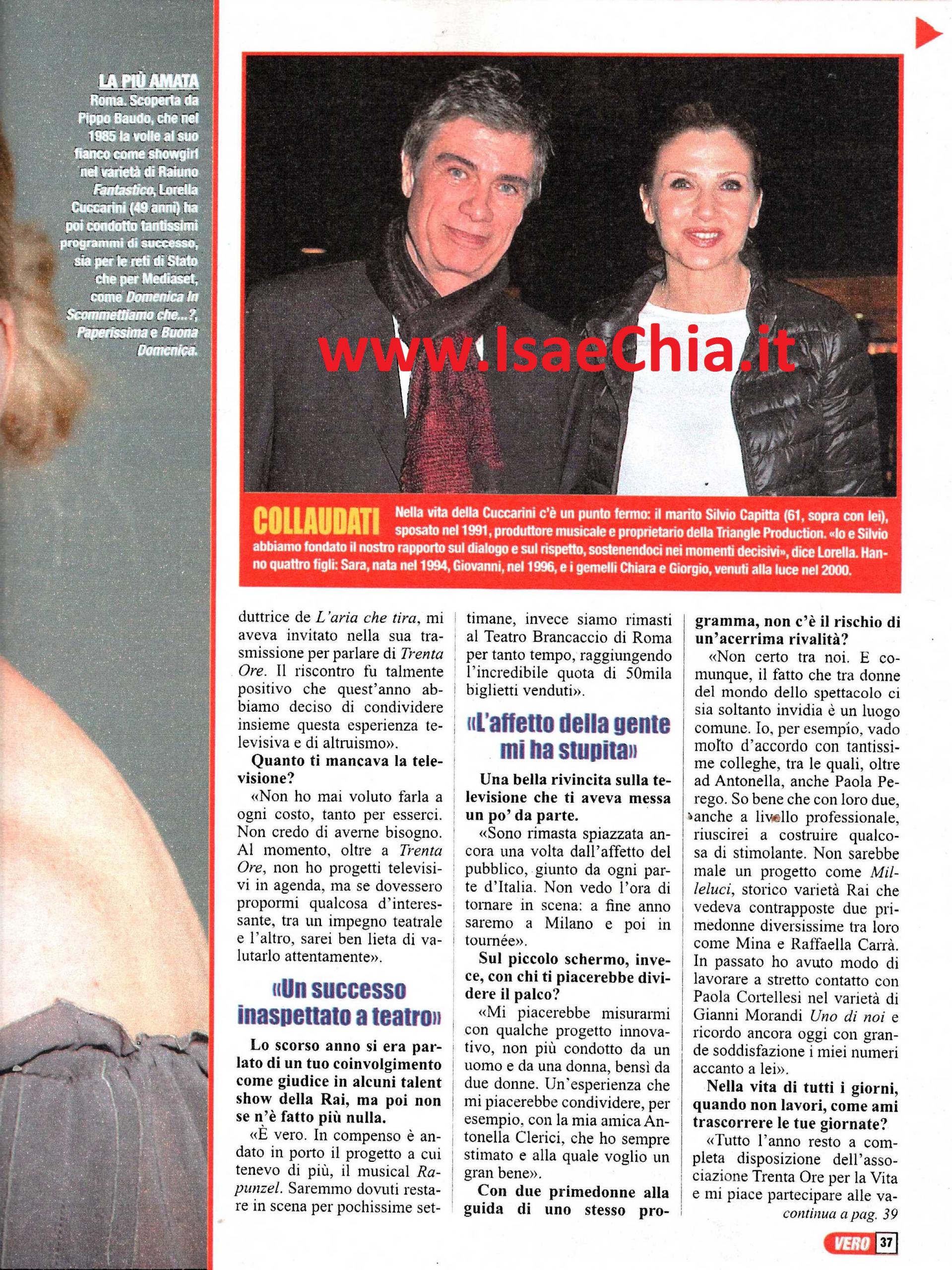 Sarebbe dovuta tornare in tv con Forte forte forte, nella giuria del talent show di Raffaella Carrà, ma un cambio di programma ha tenuto Lorella Cuccarini fuori dalla tv italiana ancora per un po’. Per lei, però, il grande successo quest’anno è arrivato grazie allo spettacolo teatrale Rapunzel, mentre tra poco sarà madrina, come sempre, della maratona benefica Trenta ore per la vita: “Si tratta di un meraviglioso impegno che va avanti da 21 anni e per il secondo anno, questa maratona televisiva è concentrata sul progetto Home, in favore dei bambini malati di tumore. In Italia ogni anno 1700 bambini e 400 adolescenti si ammalano di tumore e Home nasce dall’esigenza di aiutare queste famiglie, offrendo assistenza al bambino ed evitando che anche la sua famiglia si ammali. Fino al 19 aprile sono ospite delle principali tv di stato, dal 20 al 26, invece, saremo su La7, Il coinvolgimento di La7 è nato per puro caso, attraverso un mio contatto personale. Già l’anno scorso Myrta Merlino, volto di punta di La7, mi aveva invitato nella sua trasmissione e il riscontro fu talmente positivo che abbiamo deciso di condividere l’esperienza quest’anno“. Quando le si chiede quanto le mancasse la tv, la “più amata dagli Italiani” risponde: “Non ho mai voluto farla ad ogni costo, tanto per esserci. Non credo di averne bisogno. Non ho altri progetti televisivi in agenda, ma se dovessero propormi qualcosa di interessante, sarei ben lieta di valutarlo. E’ vero, sarei dovuta essere giudice in un talent show della Rai, ma in compenso è andato in porto il progetto a cui tenevo di più, il musical Rapunzel. Siamo rimasti molto a Teatro Brancaccio e abbiamo venduto 50.000 biglietti. Sono rimasta ancora una volta spiazzata dall’affetto del pubblico, giunto da tutta Italia. Non vedo l’ora di tornare in scena: a fine anno saremo a Milano e poi in tournée. Sul piccolo schermo, invece, mi piacerebbe un progetto innovativo, condiviso con un’altra donna, per esempio la mia amica Antonella Clerici. Rivalità? Non certo tra di noi. Io vado molto d’accordo con tantissime colleghe, tra cui anche Paola Perego. So bene che con loro due riuscirei a costruire qualcosa di stimolante. Non sarebbe male un progetto come Milleluci, storico varietà Rai che univa delle primedonne molto diverse tra loro, come Mina e Raffaella Carrà. In passato ho lavorato con Paola Cortellesi e ricordo ancora con soddisfazione i miei numeri insieme a lei“. Chiedendole che moglie e che mamma è, Lorella risponde: “Sono una moglie presente, mai invadente e neppure possessiva. Io e mio marito Silvio Capitta abbiamo sempre fondato il nostro rapporto sul dialogo e il rispetto. Ancora oggi è meraviglioso sentire la voglia di continuare a costruire ogni piccola cosa remando nella stessa direzione. Con i miei figli non sono una mamma amica, ma sempre pronta a sostenerli in ogni momento. Quando il lavoro me lo consente, ad esempio, non mi perdo gli eventi sportivi a cui partecipano: mi piace fare il tifo per i miei figli!“. Infine, notando che il prossimo agosto compirà 50 anni e il prossimo autunno festeggerà i suoi trent’anni di carriera, la Cuccarini commenta: “E’ uno splendido traguardo perché se mi guardo indietro, mi accorgo di aver raccolto tantissime soddisfazioni e aver conosciuto tante persone che si sono rivelate fondamentali. Certo, ho dovuto fare i conti con qualche amarezza, ma fa parte del gioco. Il mio bilancio è positivo, la mia voglia di fare non mi ha abbandonata e il meglio deve ancora venire. Non so ancora come festeggerò il mio 50esimo compleanno, ma so già che sarà una giornata speciale. Ad oggi sono stata fin troppo fortunata e non oserei chiedere nulla più di quello che ho ricevuto. L’unica cosa che auguro per me, per le persone a me care e a tutti in generale è tanta salute“.