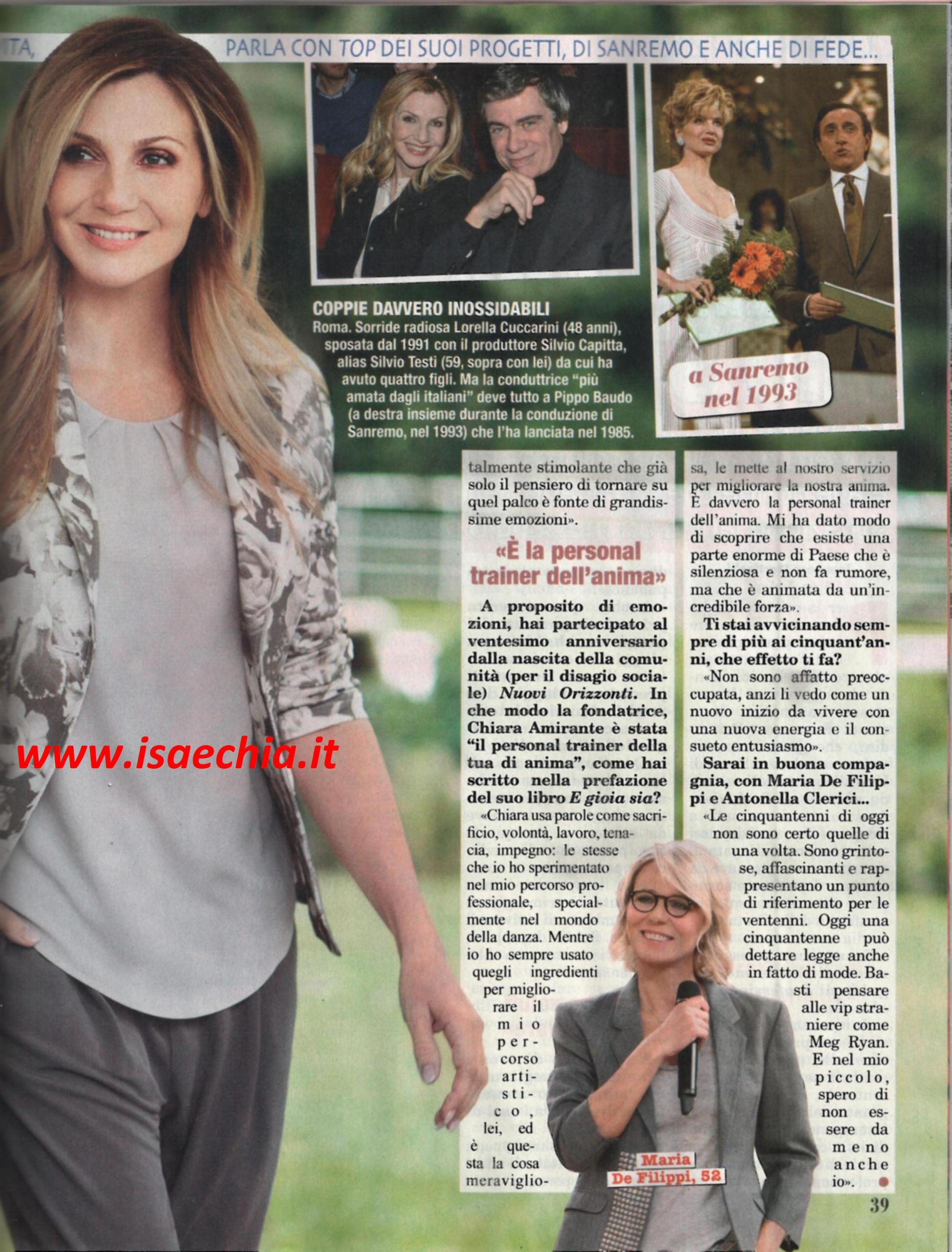 La conduttrice Lorella Cuccarini festeggia un importante compleanno quest’anno: “Il progetto 30 ore per la vita, di cui sono fondatrice, è nato nel 1994, quindi quest’anno compie vent’anni. Puntiamo a realizzare progetti presentati da genitori di bambini e adolescenti malati di cancro, cercando di rimanere a casa propria per evitare che facciano fronte a troppe spese. In occasione del ventesimo compleanno, riabbraccerò il mio collega Marco Columbro: è il modo migliore per festeggiare. Lo faremo su una crociera a tema, con 1700 posti, dove si esibiranno anche Mario Biondi e il maestro Beppe Vessicchio“. Poi, ricordando gli esordi, racconta: “Mettevo per la prima volta piede sul piccolo schermo in uno show del sabato sera, Fantastico. Ho avuto un attimo di buio, ma poi sono ripresa” e poi, parlando di grandi show, commenta il Sanremo di Fabio Fazio e Luciana Littizzetto: “E’ stato piacevole, sobrio e interessante dal punto di vista musicale”. Infine, quando le si chiede che effetto fa avvicinarsi ai 50 anni, risponde: “Non sono affatto preoccupata, li vedo come un nuovo inizio da vivere con nuova energia e il consueto entusiasmo. Le cinquantenni di oggi non sono quelle di una volta. Sono grintose, affascinanti, un punto di riferimento per le ventenni. E nel mio piccolo, spero di esserlo anch’io!”