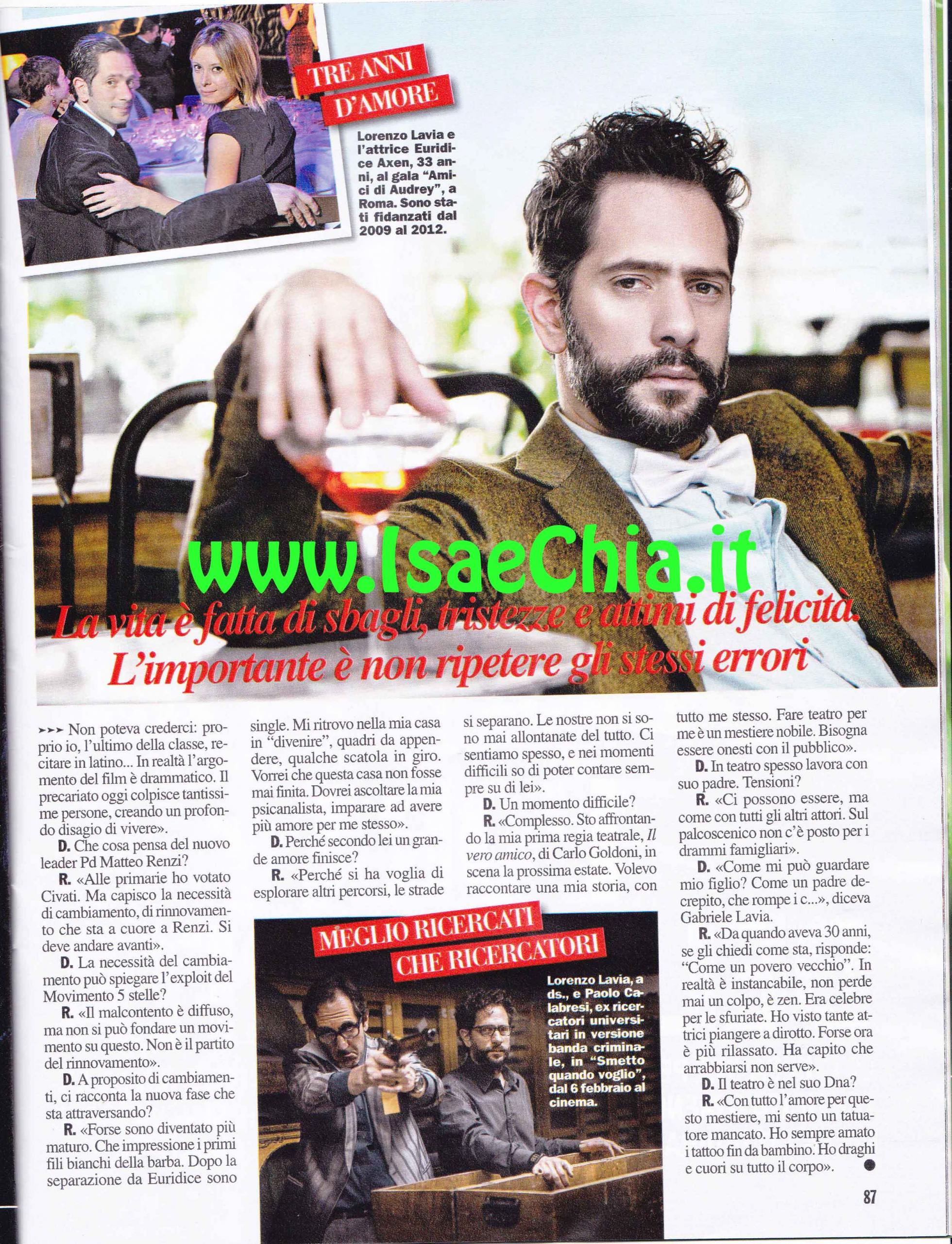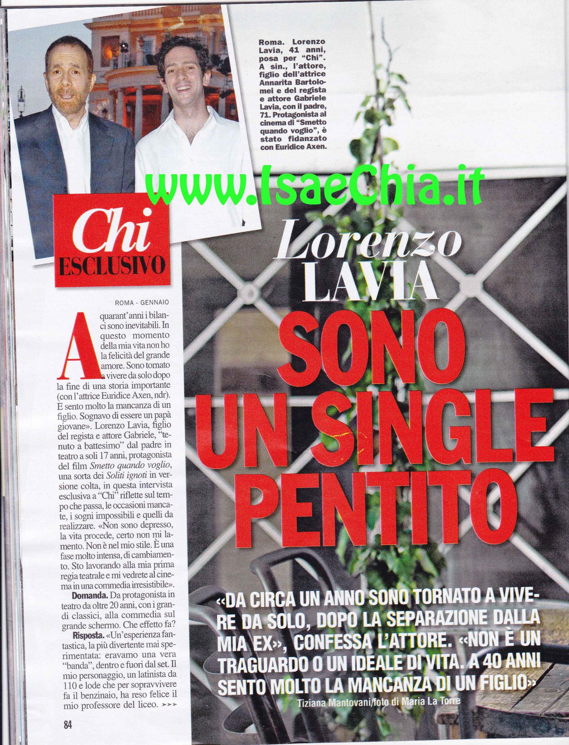 L’attore Lorenzo Lavia, figlio d’arte di Gabriele Lavia e Annarita Bartolomei, fa l’inevitabile bilancio dei 40 anni: “In questo momento della mia vita non ho la felicità del mio grande amore: sono tornato a vivere da solo dopo la fine della storia con l’attrice Euridice Axen. Sognavo di essere un papà giovane. Non sono depresso, non è nel mio stile e la vita procede. E’ un periodo molto intenso, sto lavorando alla mia prima regia teatrale”. Lorenzo, infatti, è da vent’anni attore a teatro, ma ora approda sul grande schermo con una commedia: “E’ stata un’esperienza divertente, eravamo una vera e propria banda. Il mio personaggio è un latinista da 110 e lode: ho reso felice il mio prof del liceo! Non poteva crederci: proprio io, l’ultimo della classe, recitare in latino! In realtà l’argomento del film è drammatico, perché parla del precariato dei giovani”. Dopo aver parlato della situazione economico-politica italiana, parla di sé: “Che impressione i primi fili bianchi della barba. Da quando sono single, mi ritrovo solo in una casa in divenire, che vorrei non fosse mai finita. Forse dovrei imparare la mia psicanalista ed avere più amore per me stesso. Secondo me un grande amore finisce perché si ha voglia di esplorare altre strade. Le nostre non si sono mai allontanate del tutto: ci sentiamo e so di poter contare su di lei”. Infine, parlando del rapporto col padre, col quale lavora a teatro, dice: “Ci possono essere tensioni, come con tutti gli altri attori. Lui era celebre per le sfuriate, ho visto tante attrici piangere. Forse ora è più rilassato e ha capito che arrabbiarsi non serve”.