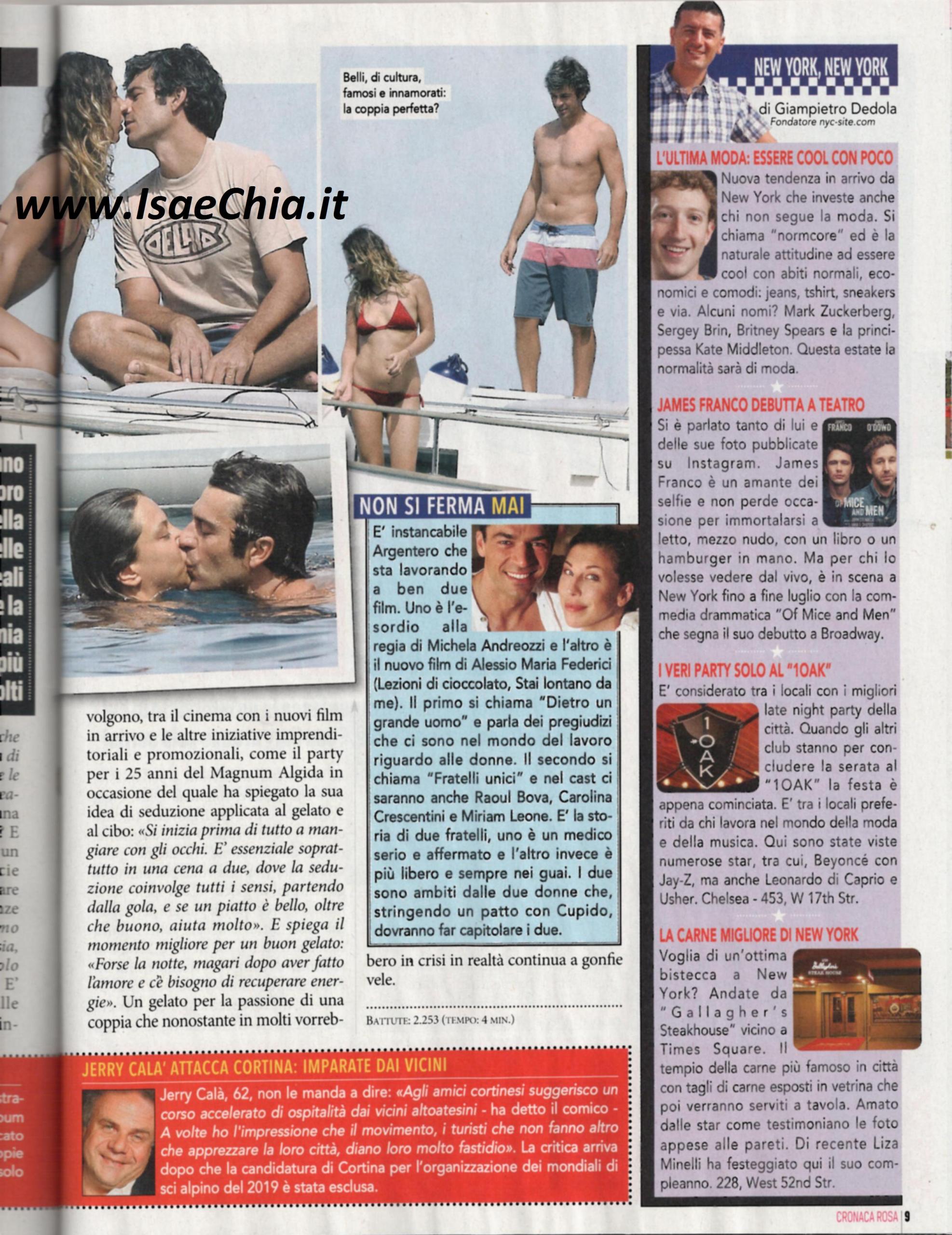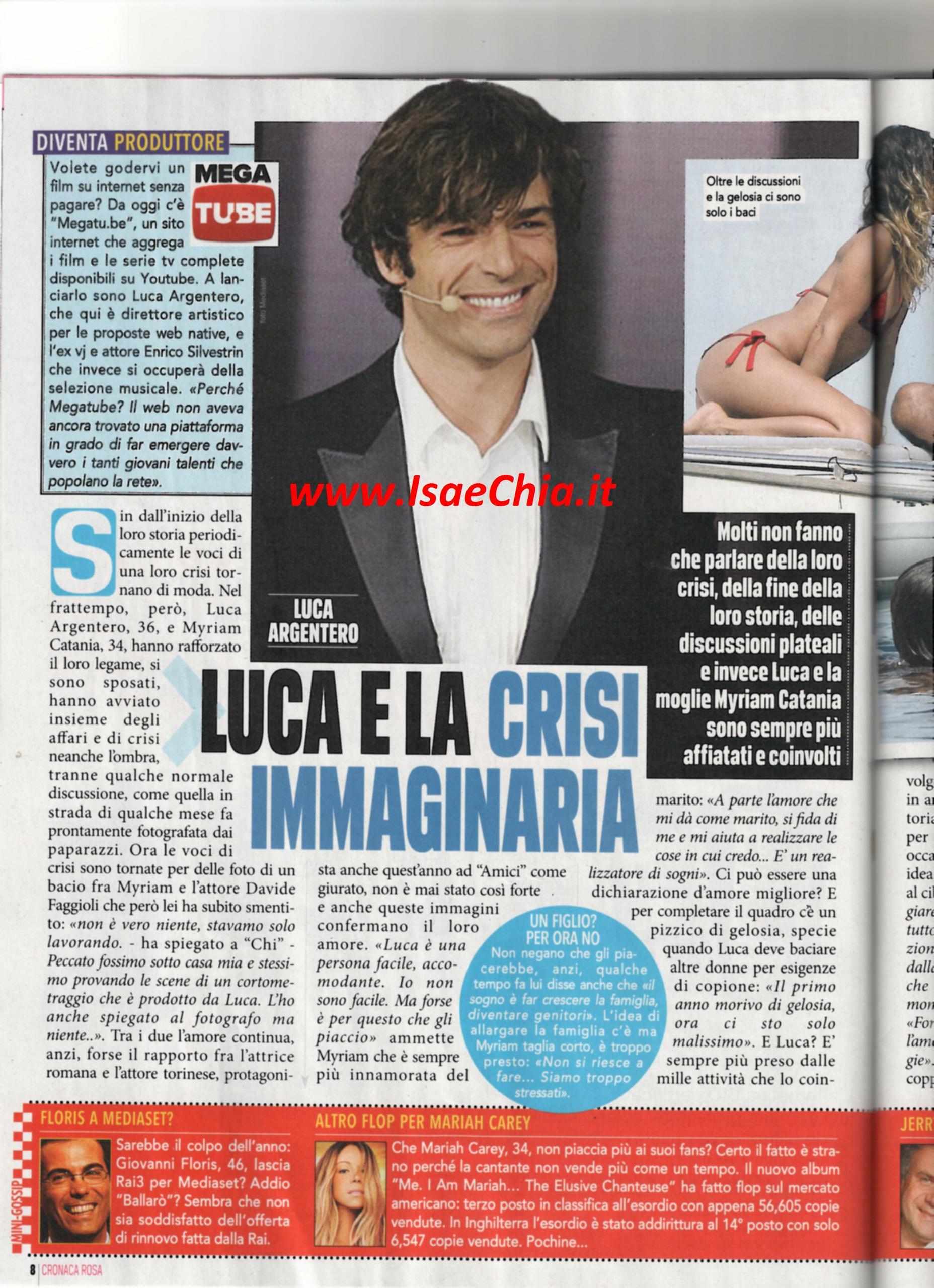 Fin dall’inizio della loro storia, si sono rincorse voci di una crisi tra Luca Argentero e Myriam Catania, recentemente rafforzate dalle foto dei due mentre discutevano e poi da quelle di un bacio di lei con l’attore Davide Faggioli. “Non è vero niente, stavamo lavorando. Eravamo sotto casa mia e stavamo provando un cortometraggio, diretto da Luca. L’ho anche spiegato al fotografo ma niente” ha dichiarato l’attrice. “Luca è una persona facile, accomodante; io non sono facile, ma forse è per questo che gli piaccio. A parte l’amore che mi dà, lui si fida di me e mi aiuta a realizzare i miei sogni”. Quando le si chiede se è gelosa, soprattutto nelle scene in cui bacia le altre, lei risponde: “Il primo anno morivo di gelosia, ora ci sto solo malissimo”. L’ex gieffino, che negli ultimi due anni è stato anche nella giuria di Amici, è infatti impegnato al cinema con nuovi film in arrivo, ma ha anche dei progetti imprenditoriali e promozionali, come il party per i 25 anni della marca di gelati Algida: “Si inizia soprattutto mangiando con gli occhi. E’ essenziale soprattutto in una cena a due, dove si coinvolgono tutti i sensi, partendo dalla gola”. Il momento migliore per mangiare un gelato? “Forse la notte, magari dopo aver fatto l’amore e c’è bisogno di recuperare energie” ha dichiarato lui…A giudicare da queste parole e dalle foto dei baci appassionati che i due si scambiano in vacanza, ora più che mai è difficile parlare di crisi!