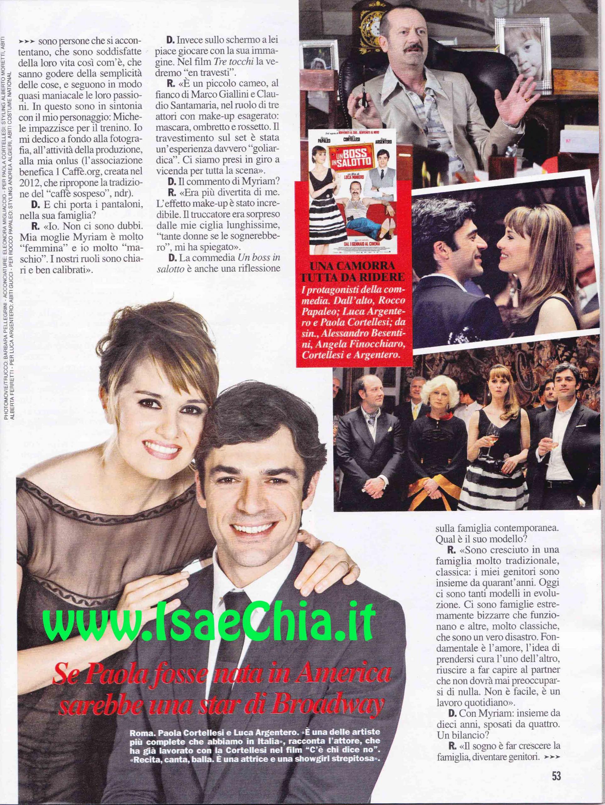 L’attore Luca Argentero sarà nel film Un boss in salotto, in cui interpreta Michele Coso, un uomo…normale. Quando gli si chiede che effetto fa passare da sex symbol a Nerd, risponde: “La mediocrità ha il suo fascino, in fondo. Esiste anche un’accezione positiva del termine. Bill Gates diceva di non prendere in giro i nerd: magari qualcuno di loro sarebbe diventato un uomo di successo in futuro. Ci sono persone che si accontentano, che sono soddisfatte della loro vita così com’è e sanno godersi la semplicità delle cose. In questo sono in sintonia col mio personaggio: lui va pazzo per il trenino, io per la fotografia”. Poi l’ex gieffino si apre un po’ sulla vita privata: “In casa sono io a portare i pantaloni: mia moglie Myriam Catania è molto “femmina” e io molto “maschio”. Sono cresciuto in una famiglia tradizionale, classica: i miei stanno insieme da 40 anni. Ci sono anche famiglie bizzarre che funzionano e altre classiche che sono un disastro: l’amore è fondamentale. Noi sogniamo far crescere la famiglia e diventare genitori. E’ un momento di “costruzione” del nostro futuro. Condividiamo la stessa passione e lo stesso lavoro e abbiamo in progetto un lungometraggio come registi. Per Natale ci dividiamo tra Roma e Torino, per par condicio. Un anno abbiamo invitato tutti i parenti in un piccolo casolare a 90 km da Roma: mi rilassa molto il giardinaggio”. E infine, quando gli si chiede della politica italiana, risponde: “Non saprei chi votare, siamo in balìa degli eventi e credo non sia facile per chi salirà al governo risolvere tanti problemi. Come giovane imprenditore spero che non sia una politica che tema di investire”.