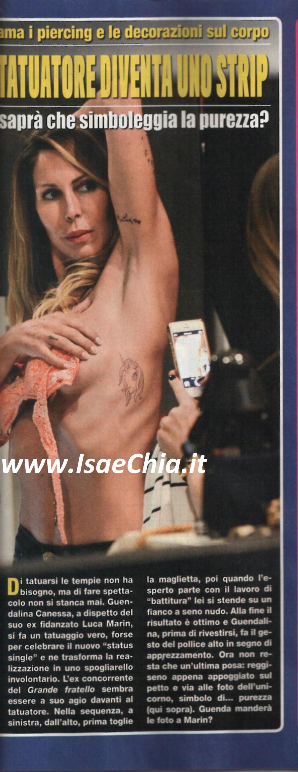 La sorte vuole che in questi giorni anche la gieffina sia stata dal tatuatore: Guenda si spoglia, si stende su un lato e si lascia tatuare. Poi, terminato il lavoro, si alza e dà spettacolo a seno nudo: si fa fotografare con il nuovo tattoo col reggiseno solo appoggiato.