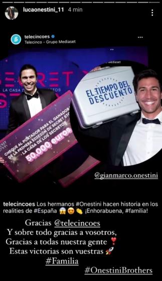 Telecinco, rete in cui vanno in onda tutti questi reality, si è pubblicamente congratulata coi due fratelli ed il post è stato ripreso da Luca nelle sue Instagram Stories: