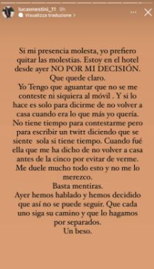 Se la mia presenza disturba, io preferisco eliminare il disturbo. Sono in hotel da ieri, non per mia decisione. Sia chiaro. Devo sopportare che non mi risponda nemmeno al cellulare. E se lo fa è solo per dirmi di non tornare a casa quando era quello che volevo di più. Non ha tempo per rispondermi, ma per scrivere un tweet dicendo che si sente sola ha tempo. Quando è stata lei che mi ha detto di non tornare a casa prima delle cinque per evitare di vedermi. Tutto questo mi fa molto male e non me lo merito. Basta bugie. Ieri abbiamo parlato e abbiamo deciso che non si può continuare così. Che ognuno segua la sua strada e che lo facciamo separatamente. Un bacio.