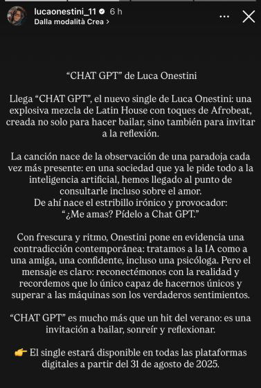 Il brano nasce dall’osservazione di un paradosso sempre più attuale: in una società che già chiede tutto all’intelligenza artificiale, siamo arrivati al punto di consultarla persino sull’amore. Da qui il ritornello ironico e provocatorio: “Mi ami? Chiedi a Chat GPT.” Con freschezza e ritmo, Onestini mette in luce una contraddizione contemporanea: trattiamo l’IA come un’amica, una confidente, persino una psicologa. Ma il messaggio è chiaro: riconnettiamoci con la realtà e ricordiamoci che l’unica cosa capace di renderci unici e di superare le macchine sono i veri sentimenti.