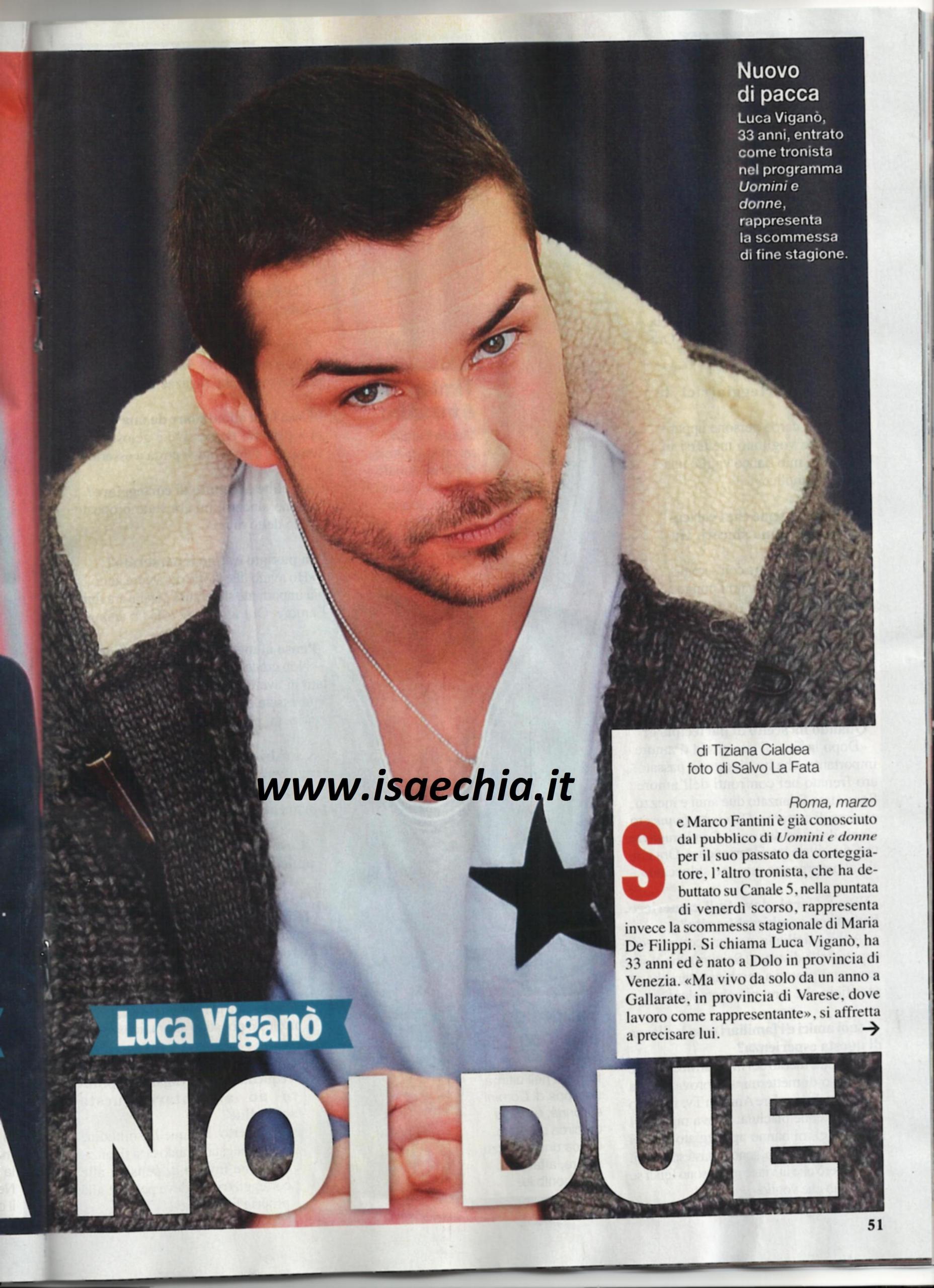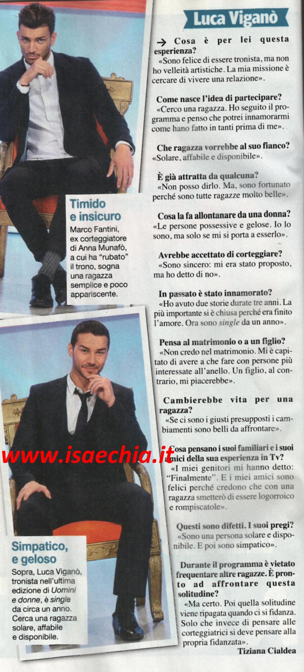 Il nuovo tronista Luca Viganò ha rilasciato le sue prime dichiarazioni, precisando: “Sono felice di essere tronista, ma non ho velleità artistiche. La mia missione è cercare di vivere una relazione: cerco una ragazza. Ho seguito il programma e penso che potrei innamorarmi come hanno fatto tanti prima di me. Cerco una ragazza solare, affabile e disponibile. Sono stato fortunato perché sono tutte ragazze molto belle, ma non posso dire ancora se sono attratto da qualcuna in particolare. Le donne possessive o gelose mi fanno allontanare; io lo sono, ma solo se mi si porta ad esserlo”. Quando gli si chiede se avrebbe accettato di corteggiare una tronista, risponde: “Sono sincero, mi era stato proposto, ma ho rifiutato”. Poi racconta: “Ho avuto due storie durate tre anni. La più importante si è chiusa perché era finito l’amore. Ora sono single da un anno. Non credo al matrimonio: mi è capitato di vedere persone più interessate all’anello! Un figlio, invece, mi piacerebbe. Cambierei la mia vita: se ci sono i presupposti, i cambiamenti sono belli da affrontare. Quando hanno saputo che sarei stato il nuovo tronista, i miei genitori hanno detto “Finalmente”; i miei amici sono contenti perché credono che con una ragazza smetterò di essere logorroico! Sono disposto ad affrontare la solitudine imposta dalle regole del programma: quella solitudine viene ripagata quando ci si fidanza, solo che anziché alle corteggiatrici, si deve pensare alla propria fidanzata!”