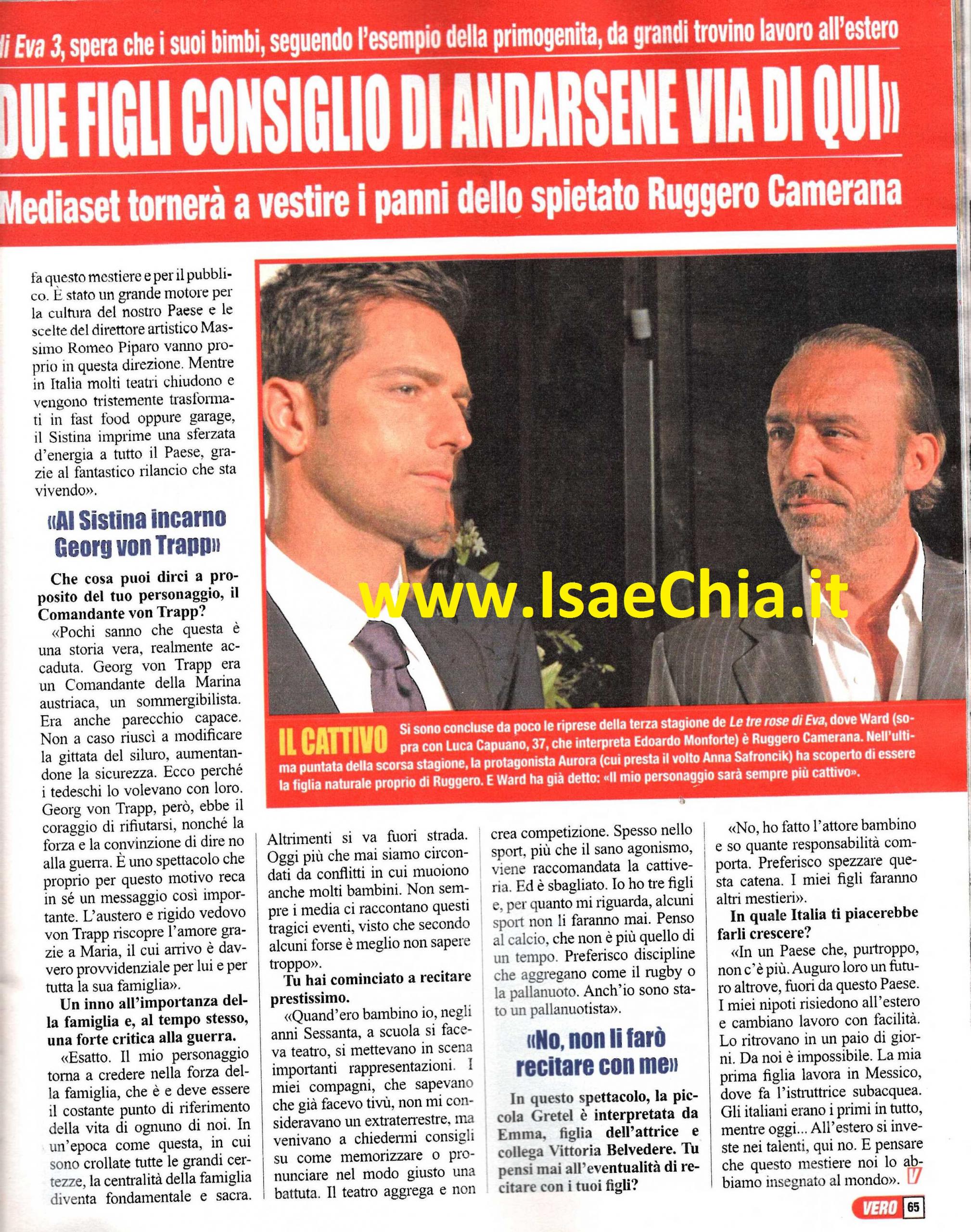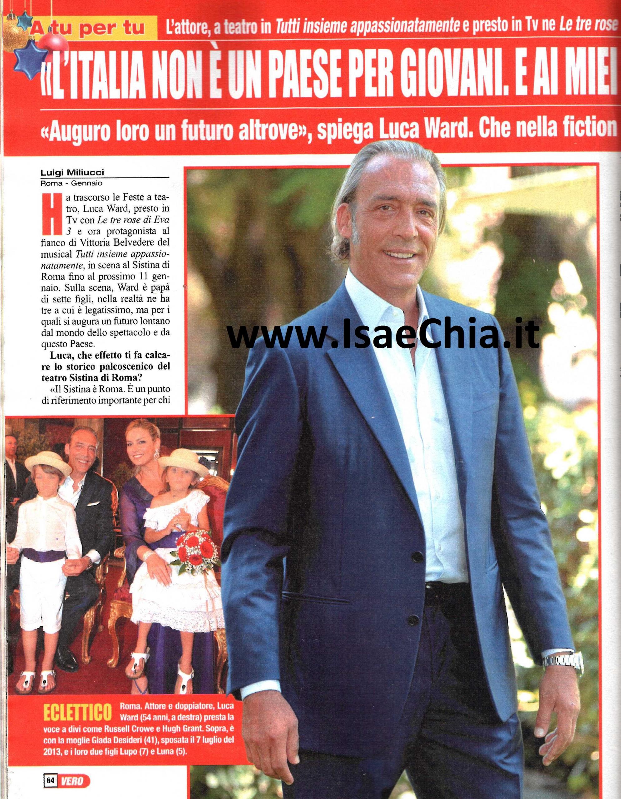 Le grandi fiction faranno presto ritorno su Canale 5 e in Le tre rose di Eva 3 ci sarà ancora Luca Ward, ora anche al fianco di Vittoria Belvedere con Tutti insieme appassionatamente al Teatro Sistina di Roma: “Il Sistina è un punto di riferimento importante per chi fa questo mestiere, un grande motore per la cultura di questo Paese. Mentre in Italia molti teatri chiudono, il Sistina ha dato una sferzata d’energia a tutto il Paese, grazie al periodo di rilancio che sta vivendo. Il mio personaggio, il Comandante Georg von Trapp, è realmente esistito. I tedeschi lo volevano con loro, ma ebbe il coraggio di rifiutarsi, perché contrario alla guerra. Il rigido e austero vedovo ritrova l’amore grazie a Maria, il cui arrivo è provvidenziale per lui e la sua famiglia. Il mio personaggio torna a credere nella famiglia. In un’epoca come questa, dove tutte le certezze sono crollate, la centralità della famiglia è diventata fondamentale e sacra. Oggi più che mai siamo circondati da molti conflitti, dove muoiono molti bambini e non sempre i media raccontano questi tragici eventi“. Quanto alla sua attività d’attore, Luca commenta: “La recitazione aggrega: quando ero piccolo, i miei compagni sapevano che facevo tivù e mi chiedevano consigli su come pronunciare le battute quando c’erano le rappresentazioni a scuola. Il teatro aggrega, non crea competizione. Spesso, invece, nello sport, più che il sano antagonismo, viene raccomandata la cattiveria, ed è sbagliato. Io ho tre figli e per quanto mi riguarda, non faranno mai certi sport: penso al calcio, che non è più quello di una volta. Preferisco il rugby o la pallanuoto, che uniscono: anch’io sono stato pallanuotista“. Infine, notando che sulla scena c’è anche la figlia di Vittoria Belvedere, quando gli si chiede se pensa all’eventualità di recitare con i suoi figli, l’ex naufrago dell’Isola dei famosi risponde: “No, ho fatto l’attore da bambino e so quante responsabilità comporta. Preferisco spezzare questa catena, i miei figli faranno altri mestieri. Auguro loro un futuro altrove, non in un’Italia che non c’è più. I miei nipoti risiedono all’estero e cambiano lavoro con facilità, lo ritrovano in un paio di giorni. Da noi è impossibile. La mia prima figlia vive in Messico e fa l’istruttrice subacquea. All’estero si vive di talenti, qui no. E pensare che questo lo abbiamo insegnato noi al mondo!“.