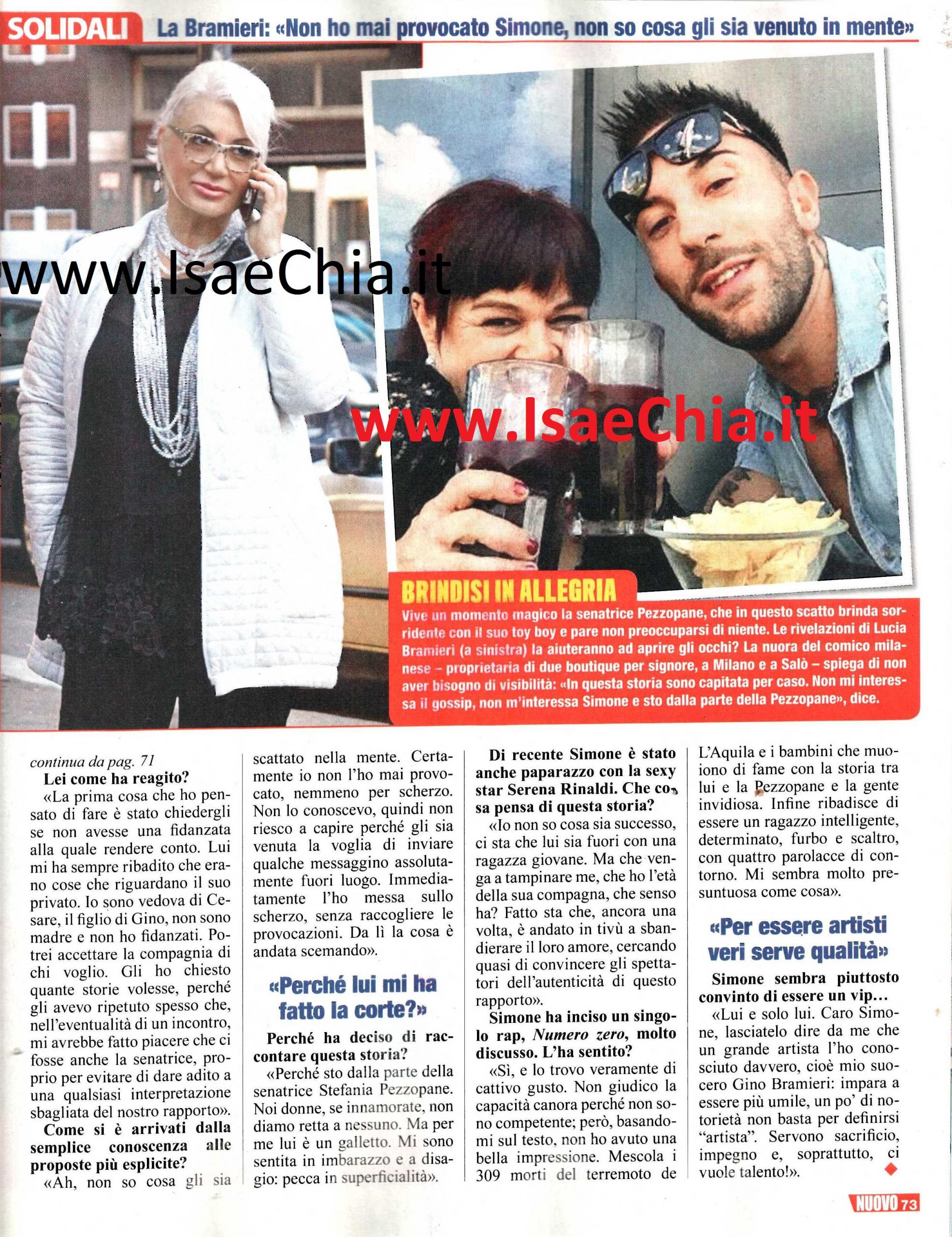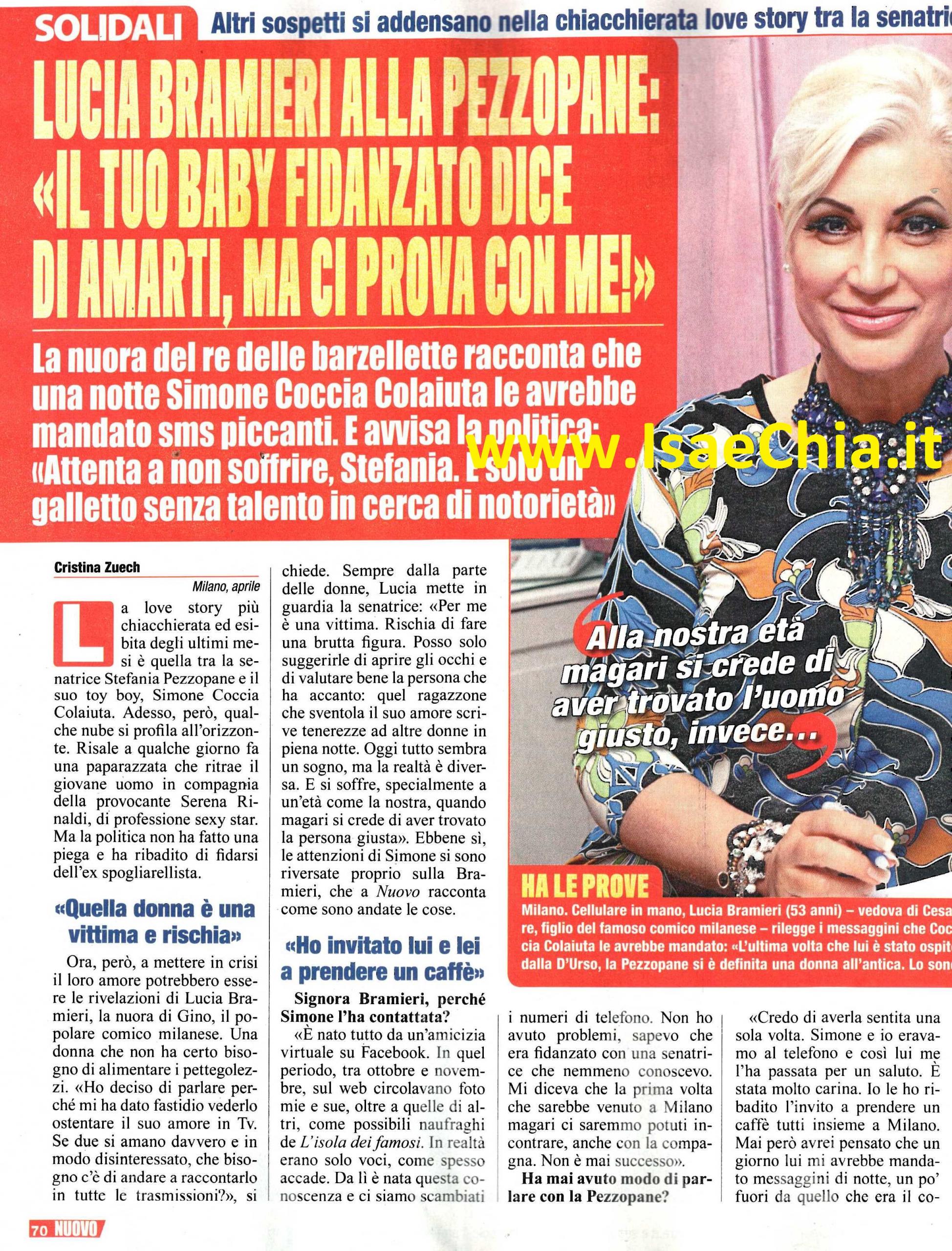 La love story più seguita del momento è quella tra la senatrice Stefania Pezzopane e il suo toy boy Simone Coccia Colaiuta, di oltre vent’anni più giovane di lei. La coppia è apparsa più volte nei salotti di Barbara D’Urso per dimostrare il loro amore a dispetto di tutti coloro che non credevano nella loro storia. Inoltre, lui è stato accusato da Damiano Cioci, vincitore del concorso Il più bello d’Italia di essere raccomandato e di aver ottenuto visibilità mentendo (QUI l’intervista). Ultimamente, inoltre, l’ex corteggiatore di Uomini e Donne è apparso in compagnia della sexy star Serena Rinaldi a Napoli, ma lui ha dichiarato che sono solo amici (QUI per rileggere la notizia). Insomma, questa storia non convince molte persone e per giunta non è finita qui. Lucia Bramieri, nuora di Gino Bramieri, il popolare comico milanese scomparso nel 1996, si è fatta portatrice di un nuovo colpo di scena. “Ho deciso di parlare perché mi ha dato fastidio vederlo ostentare il suo amore in tv. Se due si amano e lo fanno in modo disinteressato, che bisogno c’è di andare a raccontarlo in tutte le trasmissioni?” ha premesso lei. “Per me la Pezzopane è una vittima: quel ragazzone che sventola il suo amore scrive tenerezze ad altre donne nella notte. E si soffre, specialmente ad un’età come la nostra, quando magari si crede di aver trovato la persona giusta” dice lei, che ha 53 anni. “E’ nato tutto con un’amicizia virtuale su Facebook. In quel periodo circolavano foto mie e sue come possibili concorrenti dell’Isola dei famosi, ma in realtà erano solo voci. Da lì è nata questa conoscenza e ci siamo scambiati i numeri di telefono. Non ho avuto problemi, sapevo che era fidanzato con una senatrice che neanche conoscevo. Mi diceva che sarebbe potuto venire a Milano per incontrarci, anche con la compagna, cosa che non è mai successa. Lei l’ho sentita una sola volta: io e Simone eravamo al telefono e così lui me l’ha passata per un saluto. E’ stata molto carina e le ho ribadito l’invito a prendere un caffè tutti insieme a Milano. Mai però avrei pensato che lui mi avrebbe mandato dei messaggini durante la notte, un po’ fuori da quello che era il comune chiacchierare. Una notte mi ha scritto che era solo e che gli sarebbe piaciuto avere la mia compagnia. Mi chiedeva se avrei avuto problemi a farmi pizzicare in una situazione piccante. E vi risparmio tutto il resto. La prima cosa che ho pensato è stato chiedergli se non avesse una fidanzata alla quale rendere conto. Lui mi ha sempre detto che erano cose che riguardavano il suo privato. Io sono vedova di Cesare Bramieri, figlio di Gino, non sono madre e non ho fidanzati. Potrei accettare la compagnia di chi voglio. Gli ho chiesto quante storie volesse, perché gli ho spesso ribadito che parlando dell’eventualità di un incontro, mi avrebbe fatti piacere che fosse presente anche la senatrice, proprio per non dare adito ad un’interpretazione sbagliata del nostro rapporto. Non so cosa gli sia scattato in mente: non l’ho mai provocato, neanche per scherzo. Immediatamente l’ho messa sullo scherzo, senza raccogliere le provocazioni, poi la cosa è andata scemando” racconta lei. Quando le si chiede come mai ha deciso di raccontare questa storia. Lucia risponde: “Perché sto dalla parte della Pezzopane. Noi donne, quando siamo innamorate, non diamo retta a nessuno. Ma per me lui è un galletto; mi sono sentita a disagio e in imbarazzo: pecca di superficialità“. Quando le si chiede, invece, cosa pensa della paparazzata di Simone con la sexy star, risponde: “Non so cosa sia successo, ci sta che esca con una ragazza giovane. Ma che venga a tampinare me, che ho l’età della sua compagna, che senso ha? Fatto sta che ancora una volta è andato in tv a sbandierare il loro amore, cercando di convincere gli spettatori dell’autenticità del rapporto“. Ultimamente, inoltre, Simone ha anche inciso un singolo rap, Numero zero, che la Bramieri commenta così: “Lo trovo veramente di cattivo gusto. Non giudico la capacità canora perché non sono competente, ma basandomi sul testo, non ho avuto una buona impressione. Mescola i 309 morti de L’Aquila con la gente invidiosa della sua storia con la Pezzopane. Infine ibadisce di essere un ragazzo intelligente, con quattro parolacce intorno. Mi sembra molto presuntuosa come cosa“. Infine, quando le si fa notare che lui sembra piuttosto convinto di essere un vip, lei risponde: “Lui e solo lui. Caro Simone, lasciatelo dire da una che un vero artista l’ha conosciuto davvero, cioè mio suocero Gino. Impara ad essere umile, un po’ di notorietà non basta per definirsi artista. Ci vuole sacrificio, impegno e soprattutto…Ci vuole talento!“.