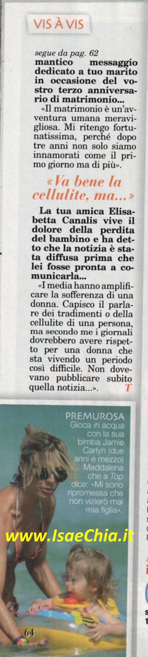 Recentemente Elisabetta Canalis ha rivelato di aver perso il bambino che portava in grembo ancor prima di poter dare la notizia della gravidanza. La sua amica ed ex collega Velina Maddalena Corvaglia ha commentato così: “I media hanno amplificato la sofferenza di una donna. Capisco parlare di tradimenti o di cellulite, ma secondo me i giornali dovrebbero avere rispetto per una donna che sta vivendo un momento così difficile. Non dovevano pubblicare subito la notizia”. E Maddalena sa quanto è bello essere mamma, grazie alla piccola Jamie Carlyn, ed è contenta anche del matrimonio con il chitarrista Stef Burns: “Mi ritengo fortunatissima: il matrimonio è un’avventura umana meravigliosa. Io e Stef siamo sposati da tre anni e ci amiamo più del primo giorno”. Dopo esser uscita vincitrice dal programma Si può fare, la Corvaglia è ora conduttrice di Una voce per Padre Pio su Raiuno: “Sono stata in Africa e ho visto cosa hanno saputo fare la generosità degli Italiani e l’Onlus Una voce per Padre Pio. Non dimenticherò mai quei bambini; sono tornata cambiata e mi sono promessa che non avrei mai viziato mia figlia. Anche nel nostro Paese ci sono tante famiglie in difficoltà, ma molti si lamentano perché non hanno il superfluo. Se andassero in Africa, smetterebbero di lamentarsi. Mi piacerebbe adottare qualche bambino a distanza, in modo da poterli aiutare e di dare a mia figlia un “fratellino speciale”. Essendo pugliese, conoscevo la storia di Padre Pio sin da piccola ed ero orgogliosa che fosse mio conterraneo. Era un uomo forte e proprio per questo la gente lo sentiva vicino. Mia madre è stata tante volte da lui…E probabilmente, data la mia passione per le moto, lo avrà pregato tante volte di farmi mettere la testa a posto!”