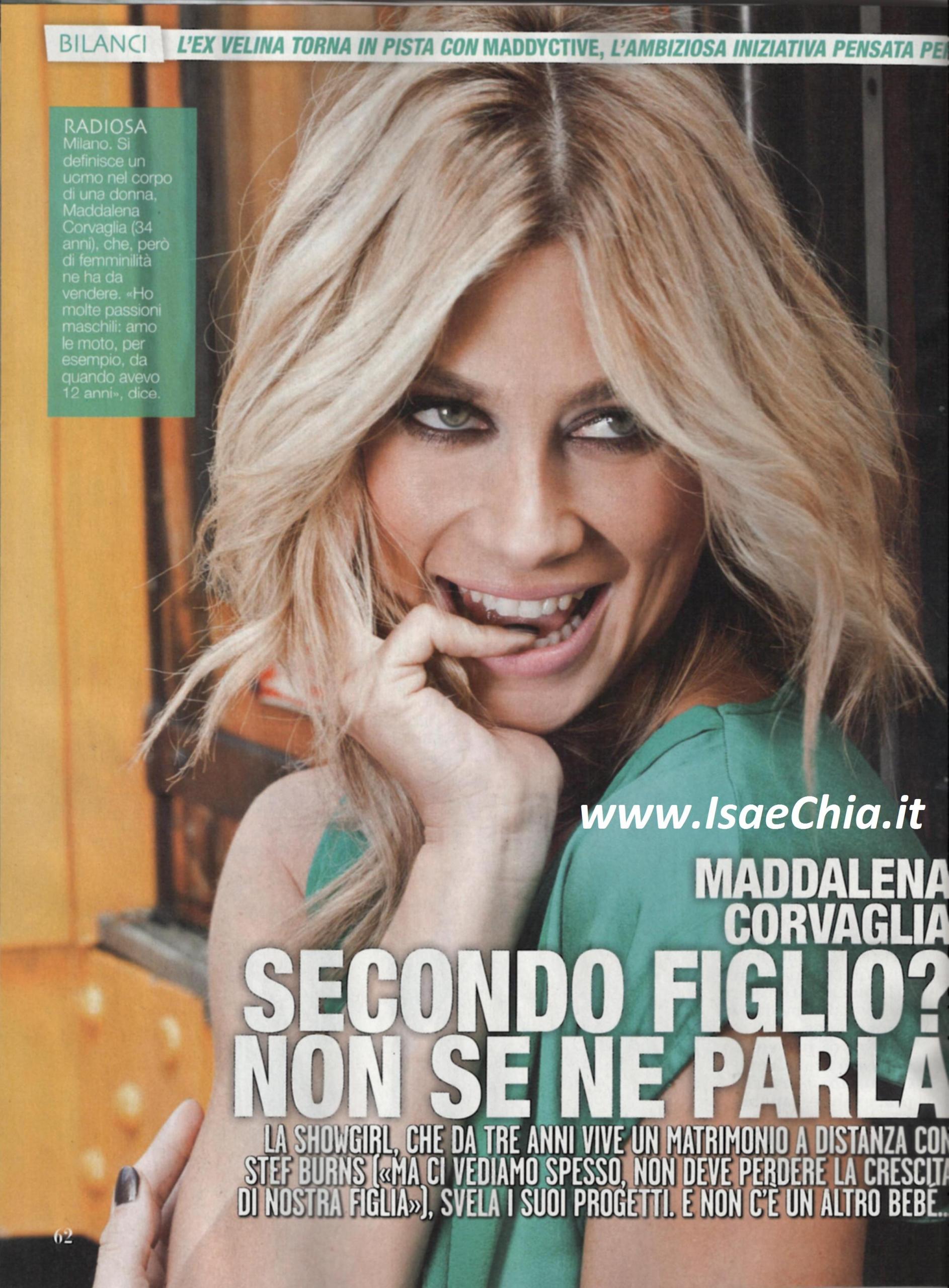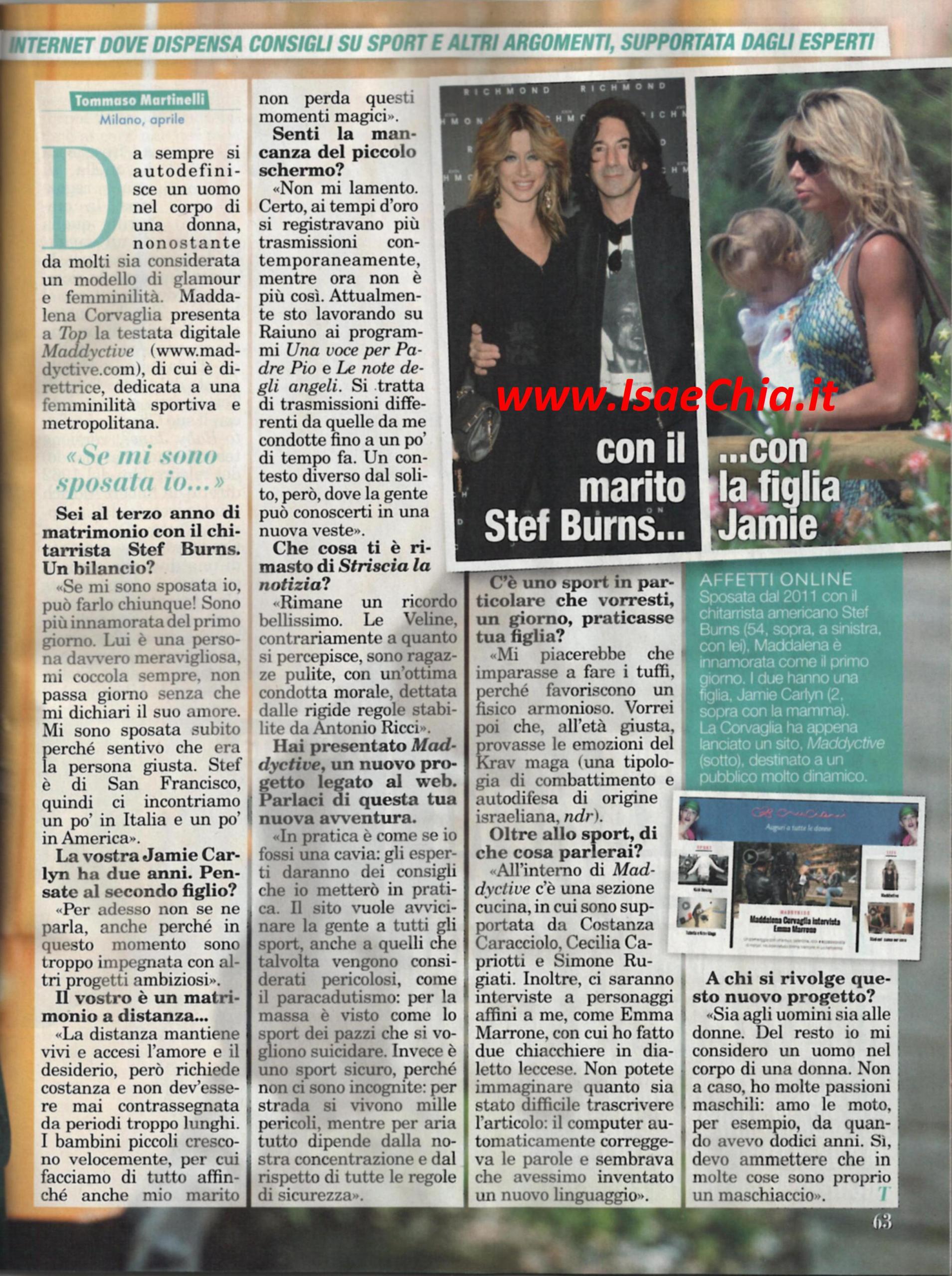 L’ex Velina Maddalena Corvaglia fa un bilancio del suo matrimonio con il chitarrista Stef Burns, giunto ormai al terzo anno: “Se mi sono sposata io, può farlo chiunque. Sono più innamorata del primo giorno: lui è una persona meravigliosa, mi coccola sempre e mi dichiara il suo amore ogni giorno. Mi sono sposata subito perché sentivo che era la persona giusta. Lui è di San Francisco, così viviamo tra l’Italia e l’America. La distanza mantiene acceso il desiderio ma non deve essere contrassegnata da periodi troppo lunghi. I bambini crescono velocemente e facciamo di tutto affinché non perda i momenti magici di Jamie Carlyn. Un altro figlio? Per il momento non se ne parla, anche perché sono impegnata con dei progetti ambiziosi. Sono su RaiUno con Una voce per Padre Pio e Le note degli angeli, due trasmissioni diverse da quelle fatte finora, ma che permettono di farmi vedere anche in altre vesti. Poi ho un nuovo progetto legato al web, che si chiama Maddyctive. E’ come se fossi una cavia: gli esperti danno dei consigli e io li metto in pratica. Il sito vuole avvicinare la gente a tutti gli sport, anche quelli considerati pericolosi, come il paracadutismo, che contrariamente a quanto si creda, è uno sport sicuro. Poi c’è una sezione cucina, supportata da un’altra ex Velina, Costanza Caracciolo, da Cecilia Capriotti, che ha partecipato con me a Jump, e lo chef Simone Rugiati. Inoltre, ci saranno interviste a personaggi a me affini, come Emma Marrone, on cui ho fatto due chiacchiere in dialetto leccese: non potete immaginare come sia stato difficile trascrivere l’articolo! Il mio progetto si rivolge sia a uomini che a donne. D’altronde, io mi considero un uomo nel corpo di una donna: amo le moto da quando avevo 12 anni e sono proprio un maschiaccio!”